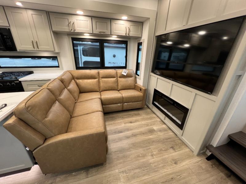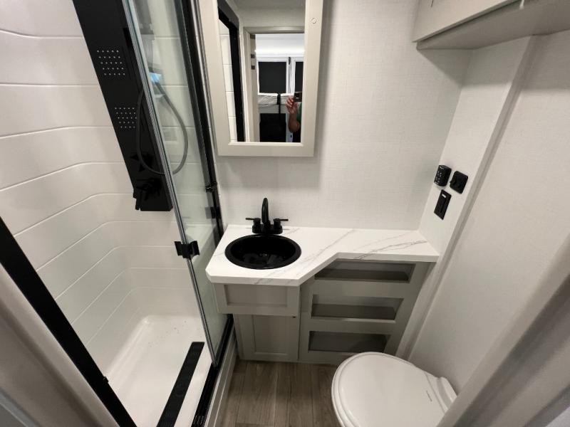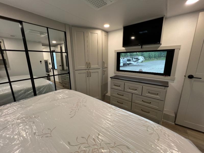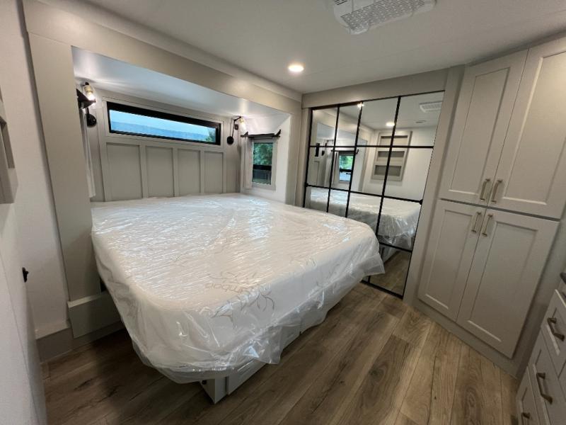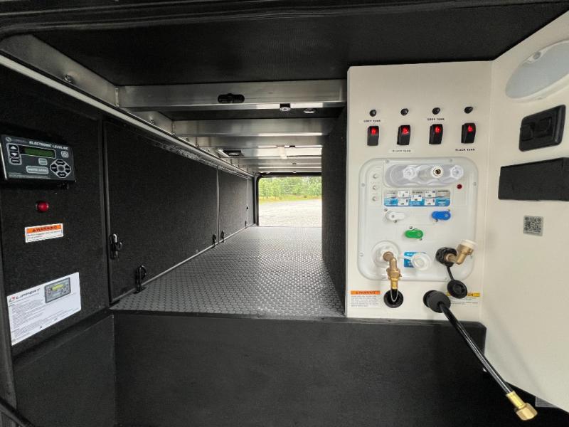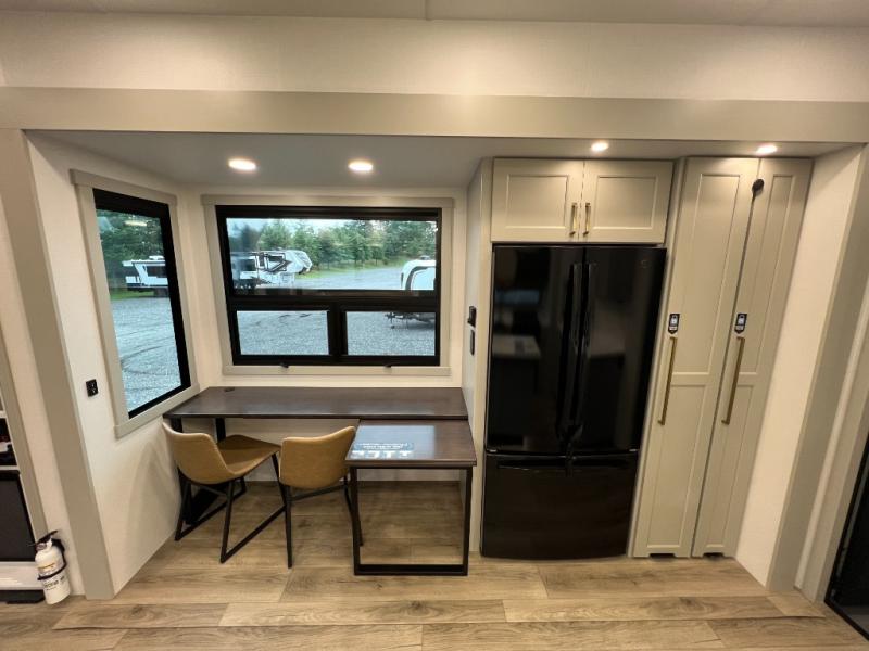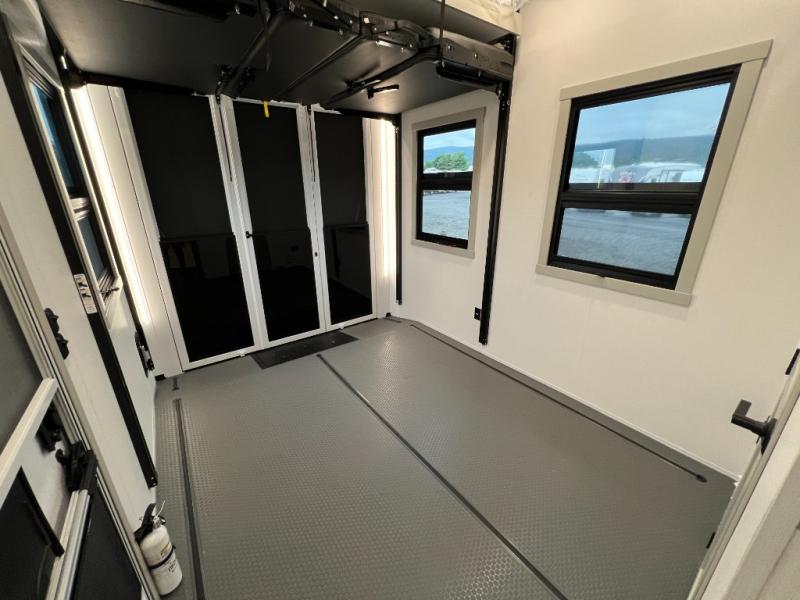 Whether you use this toy hauler to haul your favorite ride-on toys or as a mobile office, you're sure to love every inch of it! The 14' separate garage includes a Fold-N-Stow table and independent dual sofas, along with a full bath and a loft/storage with a twin bed for more sleeping space. The middle kitchen is every chef's dream with its GE appliances, kitchen island, and convenient features, such as pull-out trash bins and a cutting board, a pull-down knife rack and utensil tray, and a pull-out pantry/utility closet! Right next to the kitchen is the living room with a L-sofa with four modes, a 65" Phillips Smart TV and a fireplace, plus a convertible dining table/L-desk where you can dine or get some work done. You'll love the second full bath up front close to the private bedroom, and here, you'll find a king bed slide out, under-bed storage drawers and motion lights, a walk-in closet with cordless vacuum prep, and a sliding dresser top with hidden storage for valuables. There is also washer and dryer prep in the bedroom and garage, making this toy hauler full-time capable!