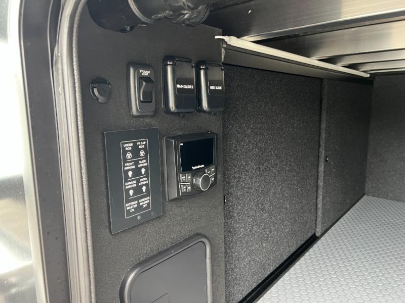 With any Model G toy hauler fifth wheel by Brinkley you will enjoy luxurious amenities, tons of storage space, and innovative features that have been developed and tested in the real world. Durable construction includes an industry leading PDI process, an industry best insulation package, and reinforced and walkable slide roofs. Some of the exterior features you'll find are a 3-way pass-through with a multi-functional flip-up bulkhead wall, under I-beam storage, a MAX-Vision reverse lighting system, and a low-maintenance roof to name a few. A Rockford Fosgate audio system comes standard, along with a OneControl app system that lets you control your fifth wheel's functions right from your mobile device. You will find the solar system with a designated storage area to be ultra convenient, plus there is a FlexPower 5500 with a dual fuel inverter generator for all your power needs. Head inside to find a residential interior with Brinkley's CraftSense wood trim construction, floating entrance steps, integrated window screens and insulated blackout blinds, and residential solid surface countertops plus backsplash. You will also enjoy the neon shower lighting and recessed medicine cabinets in the bath, plus motion activated LED bed lights and dual bedside outlets in the bedroom. Choose a Model G toy hauler fifth wheel to experience all the luxury it has to offer!