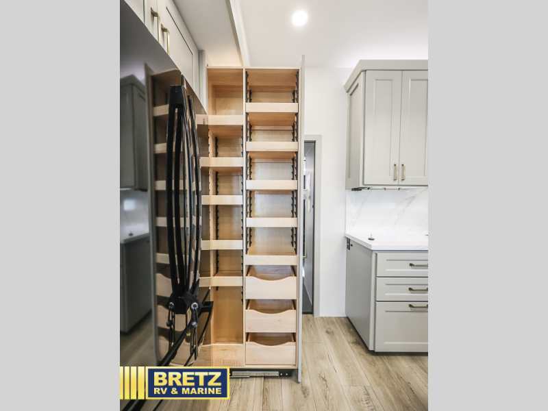 Whether you use this toy hauler to haul your favorite ride-on toys or as a mobile office, you're sure to love every inch of it! The 14' separate garage includes a Fold-N-Stow table and independent dual sofas, along with a full bath and a loft/storage with a twin bed for more sleeping space. The middle kitchen is every chef's dream with its GE appliances, kitchen island, and convenient features, such as pull-out trash bins and a cutting board, a pull-down knife rack and utensil tray, and a pull-out pantry/utility closet! Right next to the kitchen is the living room with a L-sofa with four modes, a 65" Phillips Smart TV and a fireplace, plus a convertible dining table/L-desk where you can dine or get some work done. You'll love the second full bath up front close to the private bedroom, and here, you'll find a king bed slide out, under-bed storage drawers and motion lights, a walk-in closet with cordless vacuum prep, and a sliding dresser top with hidden storage for valuables. There is also washer and dryer prep in the bedroom and garage, making this toy hauler full-time capable!