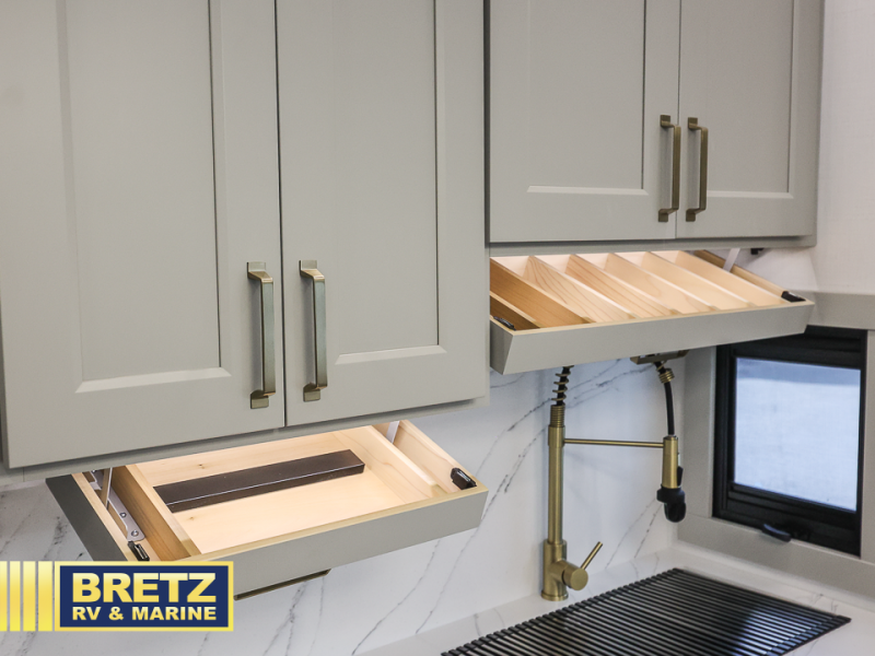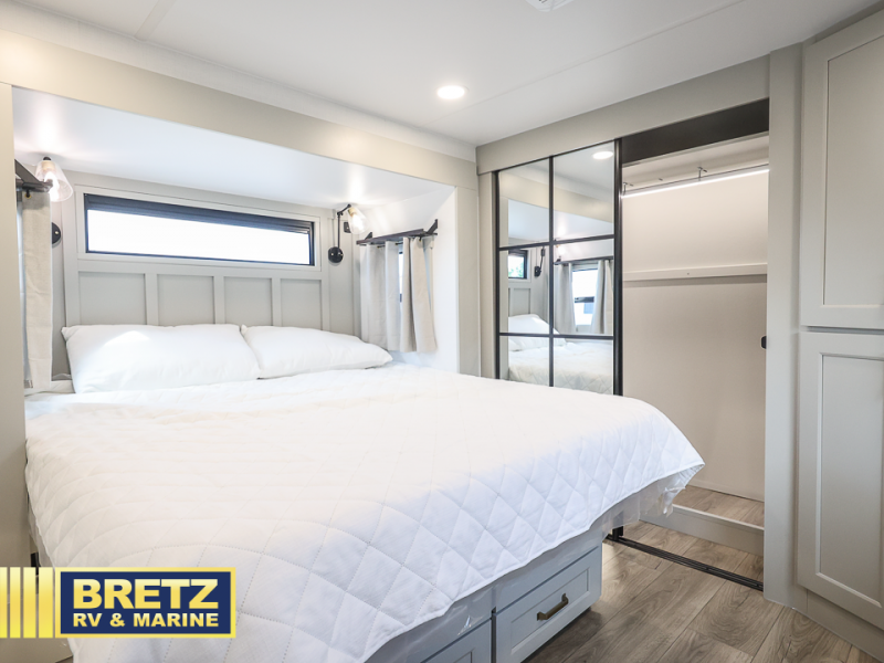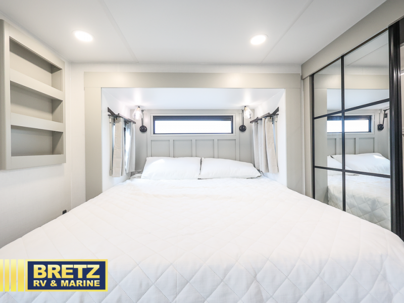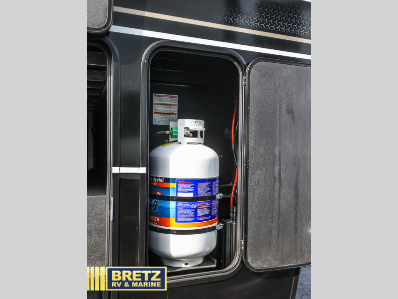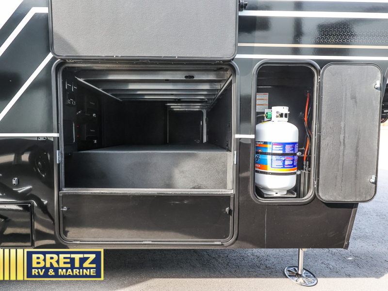 With any Model G toy hauler fifth wheel by Brinkley you will enjoy luxurious amenities, tons of storage space, and innovative features that have been developed and tested in the real world. Durable construction includes an industry leading PDI process, an industry best insulation package, and reinforced and walkable slide roofs. Some of the exterior features you'll find are a 3-way pass-through with a multi-functional flip-up bulkhead wall, under I-beam storage, a MAX-Vision reverse lighting system, and a low-maintenance roof to name a few. A Rockford Fosgate audio system comes standard, along with a OneControl app system that lets you control your fifth wheel's functions right from your mobile device. You will find the solar system with a designated storage area to be ultra convenient, plus there is a FlexPower 5500 with a dual fuel inverter generator for all your power needs. Head inside to find a residential interior with Brinkley's CraftSense wood trim construction, floating entrance steps, integrated window screens and insulated blackout blinds, and residential solid surface countertops plus backsplash. You will also enjoy the neon shower lighting and recessed medicine cabinets in the bath, plus motion activated LED bed lights and dual bedside outlets in the bedroom. Choose a Model G toy hauler fifth wheel to experience all the luxury it has to offer!