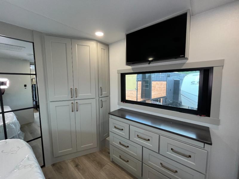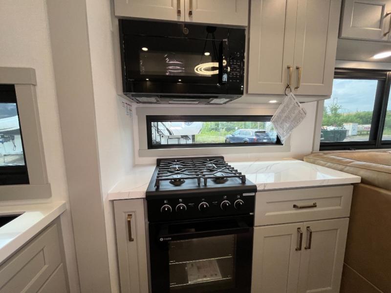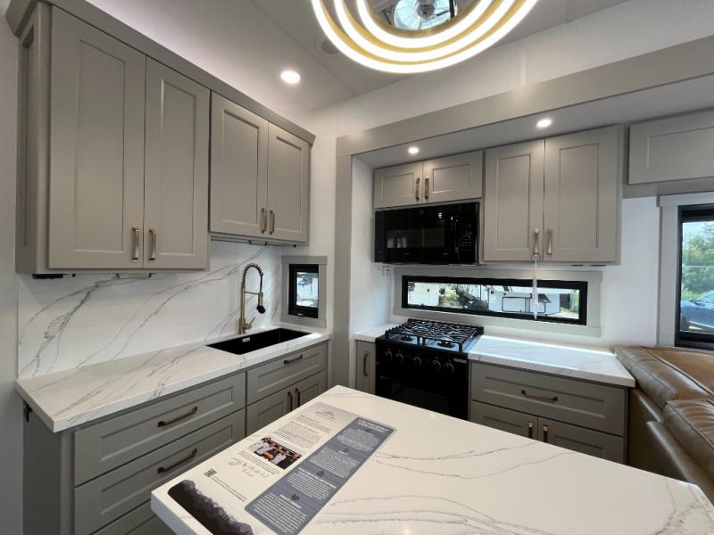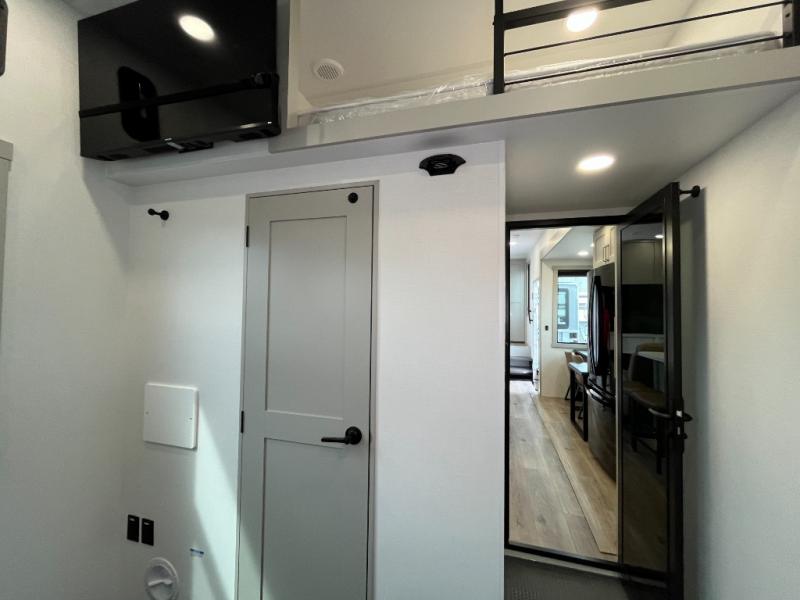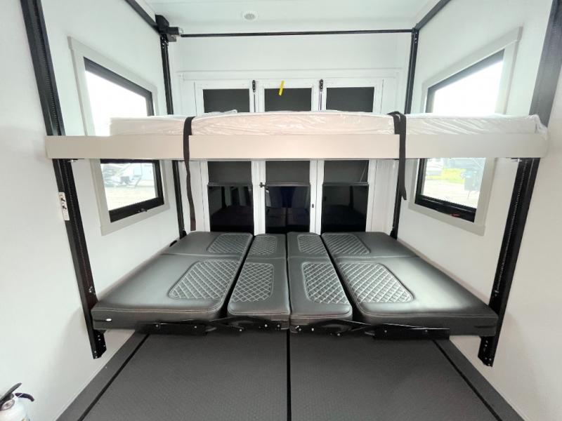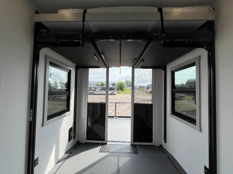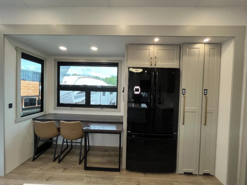 Whether you use this toy hauler to haul your favorite ride-on toys or as a mobile office, you're sure to love every inch of it! The 14' separate garage includes a Fold-N-Stow table and independent dual sofas, along with a full bath and a loft/storage with a twin bed for more sleeping space. The middle kitchen is every chef's dream with its GE appliances, kitchen island, and convenient features, such as pull-out trash bins and a cutting board, a pull-down knife rack and utensil tray, and a pull-out pantry/utility closet! Right next to the kitchen is the living room with a L-sofa with four modes, a 65" Phillips Smart TV and a fireplace, plus a convertible dining table/L-desk where you can dine or get some work done. You'll love the second full bath up front close to the private bedroom, and here, you'll find a king bed slide out, under-bed storage drawers and motion lights, a walk-in closet with cordless vacuum prep, and a sliding dresser top with hidden storage for valuables. There is also washer and dryer prep in the bedroom and garage, making this toy hauler full-time capable!