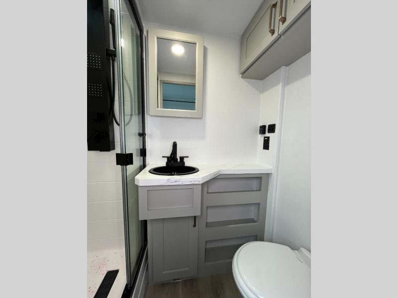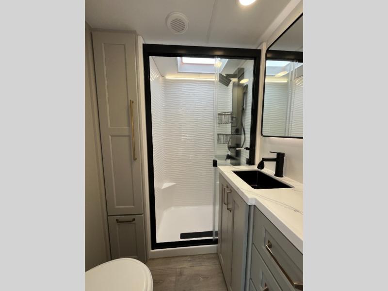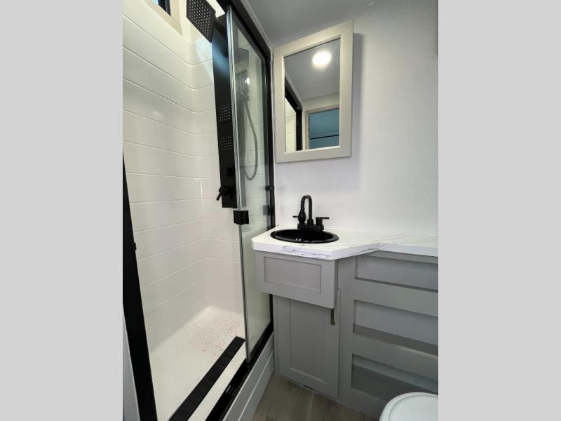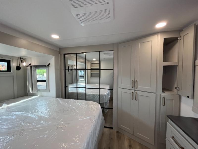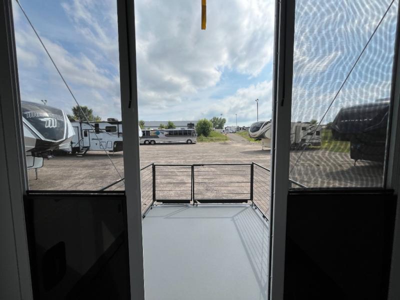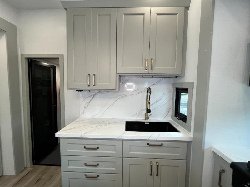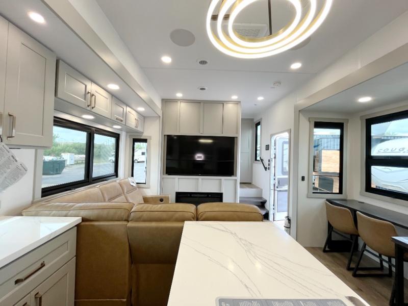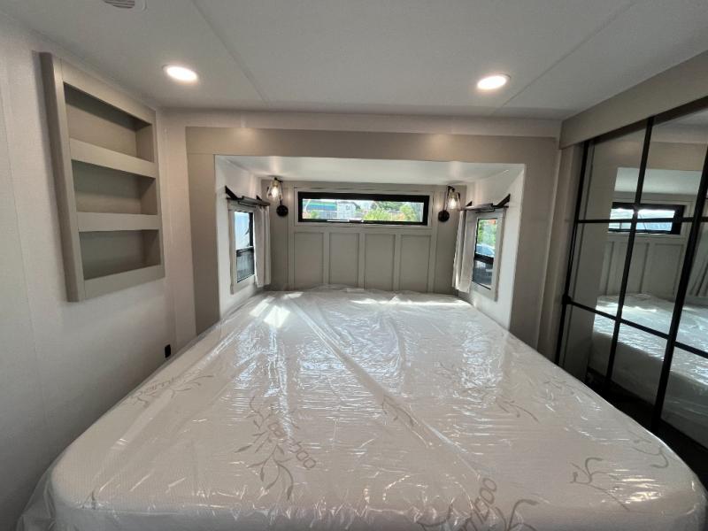 Whether you use this toy hauler to haul your favorite ride-on toys or as a mobile office, you're sure to love every inch of it! The 14' separate garage includes a Fold-N-Stow table and independent dual sofas, along with a full bath and a loft/storage with a twin bed for more sleeping space. The middle kitchen is every chef's dream with its GE appliances, kitchen island, and convenient features, such as pull-out trash bins and a cutting board, a pull-down knife rack and utensil tray, and a pull-out pantry/utility closet! Right next to the kitchen is the living room with a L-sofa with four modes, a 65" Phillips Smart TV and a fireplace, plus a convertible dining table/L-desk where you can dine or get some work done. You'll love the second full bath up front close to the private bedroom, and here, you'll find a king bed slide out, under-bed storage drawers and motion lights, a walk-in closet with cordless vacuum prep, and a sliding dresser top with hidden storage for valuables. There is also washer and dryer prep in the bedroom and garage, making this toy hauler full-time capable!