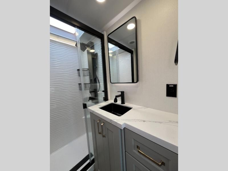 With any Model G toy hauler fifth wheel by Brinkley you will enjoy luxurious amenities, tons of storage space, and innovative features that have been developed and tested in the real world. Durable construction includes an industry leading PDI process, an industry best insulation package, and reinforced and walkable slide roofs. Some of the exterior features you'll find are a 3-way pass-through with a multi-functional flip-up bulkhead wall, under I-beam storage, a MAX-Vision reverse lighting system, and a low-maintenance roof to name a few. A Rockford Fosgate audio system comes standard, along with a OneControl app system that lets you control your fifth wheel's functions right from your mobile device. You will find the solar system with a designated storage area to be ultra convenient, plus there is a FlexPower 5500 with a dual fuel inverter generator for all your power needs. Head inside to find a residential interior with Brinkley's CraftSense wood trim construction, floating entrance steps, integrated window screens and insulated blackout blinds, and residential solid surface countertops plus backsplash. You will also enjoy the neon shower lighting and recessed medicine cabinets in the bath, plus motion activated LED bed lights and dual bedside outlets in the bedroom. Choose a Model G toy hauler fifth wheel to experience all the luxury it has to offer!