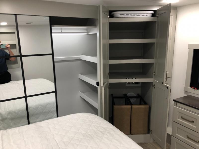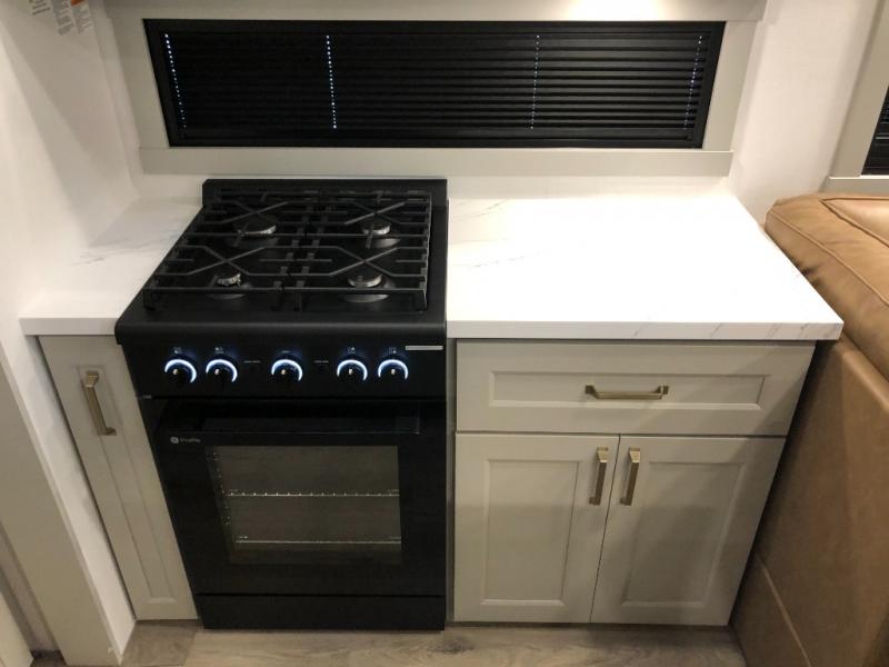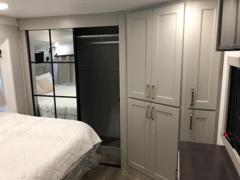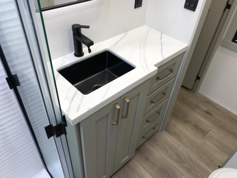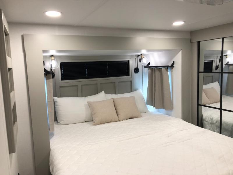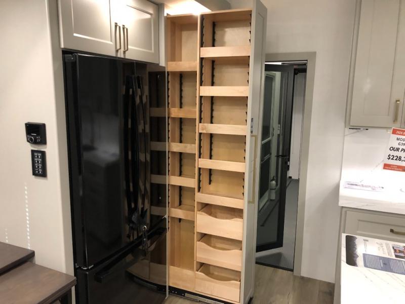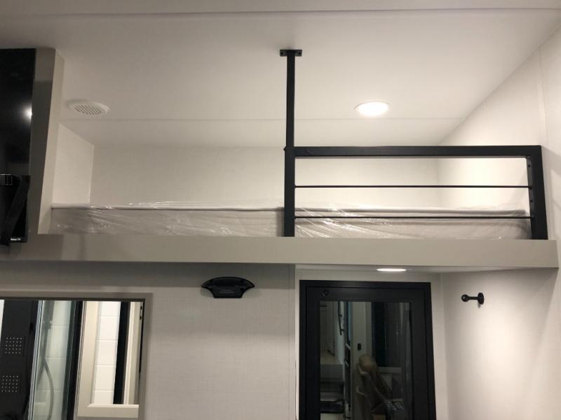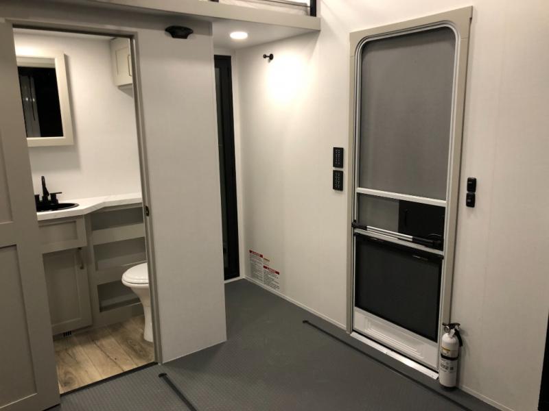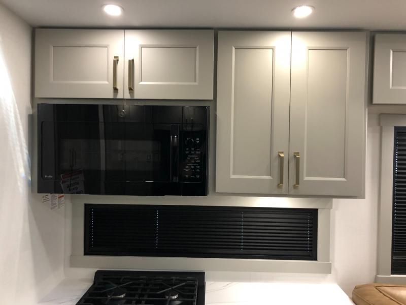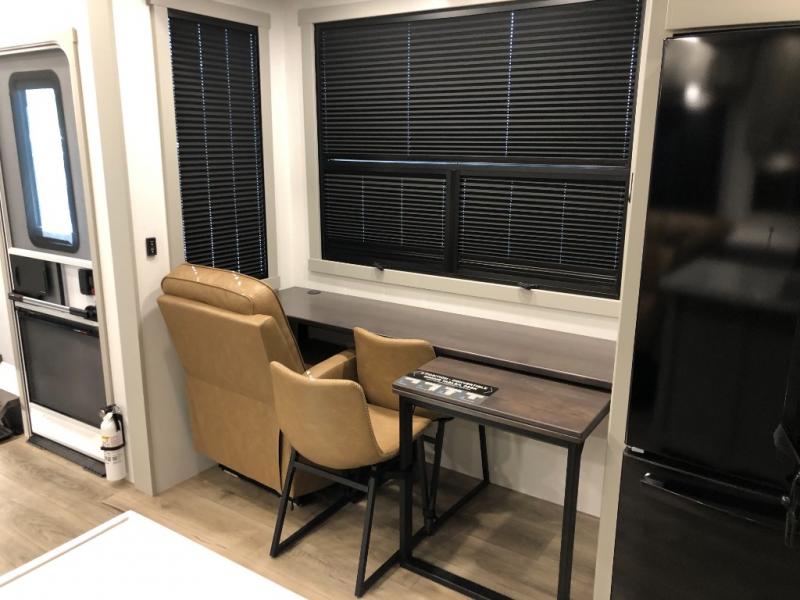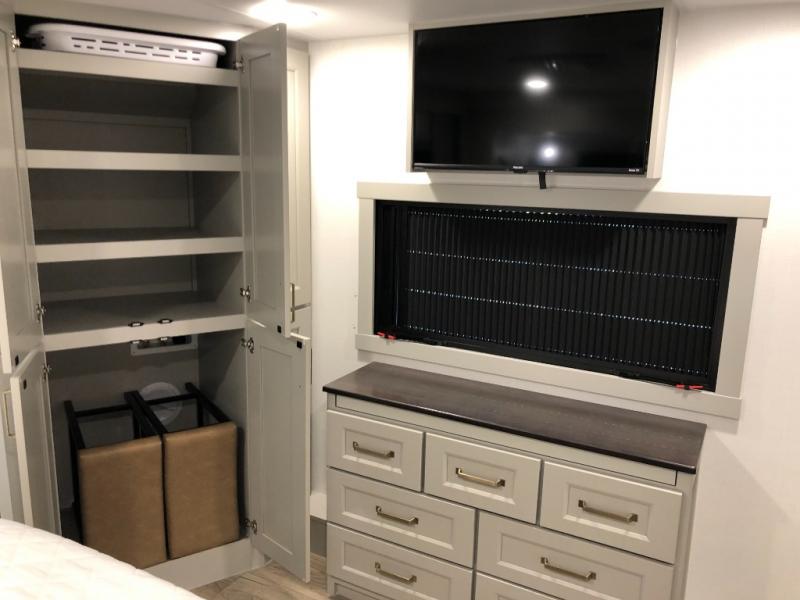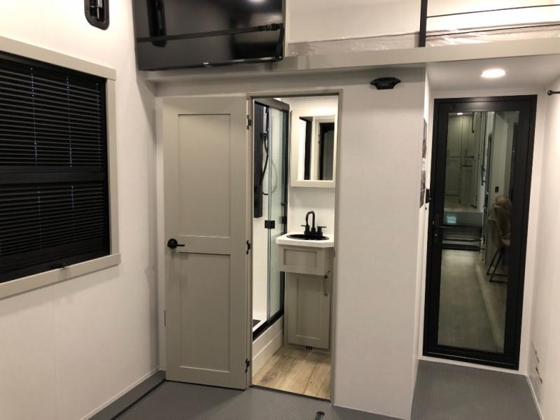 Whether you use this toy hauler to haul your favorite ride-on toys or as a mobile office, you're sure to love every inch of it! The 14' separate garage includes a Fold-N-Stow table and independent dual sofas, along with a full bath and a loft/storage with a twin bed for more sleeping space. The middle kitchen is every chef's dream with its GE appliances, kitchen island, and convenient features, such as pull-out trash bins and a cutting board, a pull-down knife rack and utensil tray, and a pull-out pantry/utility closet! Right next to the kitchen is the living room with a L-sofa with four modes, a 65" Phillips Smart TV and a fireplace, plus a convertible dining table/L-desk where you can dine or get some work done. You'll love the second full bath up front close to the private bedroom, and here, you'll find a king bed slide out, under-bed storage drawers and motion lights, a walk-in closet with cordless vacuum prep, and a sliding dresser top with hidden storage for valuables. There is also washer and dryer prep in the bedroom and garage, making this toy hauler full-time capable!
