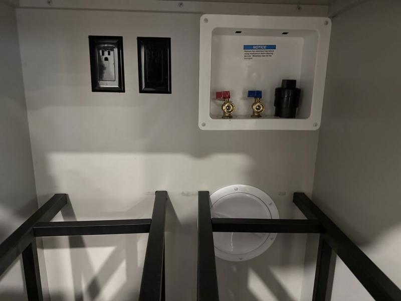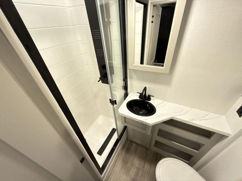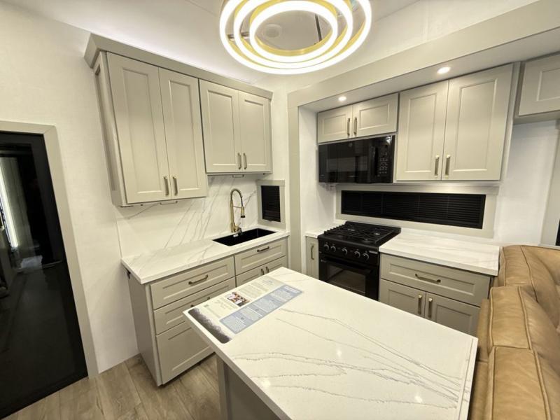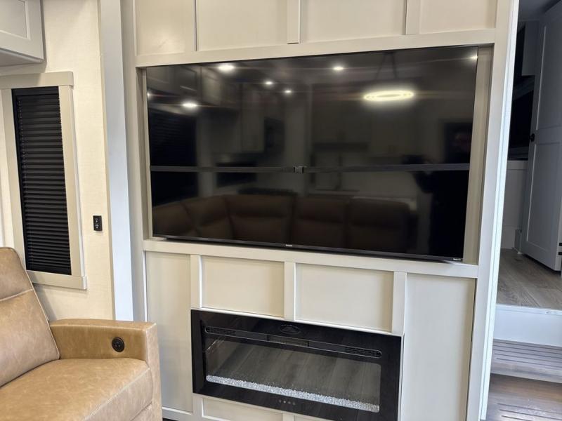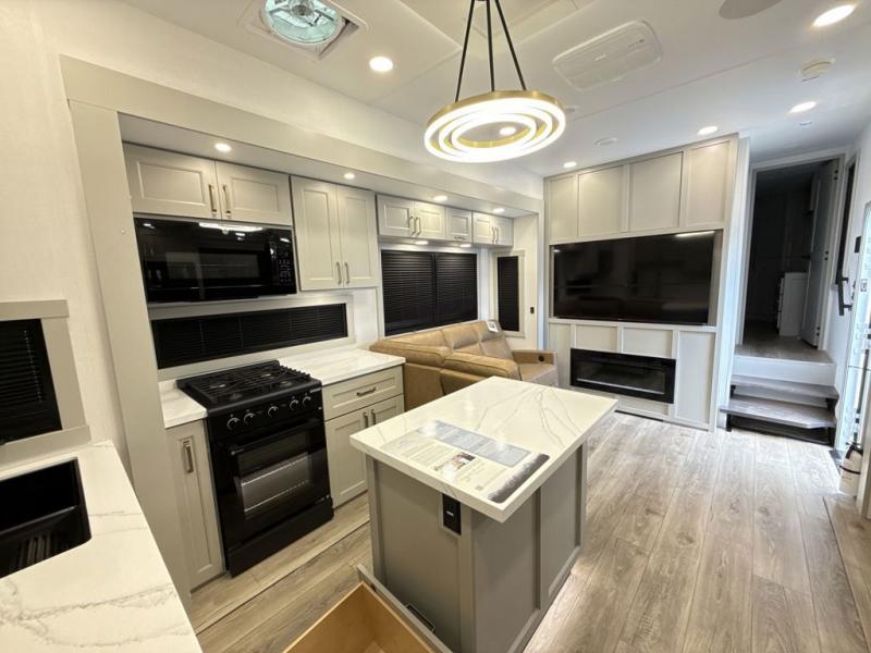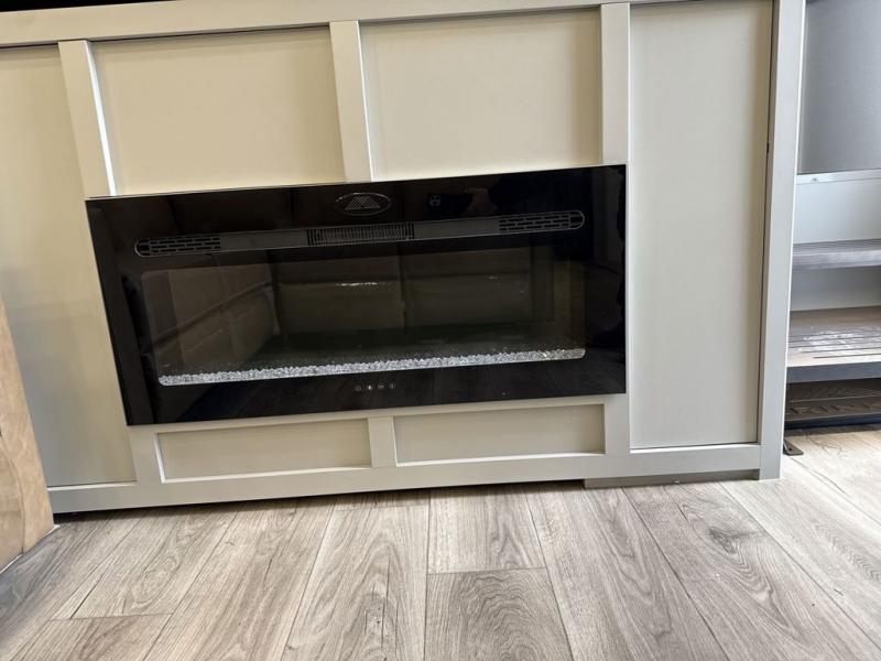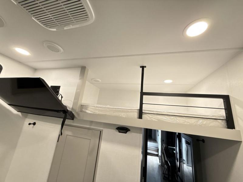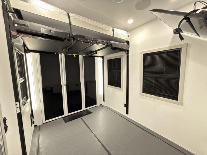 Whether you use this toy hauler to haul your favorite ride-on toys or as a mobile office, you're sure to love every inch of it! The 14' separate garage includes a Fold-N-Stow table and independent dual sofas, along with a full bath and a loft/storage with a twin bed for more sleeping space. The middle kitchen is every chef's dream with its GE appliances, kitchen island, and convenient features, such as pull-out trash bins and a cutting board, a pull-down knife rack and utensil tray, and a pull-out pantry/utility closet! Right next to the kitchen is the living room with a L-sofa with four modes, a 65" Phillips Smart TV and a fireplace, plus a convertible dining table/L-desk where you can dine or get some work done. You'll love the second full bath up front close to the private bedroom, and here, you'll find a king bed slide out, under-bed storage drawers and motion lights, a walk-in closet with cordless vacuum prep, and a sliding dresser top with hidden storage for valuables. There is also washer and dryer prep in the bedroom and garage, making this toy hauler full-time capable!