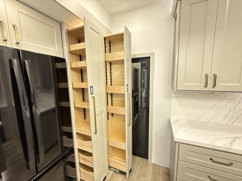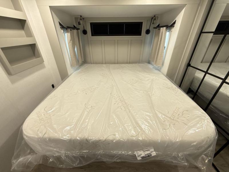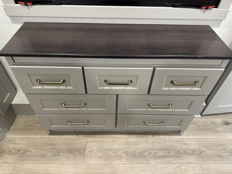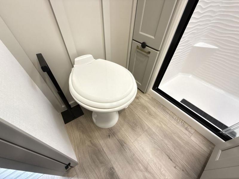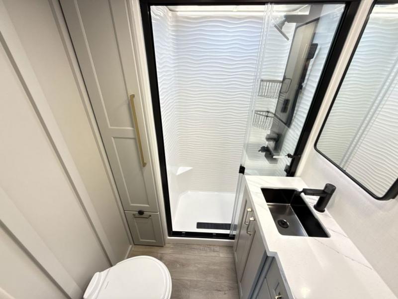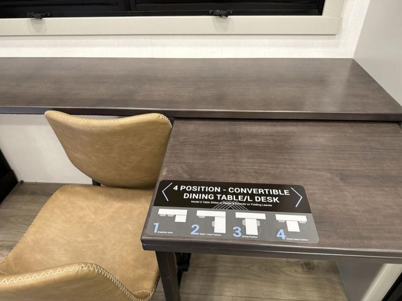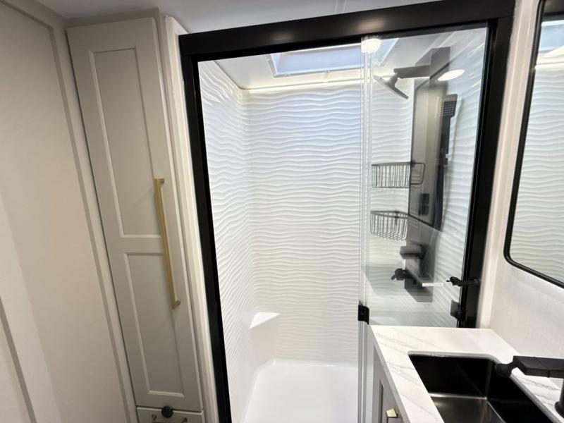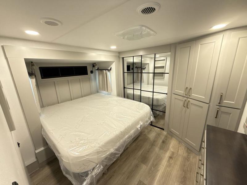 Whether you use this toy hauler to haul your favorite ride-on toys or as a mobile office, you're sure to love every inch of it! The 14' separate garage includes a Fold-N-Stow table and independent dual sofas, along with a full bath and a loft/storage with a twin bed for more sleeping space. The middle kitchen is every chef's dream with its GE appliances, kitchen island, and convenient features, such as pull-out trash bins and a cutting board, a pull-down knife rack and utensil tray, and a pull-out pantry/utility closet! Right next to the kitchen is the living room with a L-sofa with four modes, a 65" Phillips Smart TV and a fireplace, plus a convertible dining table/L-desk where you can dine or get some work done. You'll love the second full bath up front close to the private bedroom, and here, you'll find a king bed slide out, under-bed storage drawers and motion lights, a walk-in closet with cordless vacuum prep, and a sliding dresser top with hidden storage for valuables. There is also washer and dryer prep in the bedroom and garage, making this toy hauler full-time capable!