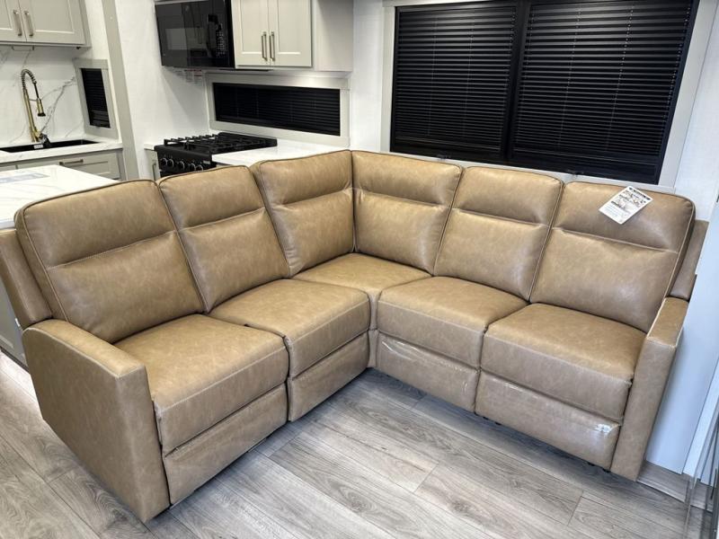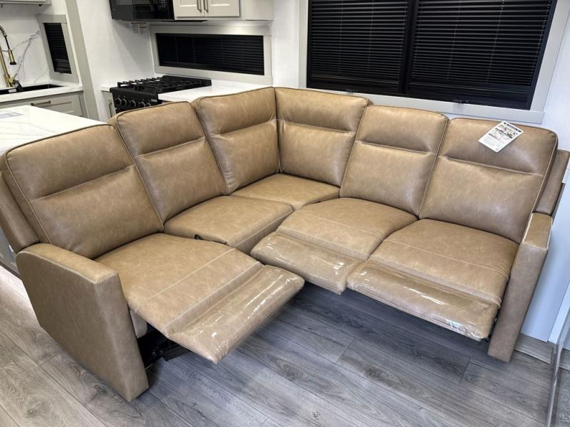 With any Model G toy hauler fifth wheel by Brinkley you will enjoy luxurious amenities, tons of storage space, and innovative features that have been developed and tested in the real world. Durable construction includes an industry leading PDI process, an industry best insulation package, and reinforced and walkable slide roofs. Some of the exterior features you'll find are a 3-way pass-through with a multi-functional flip-up bulkhead wall, under I-beam storage, a MAX-Vision reverse lighting system, and a low-maintenance roof to name a few. A Rockford Fosgate audio system comes standard, along with a OneControl app system that lets you control your fifth wheel's functions right from your mobile device. You will find the solar system with a designated storage area to be ultra convenient, plus there is a FlexPower 5500 with a dual fuel inverter generator for all your power needs. Head inside to find a residential interior with Brinkley's CraftSense wood trim construction, floating entrance steps, integrated window screens and insulated blackout blinds, and residential solid surface countertops plus backsplash. You will also enjoy the neon shower lighting and recessed medicine cabinets in the bath, plus motion activated LED bed lights and dual bedside outlets in the bedroom. Choose a Model G toy hauler fifth wheel to experience all the luxury it has to offer!