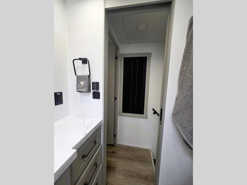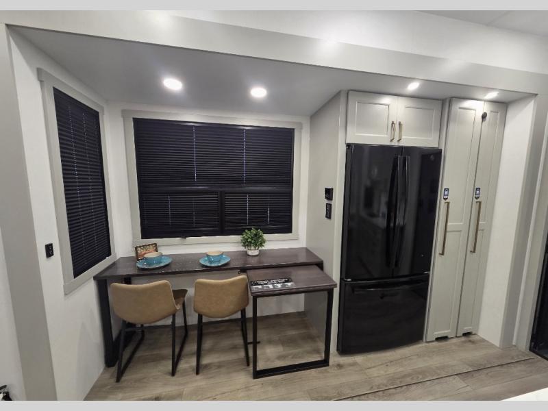 Whether you use this toy hauler to haul your favorite ride-on toys or as a mobile office, you're sure to love every inch of it! The 14' separate garage includes a Fold-N-Stow table and independent dual sofas, along with a full bath and a loft/storage with a twin bed for more sleeping space. The middle kitchen is every chef's dream with its GE appliances, kitchen island, and convenient features, such as pull-out trash bins and a cutting board, a pull-down knife rack and utensil tray, and a pull-out pantry/utility closet! Right next to the kitchen is the living room with a L-sofa with four modes, a 65" Phillips Smart TV and a fireplace, plus a convertible dining table/L-desk where you can dine or get some work done. You'll love the second full bath up front close to the private bedroom, and here, you'll find a king bed slide out, under-bed storage drawers and motion lights, a walk-in closet with cordless vacuum prep, and a sliding dresser top with hidden storage for valuables. There is also washer and dryer prep in the bedroom and garage, making this toy hauler full-time capable!