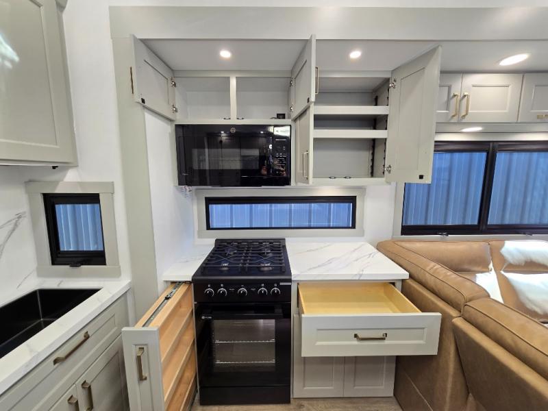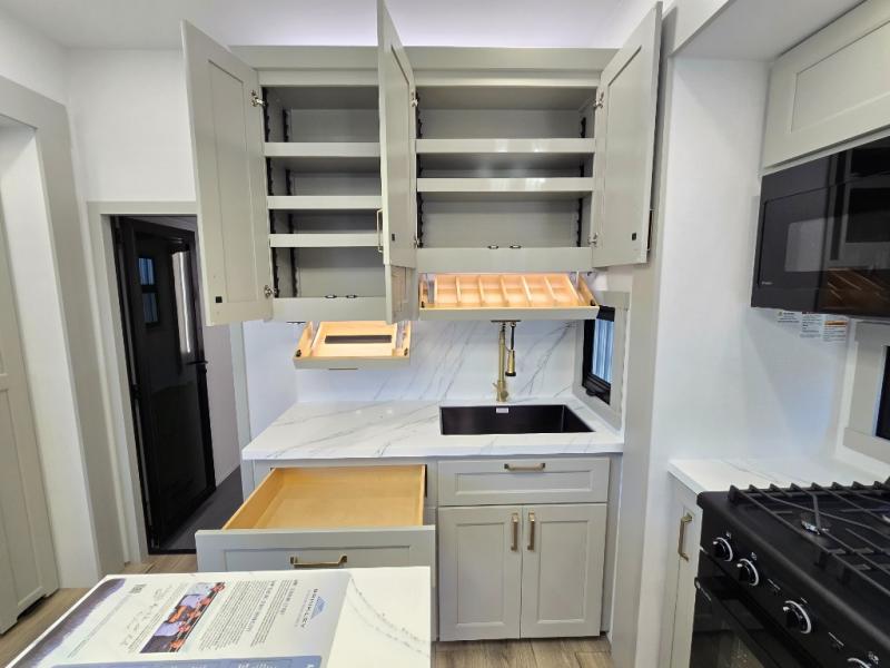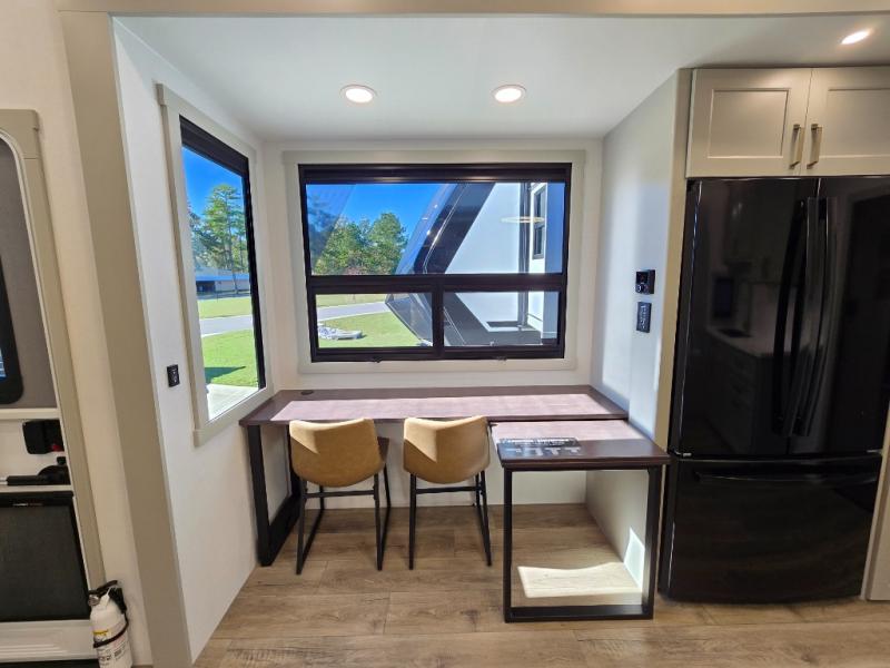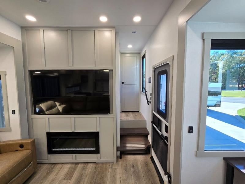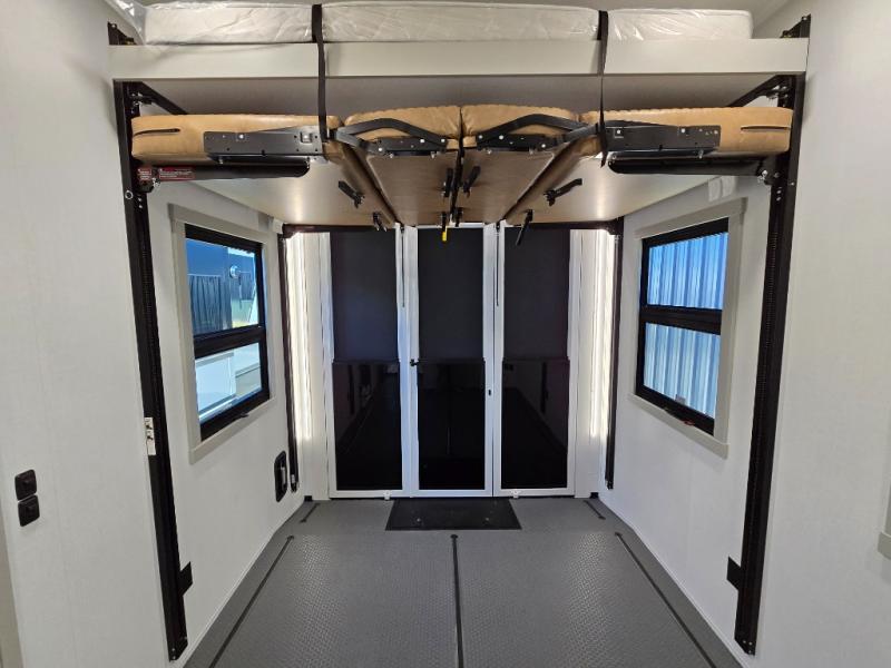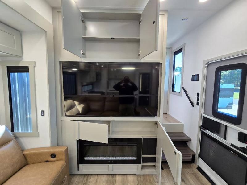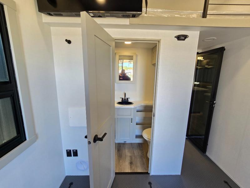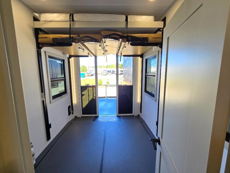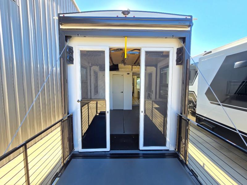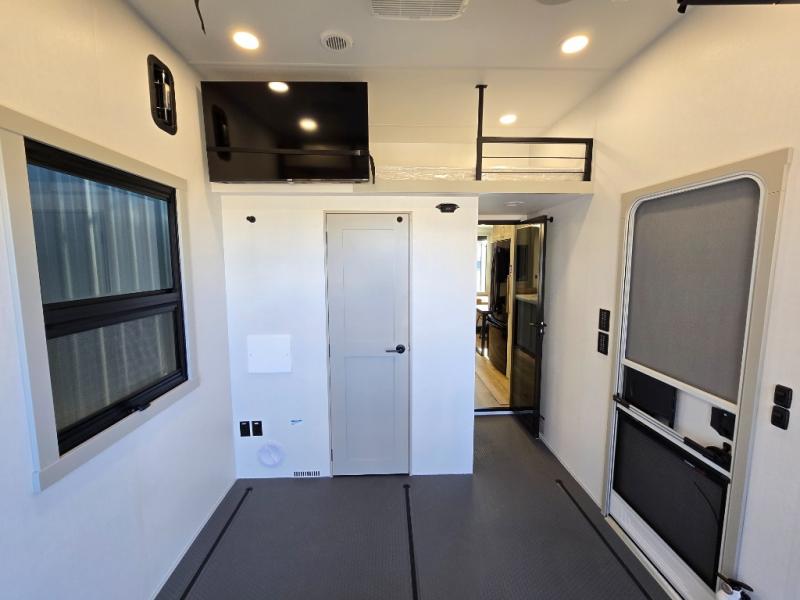Whether you use this toy hauler to haul your favorite ride-on toys or as a mobile office, you're sure to love every inch of it! The 14' separate garage includes a Fold-N-Stow table and independent dual sofas, along with a full bath and a loft/storage with a twin bed for more sleeping space. The middle kitchen is every chef's dream with its GE appliances, kitchen island, and convenient features, such as pull-out trash bins and a cutting board, a pull-down knife rack and utensil tray, and a pull-out pantry/utility closet! Right next to the kitchen is the living room with a L-sofa with four modes, a 65" Phillips Smart TV and a fireplace, plus a convertible dining table/L-desk where you can dine or get some work done. You'll love the second full bath up front close to the private bedroom, and here, you'll find a king bed slide out, under-bed storage drawers and motion lights, a walk-in closet with cordless vacuum prep, and a sliding dresser top with hidden storage for valuables. There is also washer and dryer prep in the bedroom and garage, making this toy hauler full-time capable!
