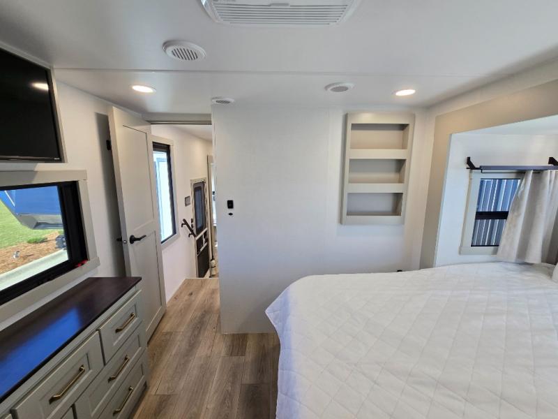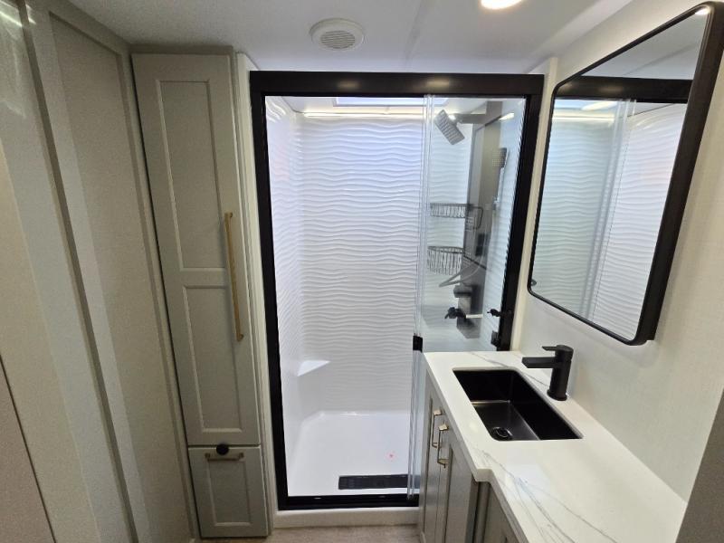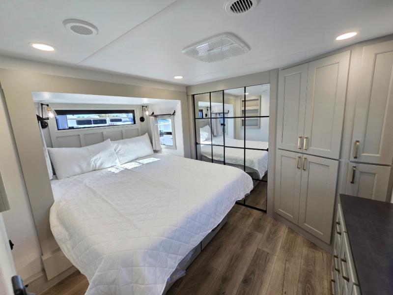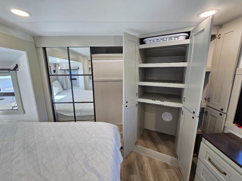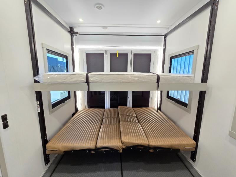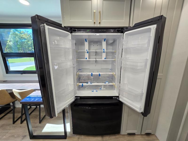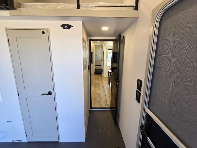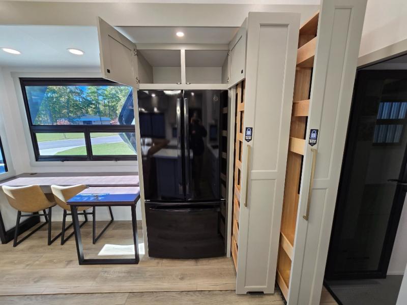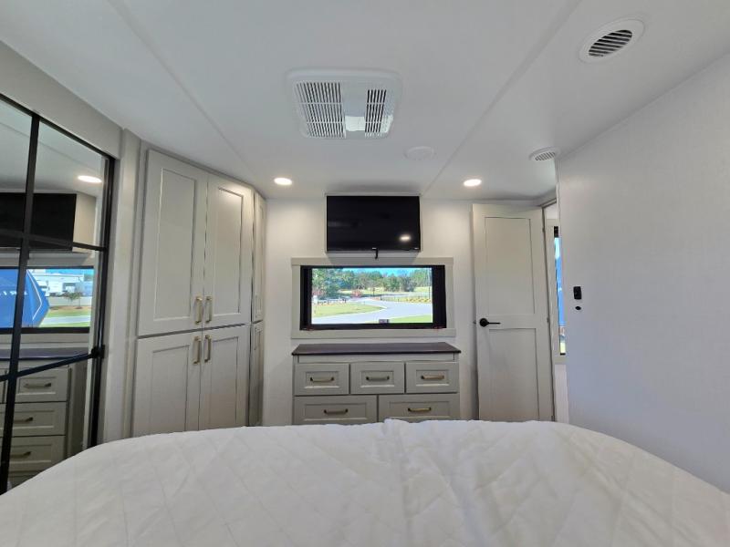 Whether you use this toy hauler to haul your favorite ride-on toys or as a mobile office, you're sure to love every inch of it! The 14' separate garage includes a Fold-N-Stow table and independent dual sofas, along with a full bath and a loft/storage with a twin bed for more sleeping space. The middle kitchen is every chef's dream with its GE appliances, kitchen island, and convenient features, such as pull-out trash bins and a cutting board, a pull-down knife rack and utensil tray, and a pull-out pantry/utility closet! Right next to the kitchen is the living room with a L-sofa with four modes, a 65" Phillips Smart TV and a fireplace, plus a convertible dining table/L-desk where you can dine or get some work done. You'll love the second full bath up front close to the private bedroom, and here, you'll find a king bed slide out, under-bed storage drawers and motion lights, a walk-in closet with cordless vacuum prep, and a sliding dresser top with hidden storage for valuables. There is also washer and dryer prep in the bedroom and garage, making this toy hauler full-time capable!