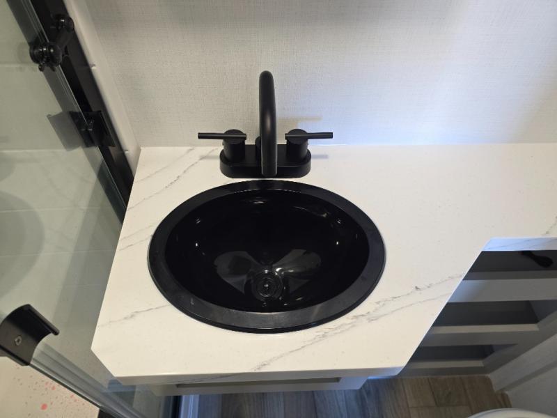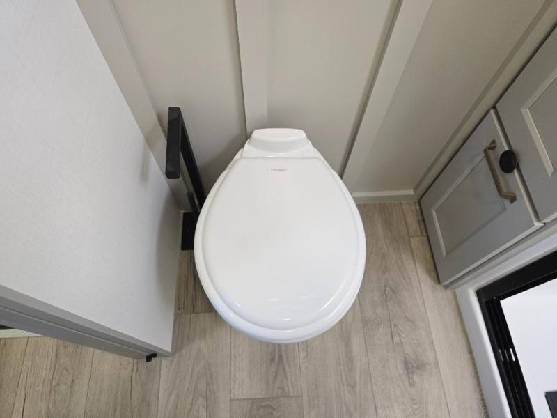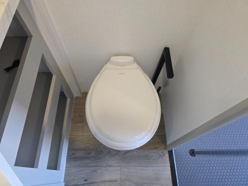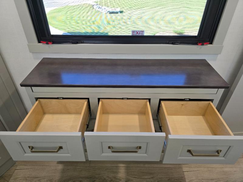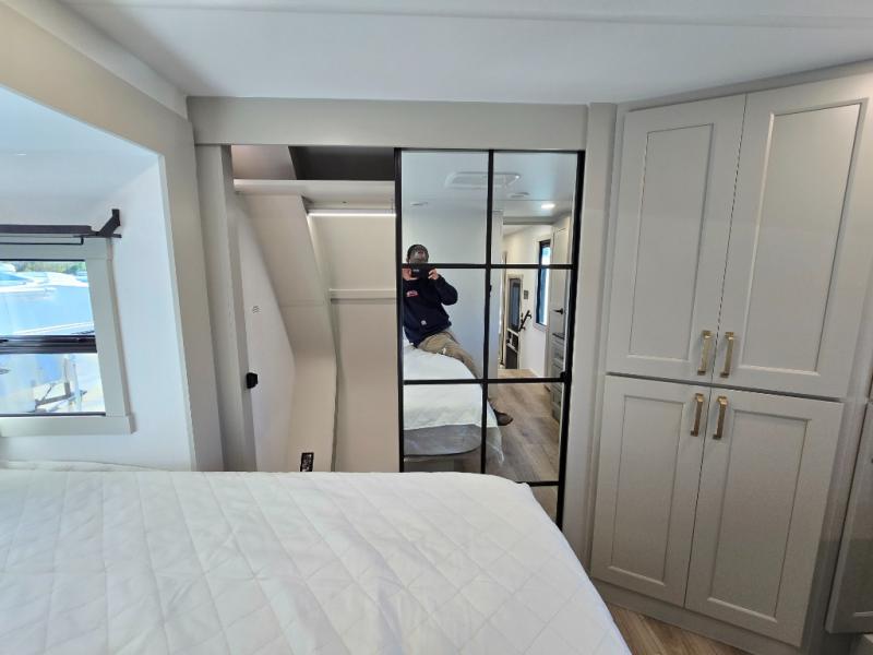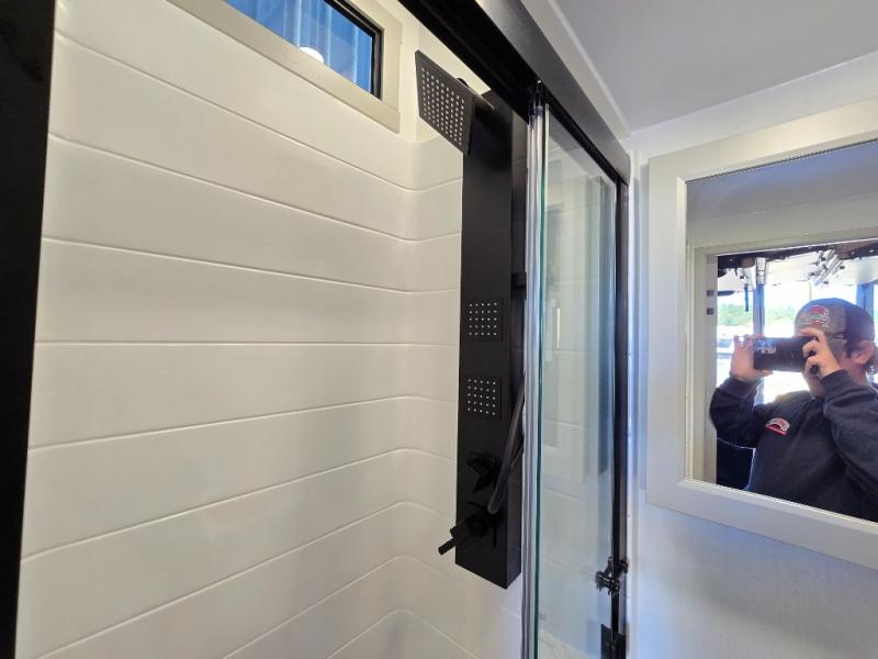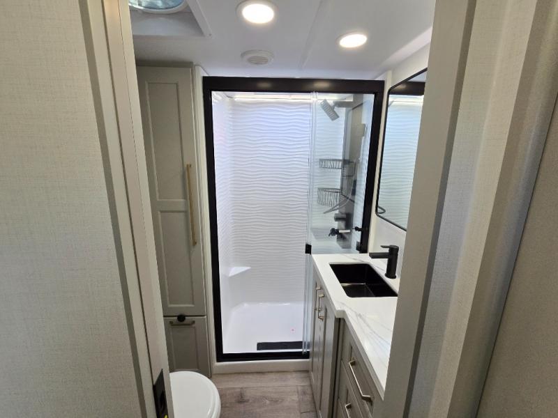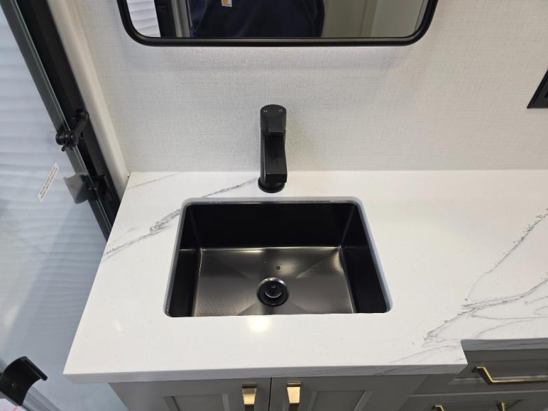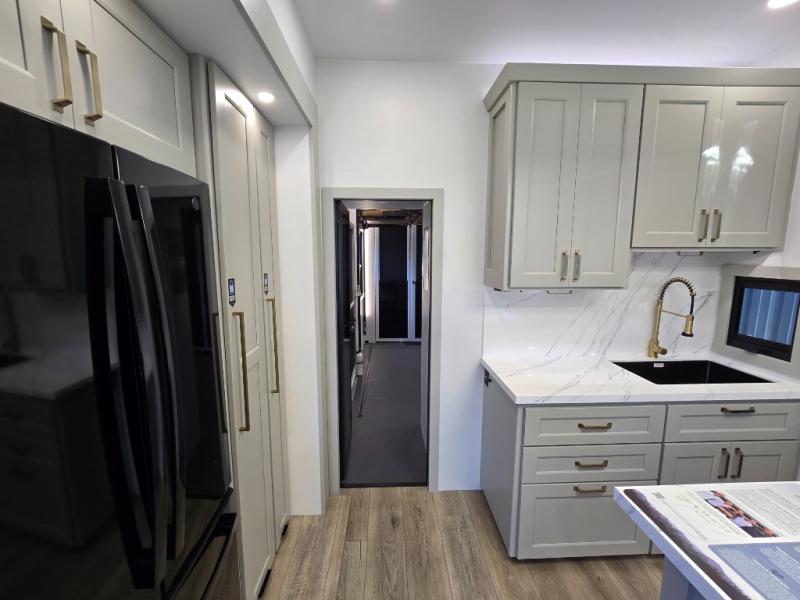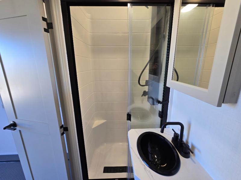 Whether you use this toy hauler to haul your favorite ride-on toys or as a mobile office, you're sure to love every inch of it! The 14' separate garage includes a Fold-N-Stow table and independent dual sofas, along with a full bath and a loft/storage with a twin bed for more sleeping space. The middle kitchen is every chef's dream with its GE appliances, kitchen island, and convenient features, such as pull-out trash bins and a cutting board, a pull-down knife rack and utensil tray, and a pull-out pantry/utility closet! Right next to the kitchen is the living room with a L-sofa with four modes, a 65" Phillips Smart TV and a fireplace, plus a convertible dining table/L-desk where you can dine or get some work done. You'll love the second full bath up front close to the private bedroom, and here, you'll find a king bed slide out, under-bed storage drawers and motion lights, a walk-in closet with cordless vacuum prep, and a sliding dresser top with hidden storage for valuables. There is also washer and dryer prep in the bedroom and garage, making this toy hauler full-time capable!