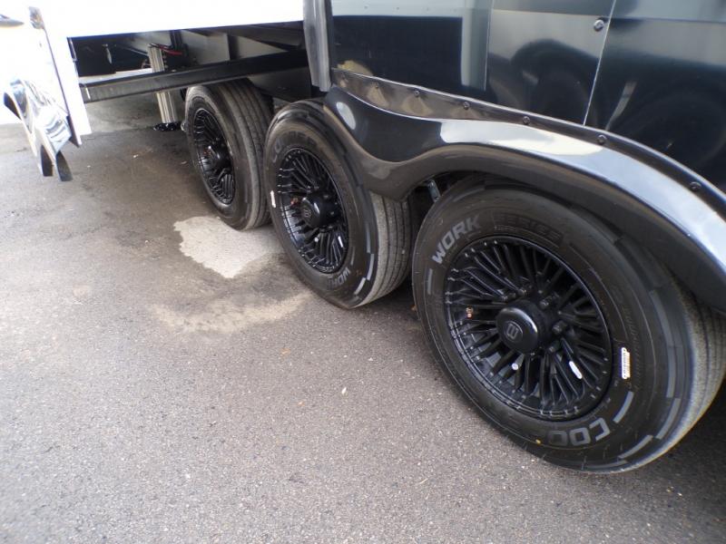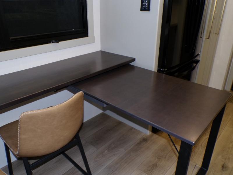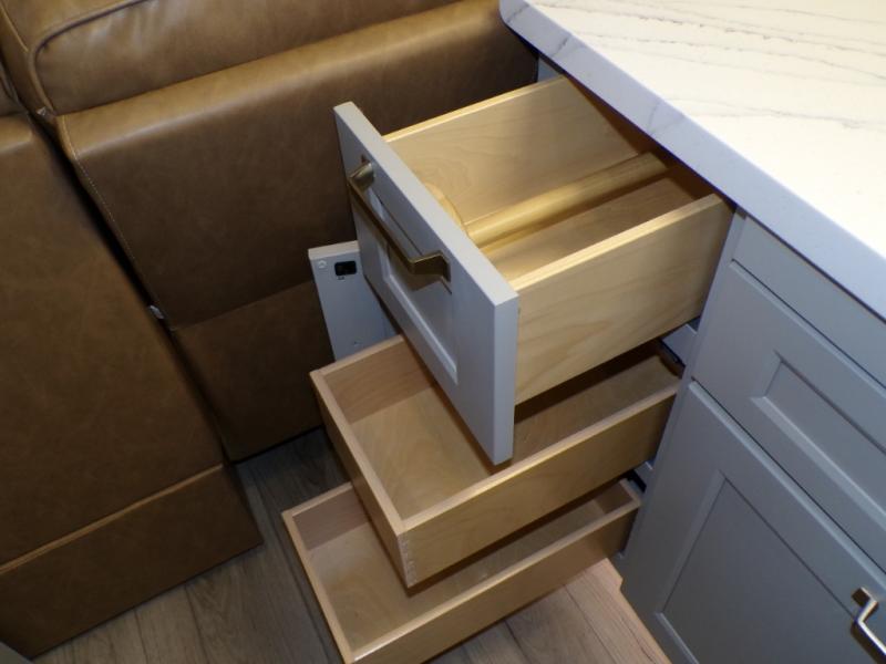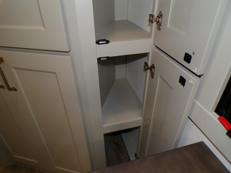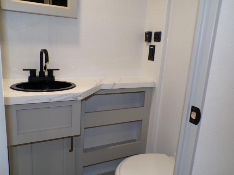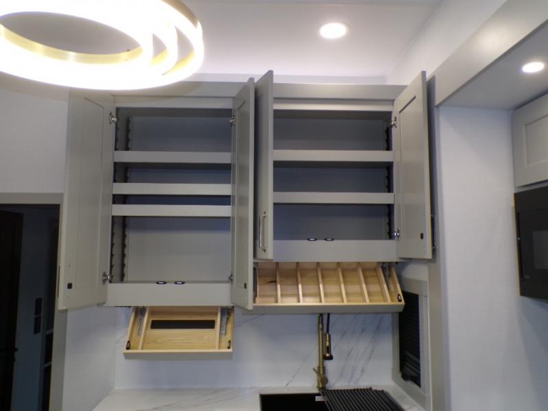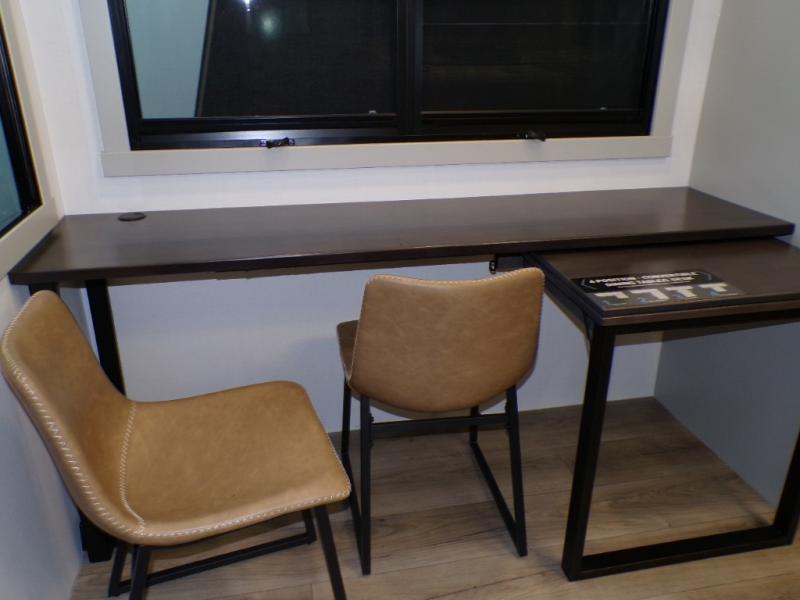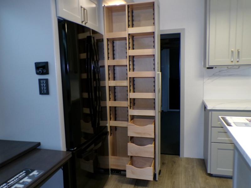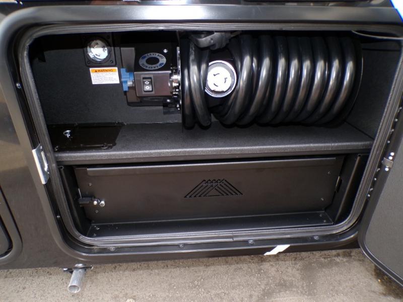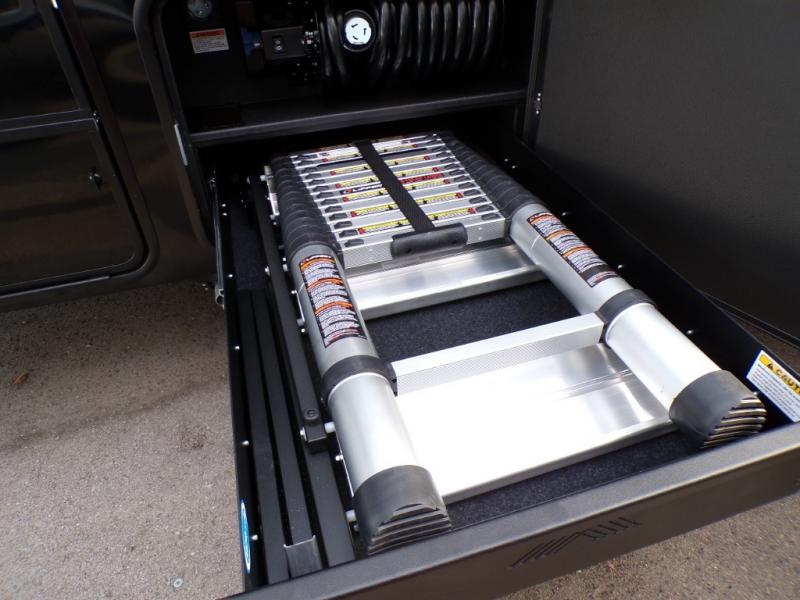 Whether you use this toy hauler to haul your favorite ride-on toys or as a mobile office, you're sure to love every inch of it! The 14' separate garage includes a Fold-N-Stow table and independent dual sofas, along with a full bath and a loft/storage with a twin bed for more sleeping space. The middle kitchen is every chef's dream with its GE appliances, kitchen island, and convenient features, such as pull-out trash bins and a cutting board, a pull-down knife rack and utensil tray, and a pull-out pantry/utility closet! Right next to the kitchen is the living room with a L-sofa with four modes, a 65" Phillips Smart TV and a fireplace, plus a convertible dining table/L-desk where you can dine or get some work done. You'll love the second full bath up front close to the private bedroom, and here, you'll find a king bed slide out, under-bed storage drawers and motion lights, a walk-in closet with cordless vacuum prep, and a sliding dresser top with hidden storage for valuables. There is also washer and dryer prep in the bedroom and garage, making this toy hauler full-time capable!