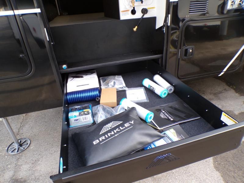 With any Model G toy hauler fifth wheel by Brinkley you will enjoy luxurious amenities, tons of storage space, and innovative features that have been developed and tested in the real world. Durable construction includes an industry leading PDI process, an industry best insulation package, and reinforced and walkable slide roofs. Some of the exterior features you'll find are a 3-way pass-through with a multi-functional flip-up bulkhead wall, under I-beam storage, a MAX-Vision reverse lighting system, and a low-maintenance roof to name a few. A Rockford Fosgate audio system comes standard, along with a OneControl app system that lets you control your fifth wheel's functions right from your mobile device. You will find the solar system with a designated storage area to be ultra convenient, plus there is a FlexPower 5500 with a dual fuel inverter generator for all your power needs. Head inside to find a residential interior with Brinkley's CraftSense wood trim construction, floating entrance steps, integrated window screens and insulated blackout blinds, and residential solid surface countertops plus backsplash. You will also enjoy the neon shower lighting and recessed medicine cabinets in the bath, plus motion activated LED bed lights and dual bedside outlets in the bedroom. Choose a Model G toy hauler fifth wheel to experience all the luxury it has to offer!