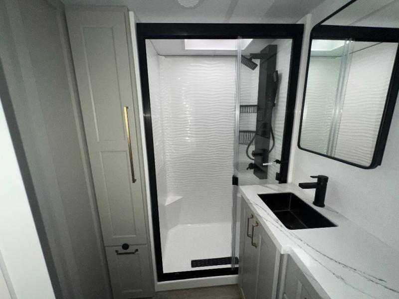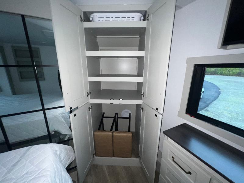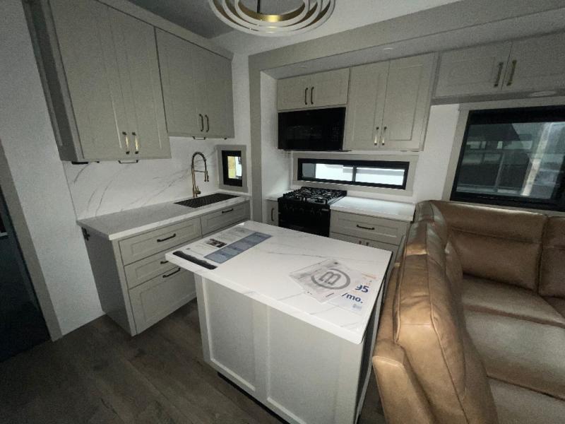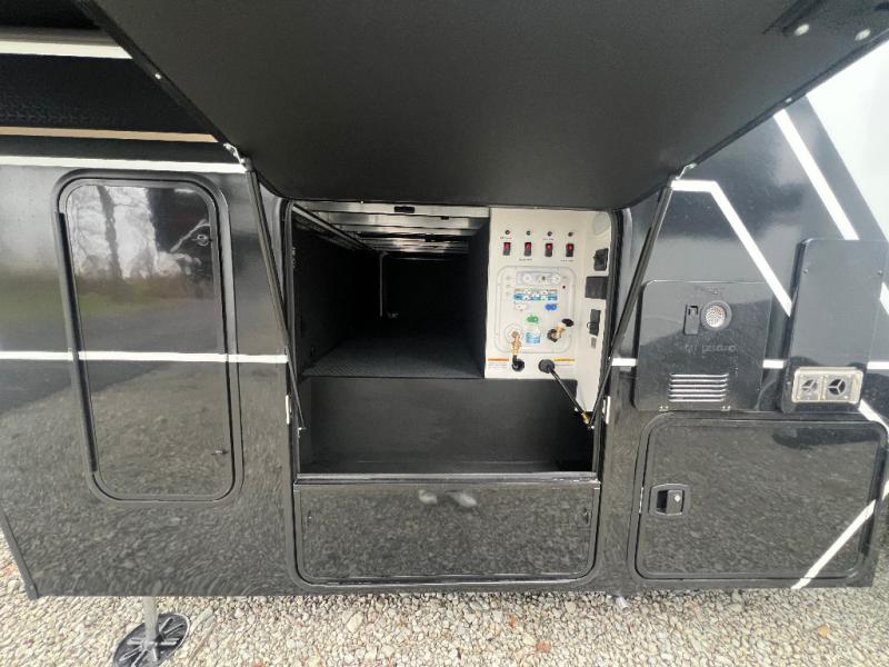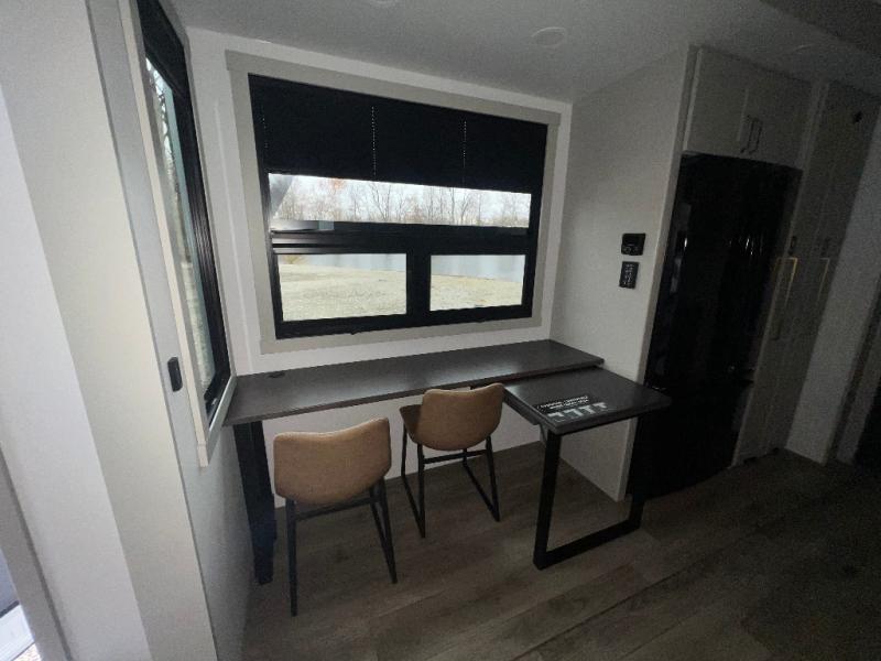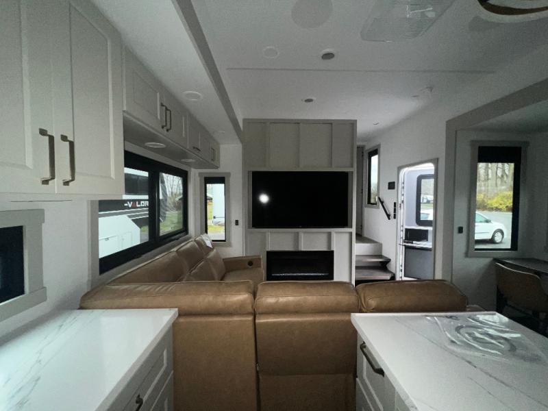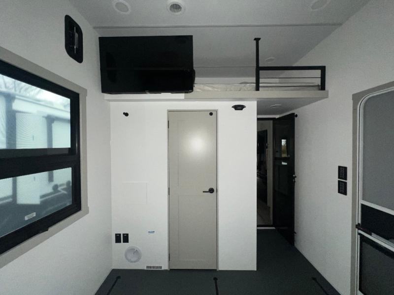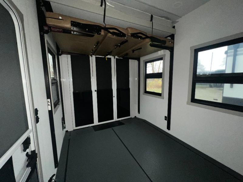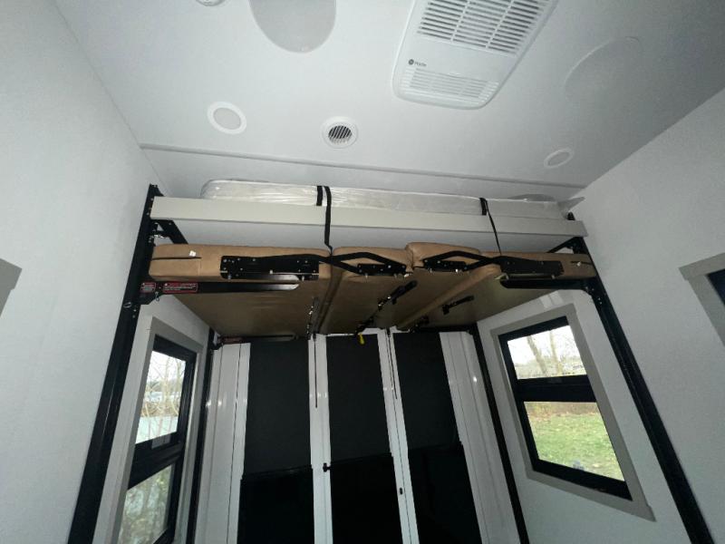 Whether you use this toy hauler to haul your favorite ride-on toys or as a mobile office, you're sure to love every inch of it! The 11' garage includes a Fold-N-Stow table and independent dual sofas, along with a full bath and a loft/storage with a twin bed for more sleeping space. The middle kitchen is every chef's dream with its GE appliances, kitchen island, and convenient features, such as pull-out trash bins and a cutting board, a pull-down knife rack and utensil tray, and a pull-out pantry/utility closet! Right next to the kitchen is the living room with a L-sofa, a 65" Phillips Smart TV and a fireplace, plus a convertible dining table/L-desk where you can dine or get some work done. You'll love the second full bath up front close to the private bedroom, and here, you'll find a king bed slide out, under-bed storage drawers and motion lights, a walk-in closet with cordless vacuum prep, and a sliding dresser top with hidden storage for valuables. There is also washer and dryer prep in the bedroom and garage, making this toy hauler full-time capable!