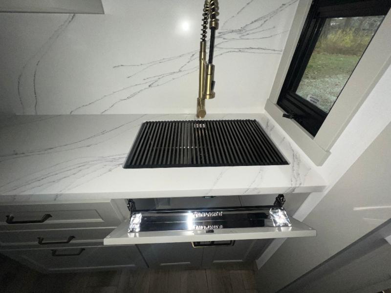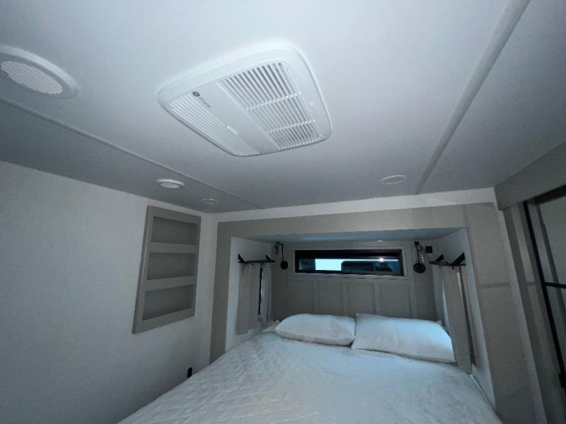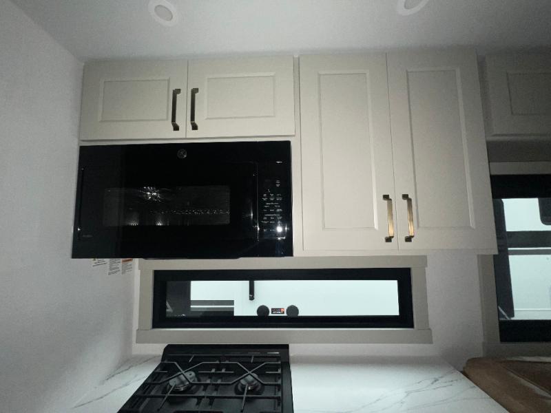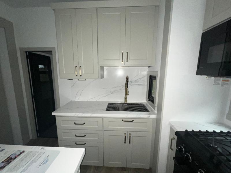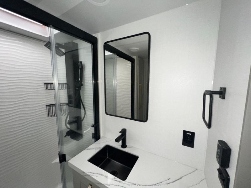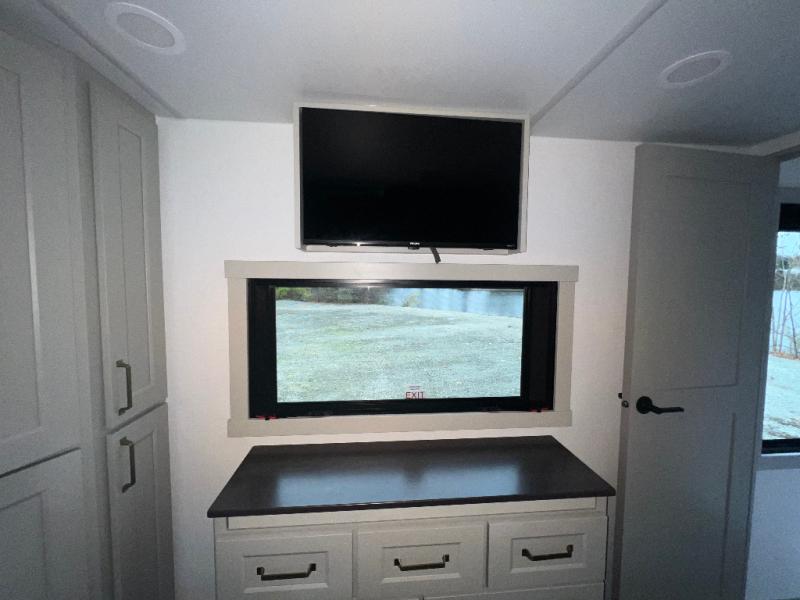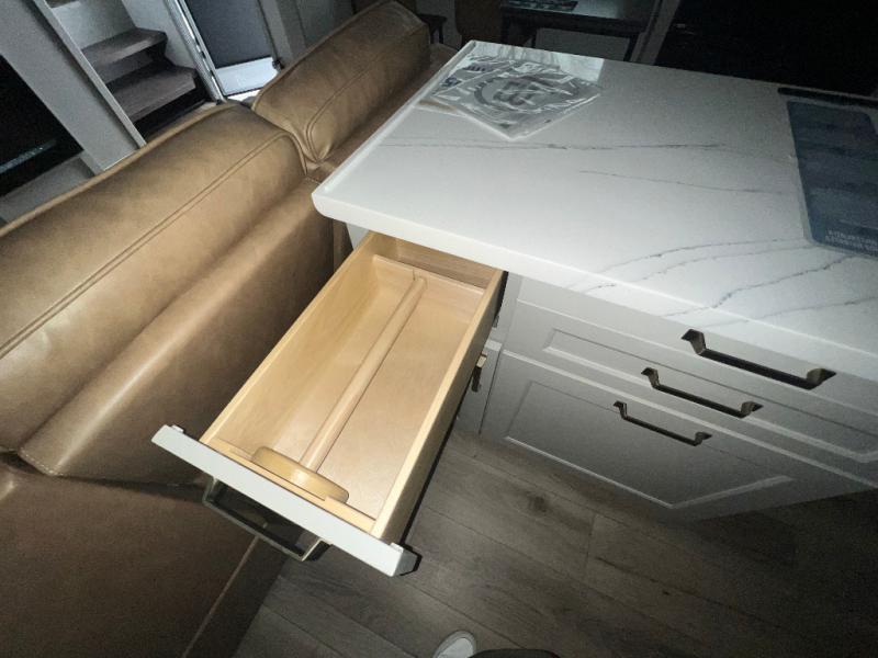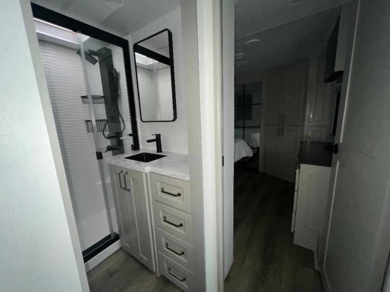Whether you use this toy hauler to haul your favorite ride-on toys or as a mobile office, you're sure to love every inch of it! The 11' garage includes a Fold-N-Stow table and independent dual sofas, along with a full bath and a loft/storage with a twin bed for more sleeping space. The middle kitchen is every chef's dream with its GE appliances, kitchen island, and convenient features, such as pull-out trash bins and a cutting board, a pull-down knife rack and utensil tray, and a pull-out pantry/utility closet! Right next to the kitchen is the living room with a L-sofa, a 65" Phillips Smart TV and a fireplace, plus a convertible dining table/L-desk where you can dine or get some work done. You'll love the second full bath up front close to the private bedroom, and here, you'll find a king bed slide out, under-bed storage drawers and motion lights, a walk-in closet with cordless vacuum prep, and a sliding dresser top with hidden storage for valuables. There is also washer and dryer prep in the bedroom and garage, making this toy hauler full-time capable!
