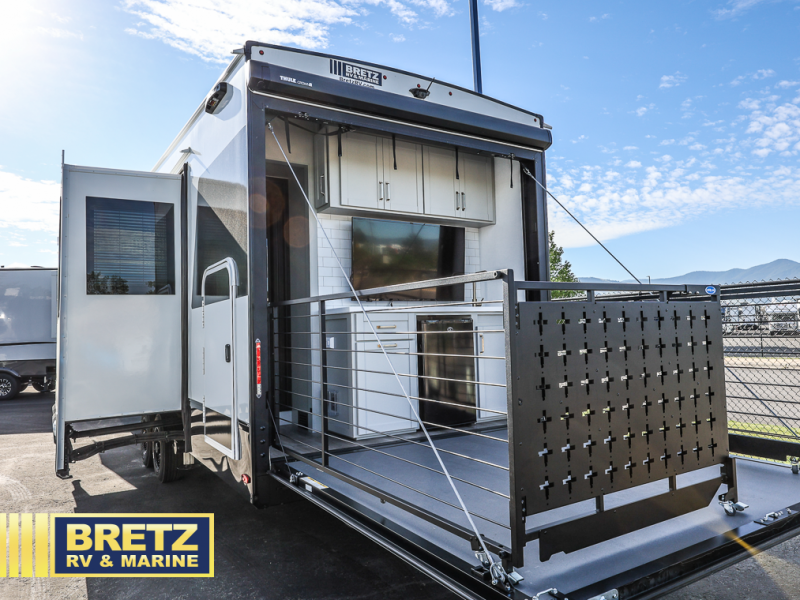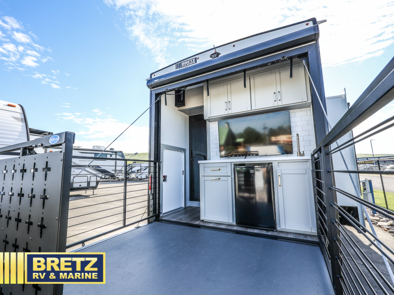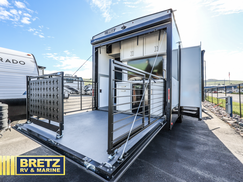With any Model G toy hauler fifth wheel by Brinkley you will enjoy luxurious amenities, tons of storage space, and innovative features that have been developed and tested in the real world. Durable construction includes an industry leading PDI process, an industry best insulation package, and reinforced and walkable slide roofs. Some of the exterior features you'll find are a 3-way pass-through with a multi-functional flip-up bulkhead wall, under I-beam storage, a MAX-Vision reverse lighting system, and a low-maintenance roof to name a few. A Rockford Fosgate audio system comes standard, along with a OneControl app system that lets you control your fifth wheel's functions right from your mobile device. You will find the solar system with a designated storage area to be ultra convenient, plus there is a FlexPower 5500 with a dual fuel inverter generator for all your power needs. Head inside to find a residential interior with Brinkley's CraftSense wood trim construction, floating entrance steps, integrated window screens and insulated blackout blinds, and residential solid surface countertops plus backsplash. You will also enjoy the neon shower lighting and recessed medicine cabinets in the bath, plus motion activated LED bed lights and dual bedside outlets in the bedroom. Choose a Model G toy hauler fifth wheel to experience all the luxury it has to offer!