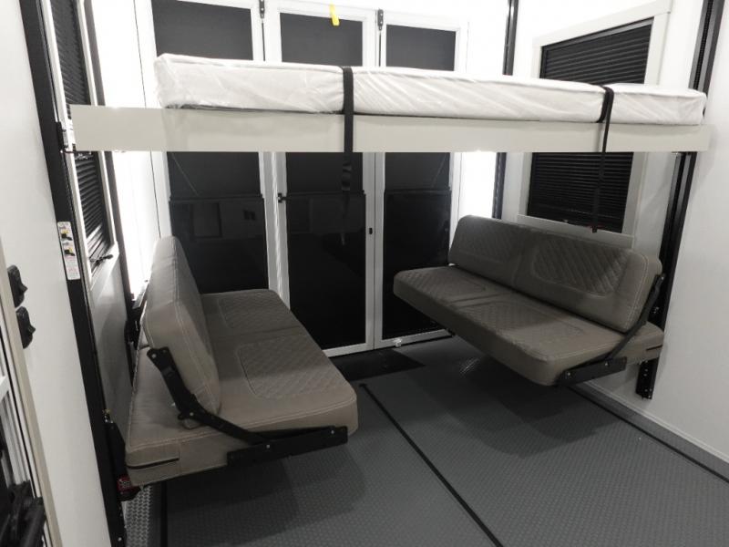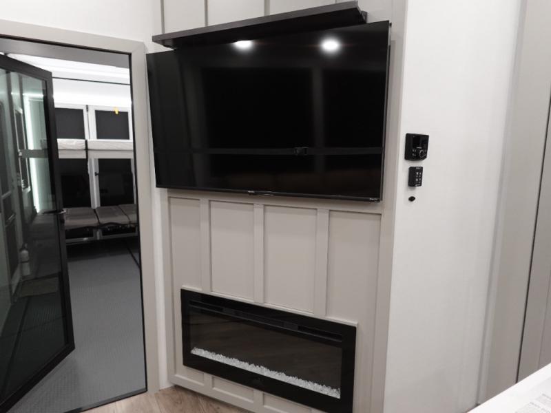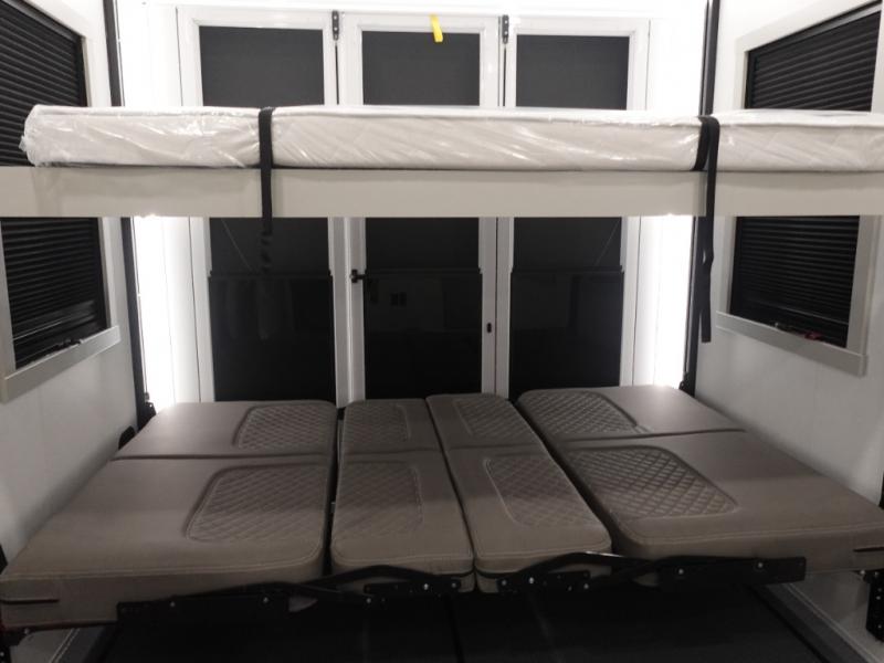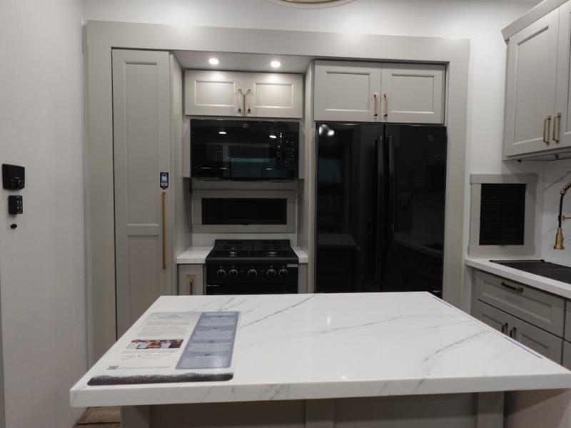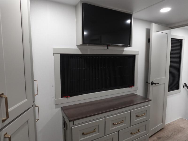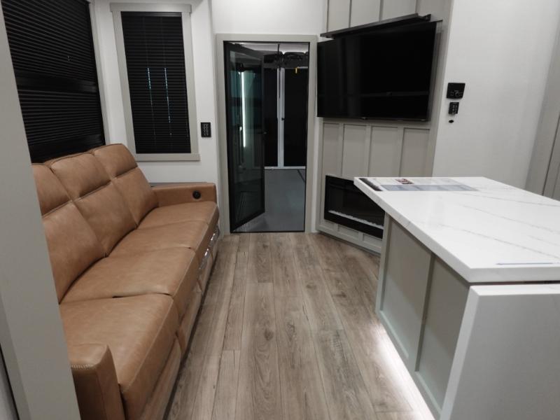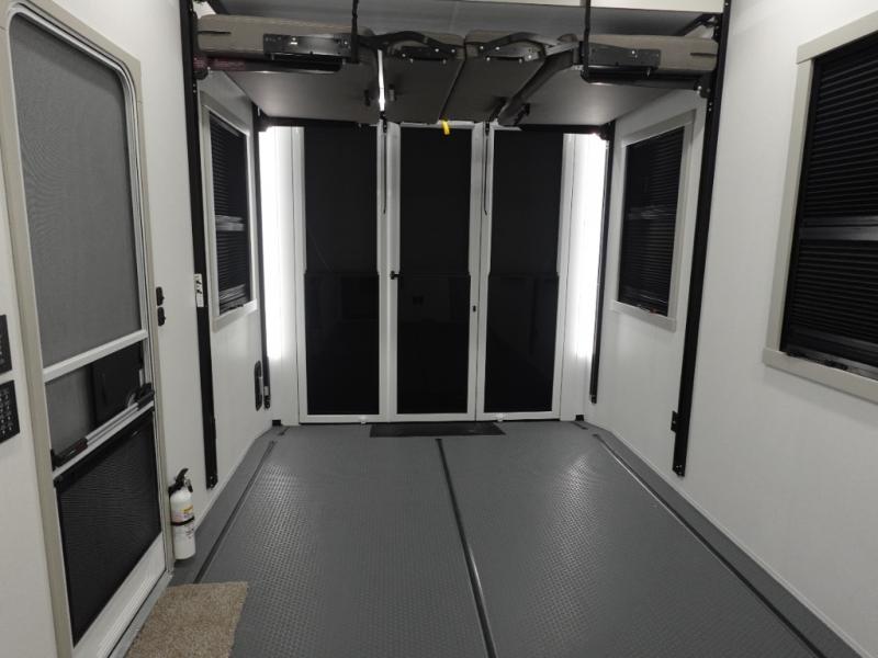 Prepare to be amazed by all the features packed into this toy hauler! There are triple slides that will provide your crew with more space, a 16' separate garage flex area that can sleep five with the loft included, plus a bath and a half for added convenience. The chef in your group will love the middle kitchen with a waterfall island that converts to a counter peninsula, a pull-out pantry, a GE Energy Star 19 cu. ft. refrigerator with ice and filtered water, and much more. In the combined kitchen and living area you'll find a spacious sofa with heat and massage, a fireplace, a TV, plus convenient dog bowls and shoe storage. After your toys are unloaded from the garage, you can relax on the independent dual couches with a Fold-N-Stow table in between. You will find the front private bedroom with a king bed slide out will provide a great night's rest, and you'll also find a walk-in closet, under-bed storage, and a sliding dresser top with hidden storage for special belongings.