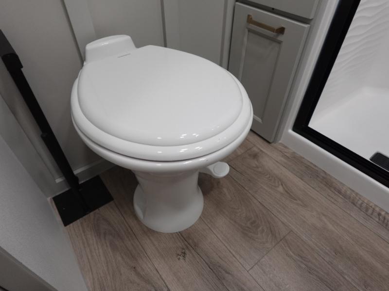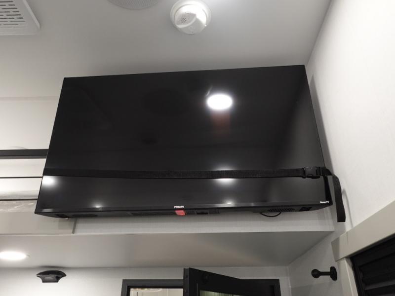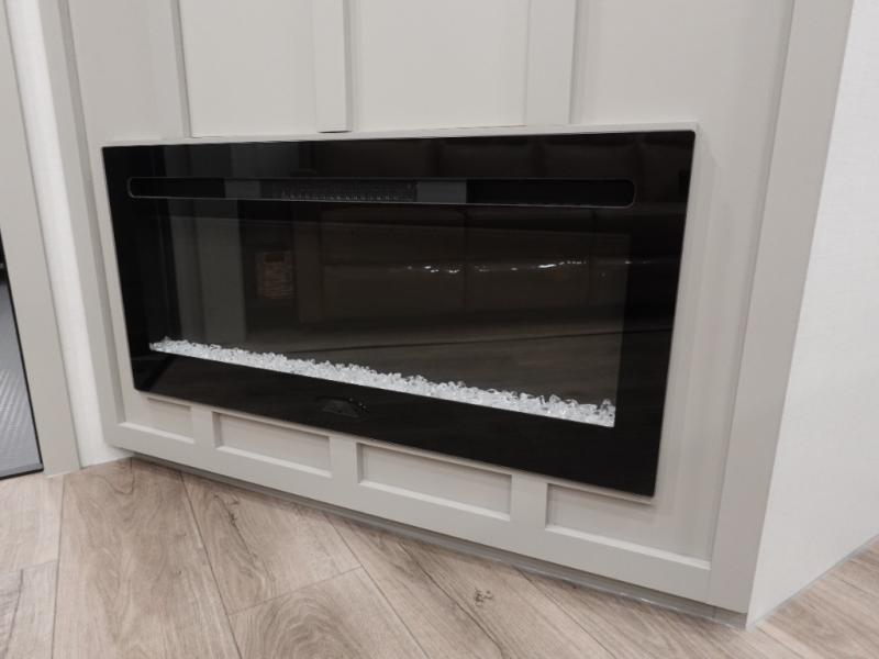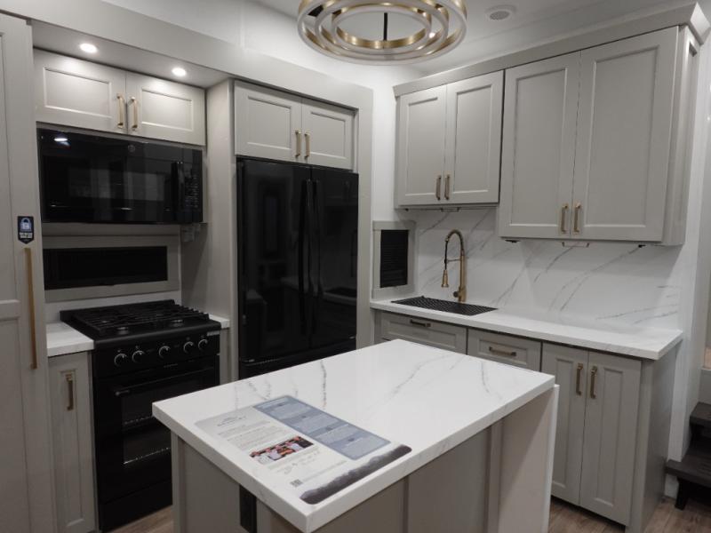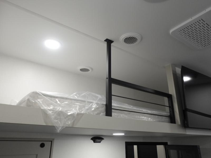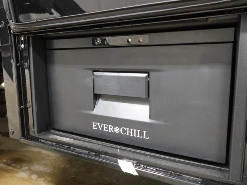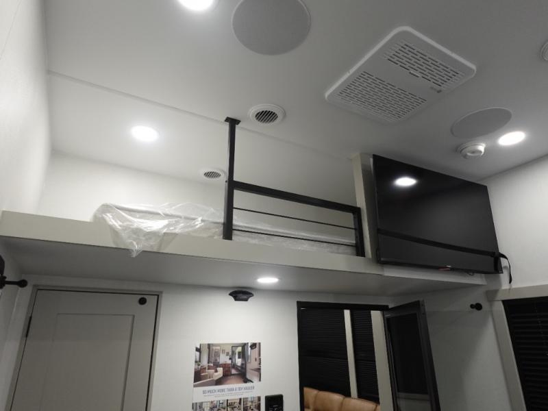 Prepare to be amazed by all the features packed into this toy hauler! There are triple slides that will provide your crew with more space, a 16' separate garage flex area that can sleep five with the loft included, plus a bath and a half for added convenience. The chef in your group will love the middle kitchen with a waterfall island that converts to a counter peninsula, a pull-out pantry, a GE Energy Star 19 cu. ft. refrigerator with ice and filtered water, and much more. In the combined kitchen and living area you'll find a spacious sofa with heat and massage, a fireplace, a TV, plus convenient dog bowls and shoe storage. After your toys are unloaded from the garage, you can relax on the independent dual couches with a Fold-N-Stow table in between. You will find the front private bedroom with a king bed slide out will provide a great night's rest, and you'll also find a walk-in closet, under-bed storage, and a sliding dresser top with hidden storage for special belongings.