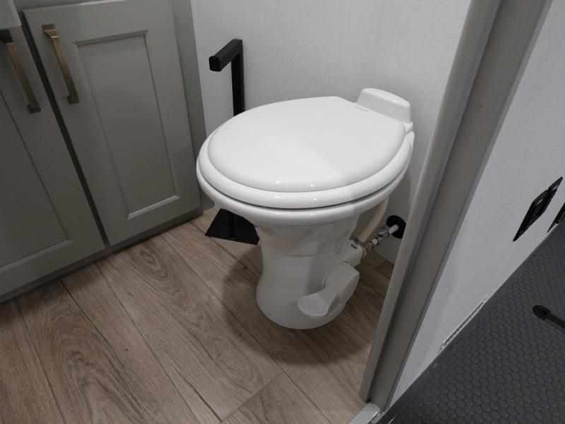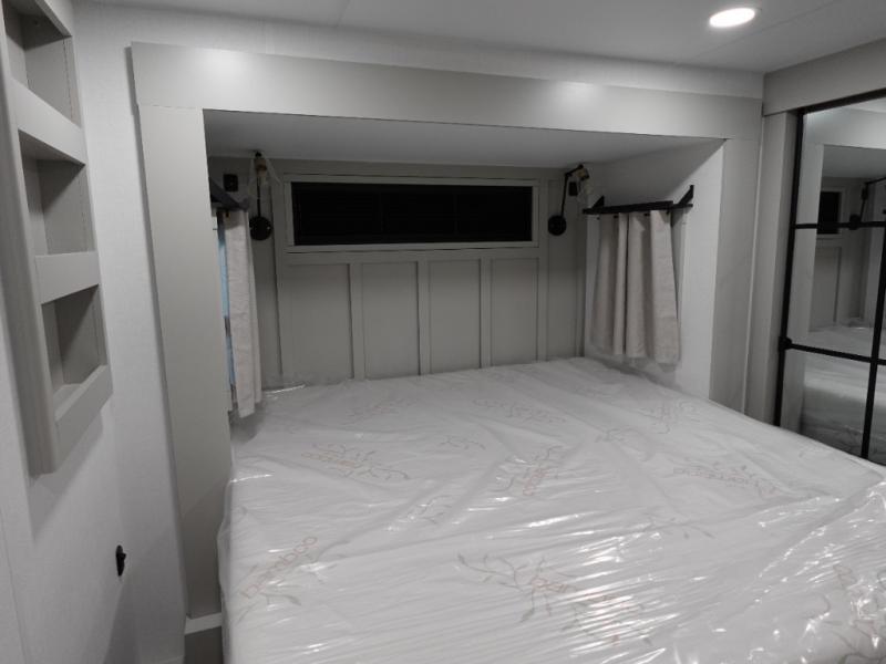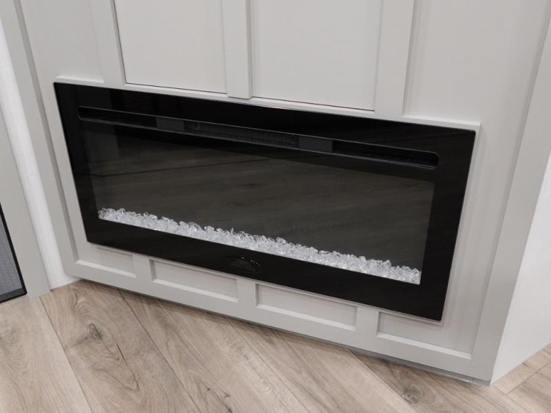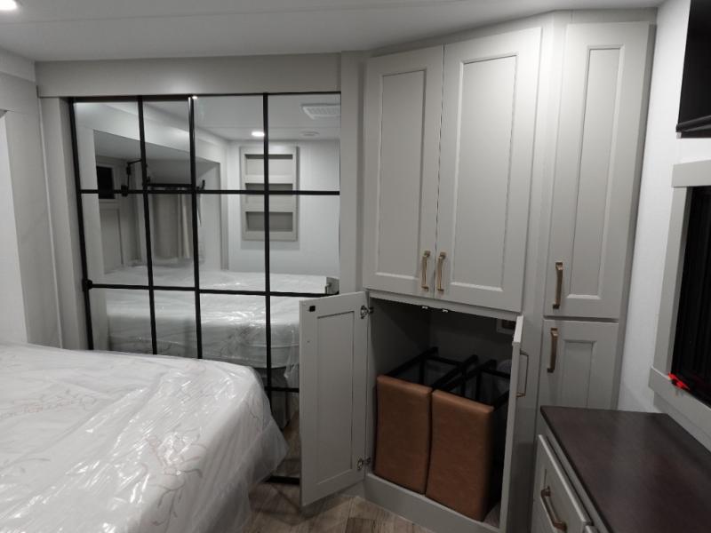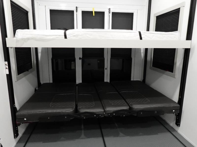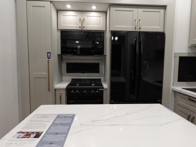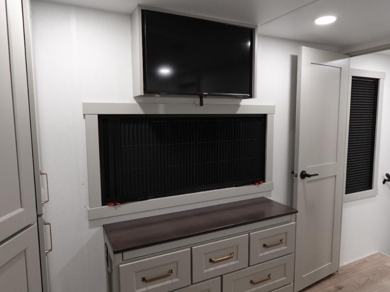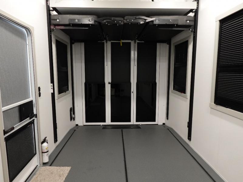 Prepare to be amazed by all the features packed into this toy hauler! There are triple slides that will provide your crew with more space, a 16' separate garage flex area that can sleep five with the loft included, plus a bath and a half for added convenience. The chef in your group will love the middle kitchen with a waterfall island that converts to a counter peninsula, a pull-out pantry, a GE Energy Star 19 cu. ft. refrigerator with ice and filtered water, and much more. In the combined kitchen and living area you'll find a spacious sofa with heat and massage, a fireplace, a TV, plus convenient dog bowls and shoe storage. After your toys are unloaded from the garage, you can relax on the independent dual couches with a Fold-N-Stow table in between. You will find the front private bedroom with a king bed slide out will provide a great night's rest, and you'll also find a walk-in closet, under-bed storage, and a sliding dresser top with hidden storage for special belongings.