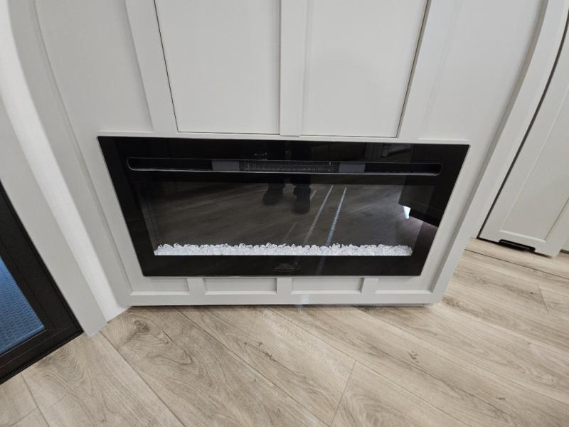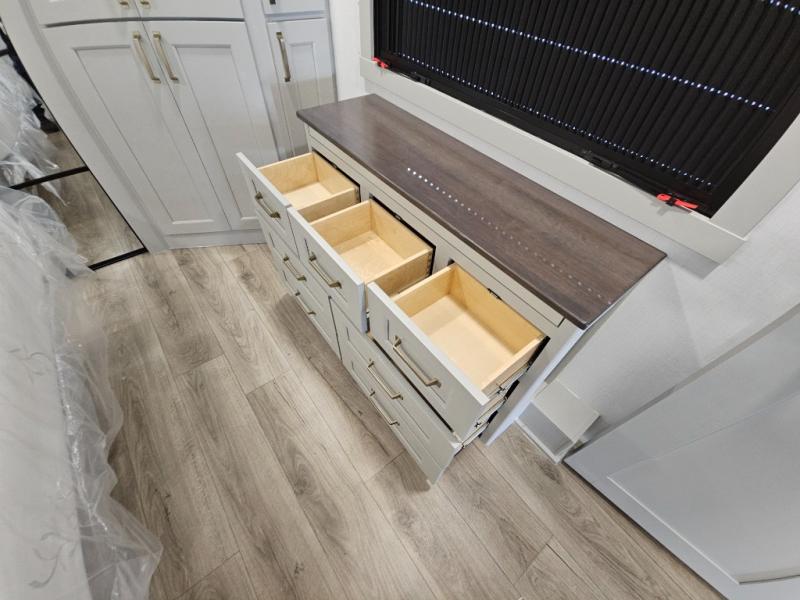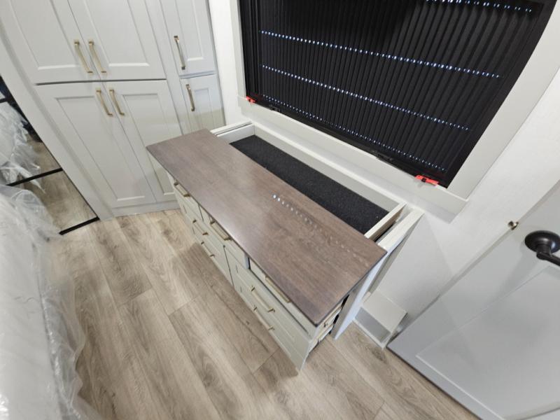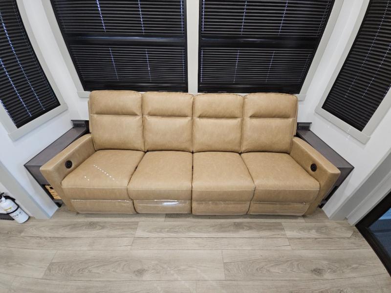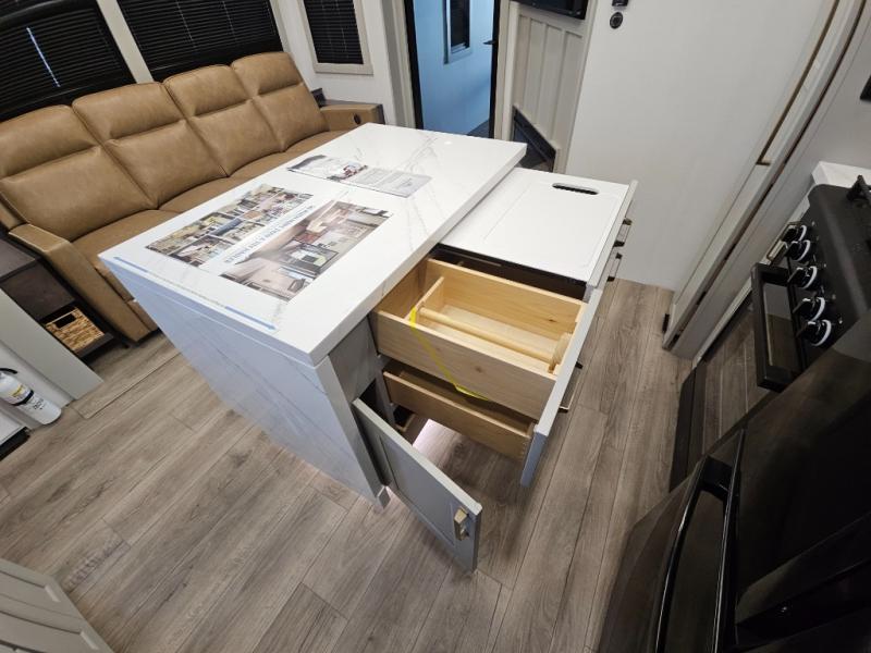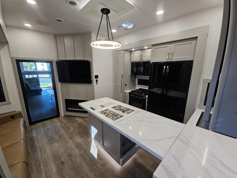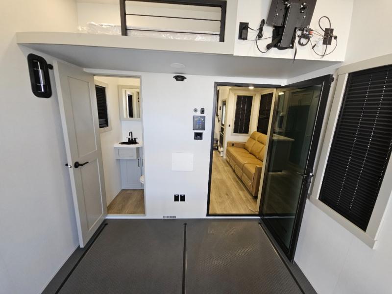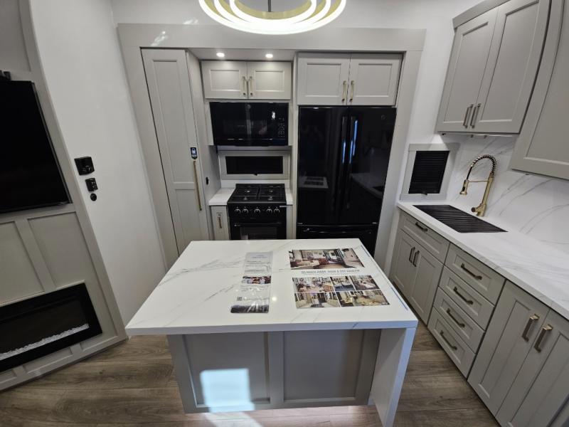 Prepare to be amazed by all the features packed into this toy hauler! There are triple slides that will provide your crew with more space, a 16' separate garage flex area that can sleep five with the loft included, plus a bath and a half for added convenience. The chef in your group will love the middle kitchen with a waterfall island that converts to a counter peninsula, a pull-out pantry, a GE Energy Star 19 cu. ft. refrigerator with ice and filtered water, and much more. In the combined kitchen and living area you'll find a spacious sofa with heat and massage, a fireplace, a TV, plus convenient dog bowls and shoe storage. After your toys are unloaded from the garage, you can relax on the independent dual couches with a Fold-N-Stow table in between. You will find the front private bedroom with a king bed slide out will provide a great night's rest, and you'll also find a walk-in closet, under-bed storage, and a sliding dresser top with hidden storage for special belongings.