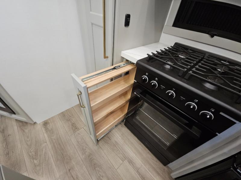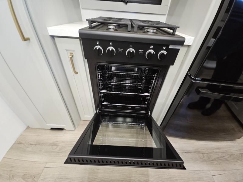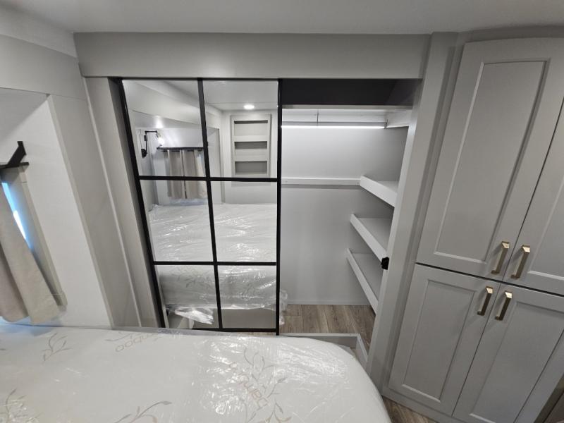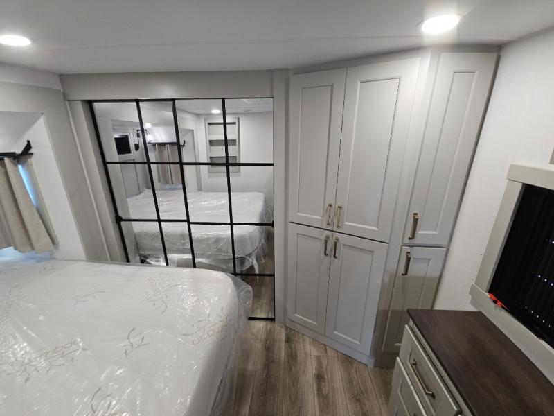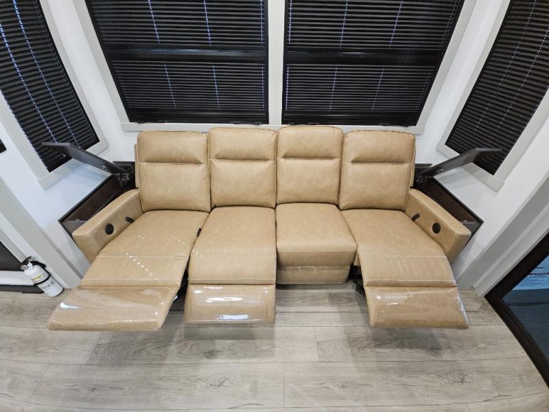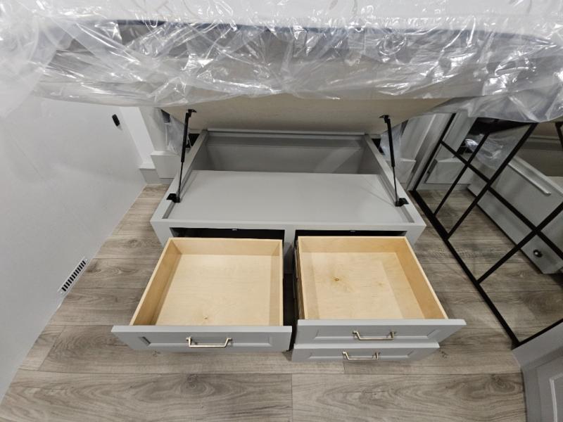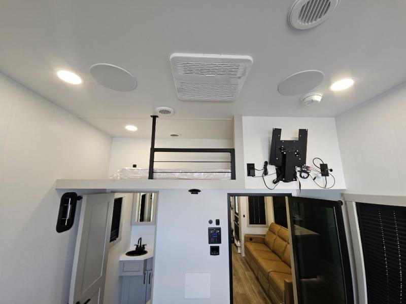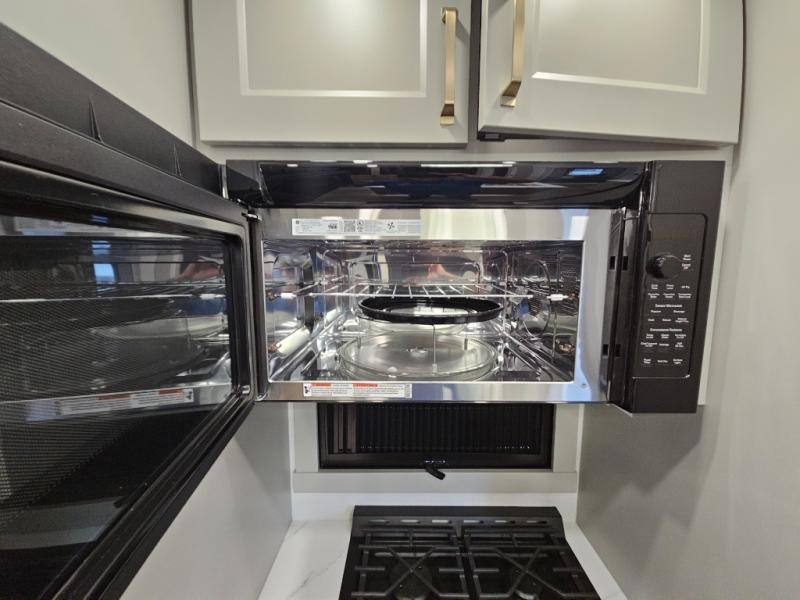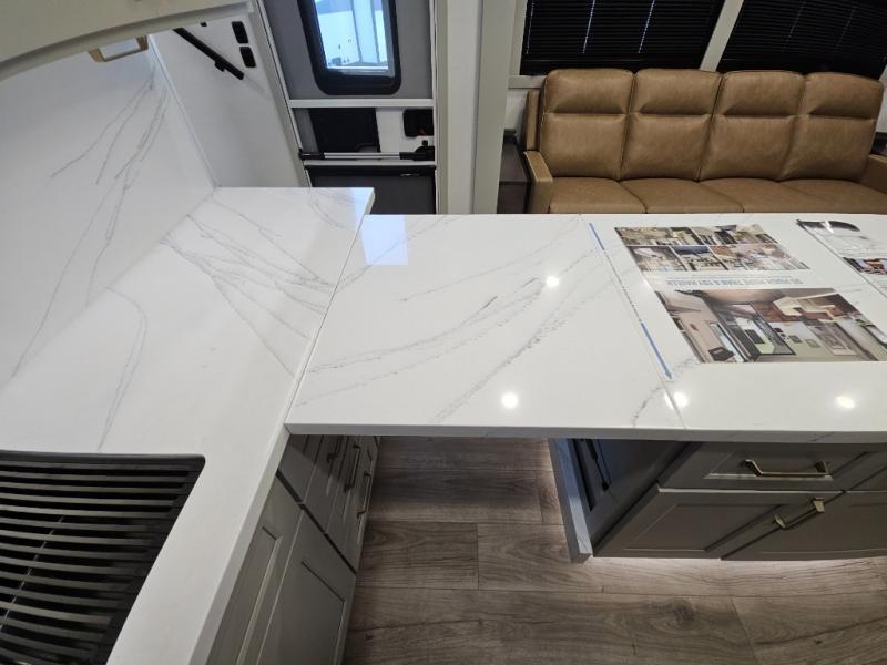 Prepare to be amazed by all the features packed into this toy hauler! There are triple slides that will provide your crew with more space, a 16' separate garage flex area that can sleep five with the loft included, plus a bath and a half for added convenience. The chef in your group will love the middle kitchen with a waterfall island that converts to a counter peninsula, a pull-out pantry, a GE Energy Star 19 cu. ft. refrigerator with ice and filtered water, and much more. In the combined kitchen and living area you'll find a spacious sofa with heat and massage, a fireplace, a TV, plus convenient dog bowls and shoe storage. After your toys are unloaded from the garage, you can relax on the independent dual couches with a Fold-N-Stow table in between. You will find the front private bedroom with a king bed slide out will provide a great night's rest, and you'll also find a walk-in closet, under-bed storage, and a sliding dresser top with hidden storage for special belongings.
