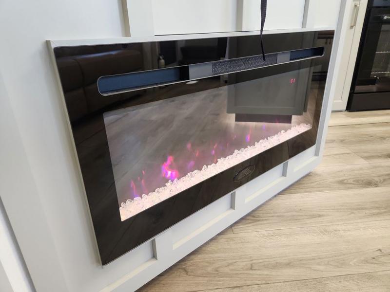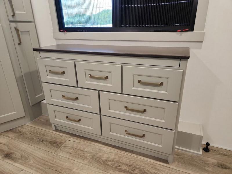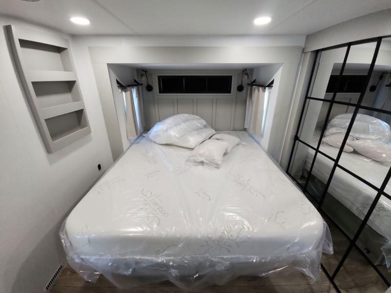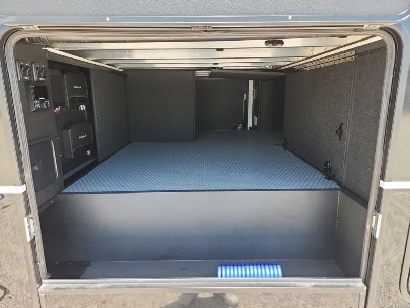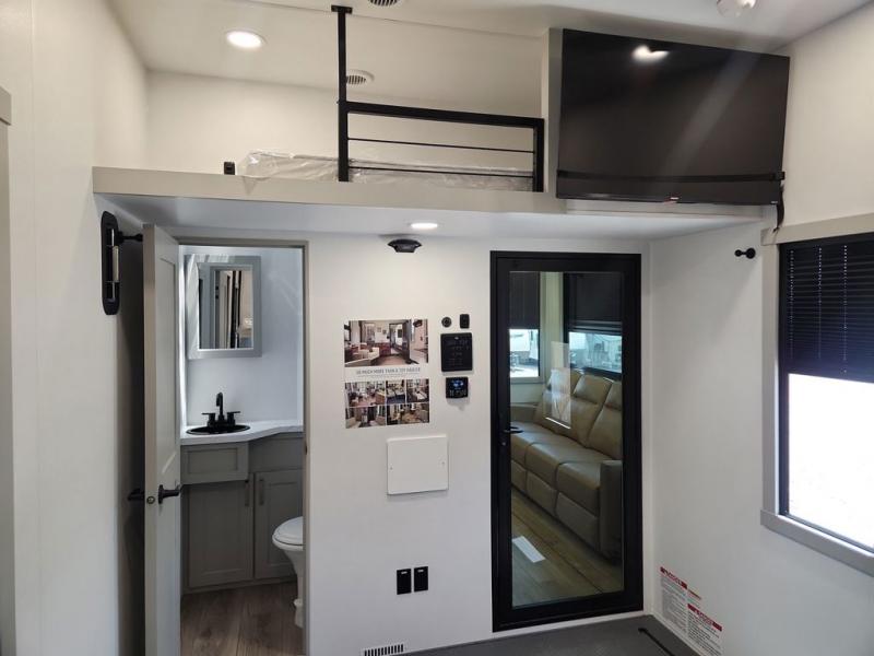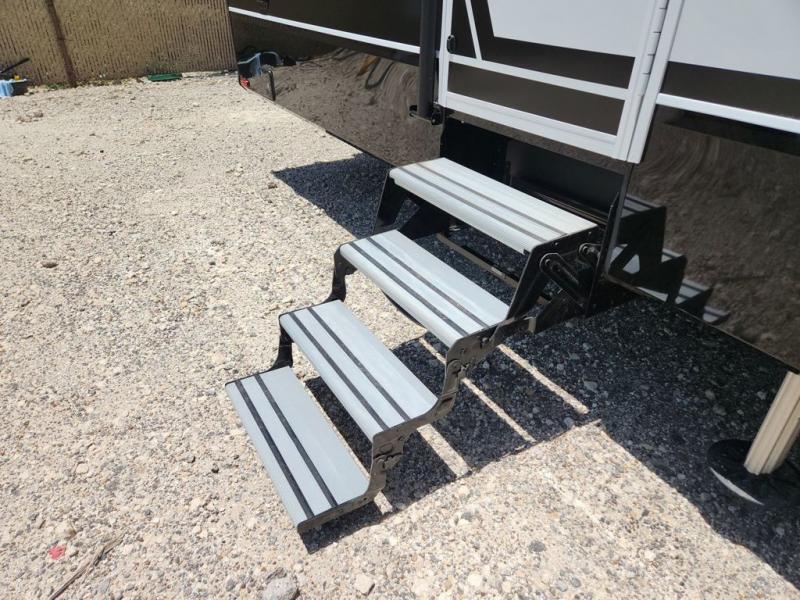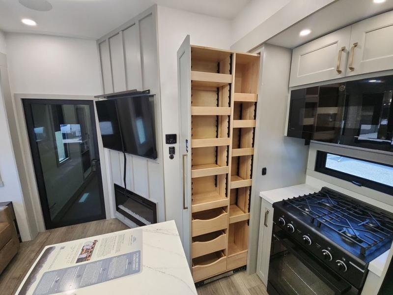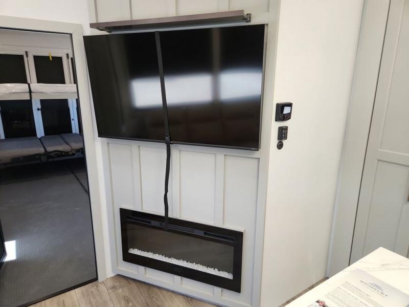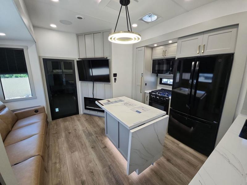 Prepare to be amazed by all the features packed into this toy hauler! There are triple slides that will provide your crew with more space, a 16' separate garage flex area that can sleep five with the loft included, plus a bath and a half for added convenience. The chef in your group will love the middle kitchen with a waterfall island that converts to a counter peninsula, a pull-out pantry, a GE Energy Star 19 cu. ft. refrigerator with ice and filtered water, and much more. In the combined kitchen and living area you'll find a spacious sofa with heat and massage, a fireplace, a TV, plus convenient dog bowls and shoe storage. After your toys are unloaded from the garage, you can relax on the independent dual couches with a Fold-N-Stow table in between. You will find the front private bedroom with a king bed slide out will provide a great night's rest, and you'll also find a walk-in closet, under-bed storage, and a sliding dresser top with hidden storage for special belongings.