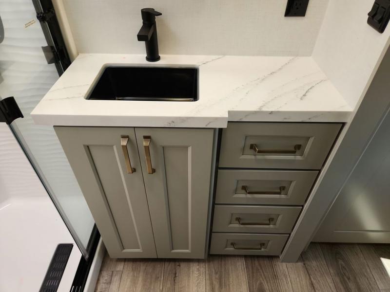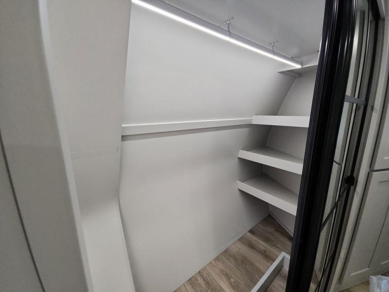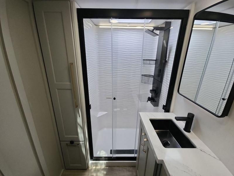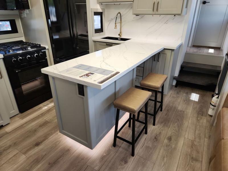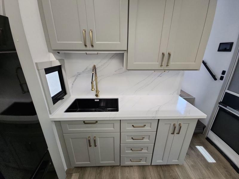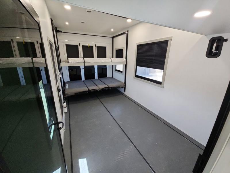 With any Model G toy hauler fifth wheel by Brinkley you will enjoy luxurious amenities, tons of storage space, and innovative features that have been developed and tested in the real world. Durable construction includes an industry leading PDI process, an industry best insulation package, and reinforced and walkable slide roofs. Some of the exterior features you'll find are a 3-way pass-through with a multi-functional flip-up bulkhead wall, under I-beam storage, a MAX-Vision reverse lighting system, and a low-maintenance roof to name a few. A Rockford Fosgate audio system comes standard, along with a OneControl app system that lets you control your fifth wheel's functions right from your mobile device. You will find the solar system with a designated storage area to be ultra convenient, plus there is a FlexPower 5500 with a dual fuel inverter generator for all your power needs. Head inside to find a residential interior with Brinkley's CraftSense wood trim construction, floating entrance steps, integrated window screens and insulated blackout blinds, and residential solid surface countertops plus backsplash. You will also enjoy the neon shower lighting and recessed medicine cabinets in the bath, plus motion activated LED bed lights and dual bedside outlets in the bedroom. Choose a Model G toy hauler fifth wheel to experience all the luxury it has to offer!