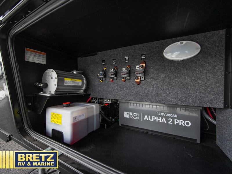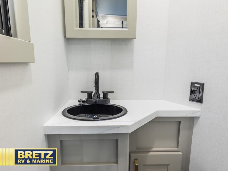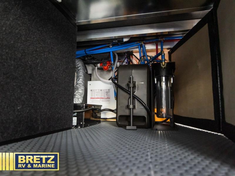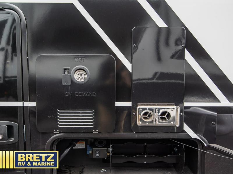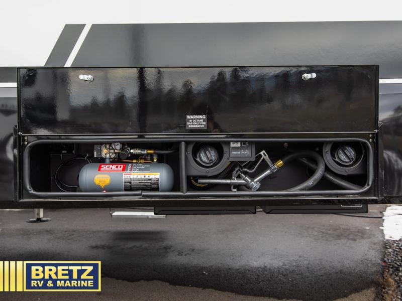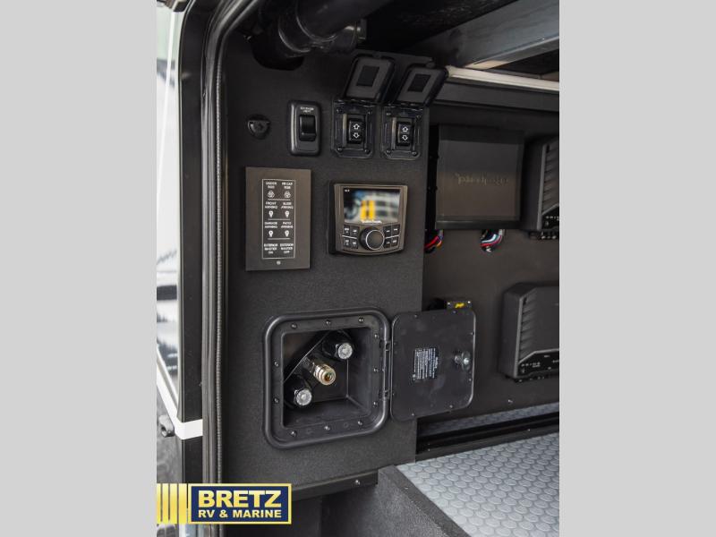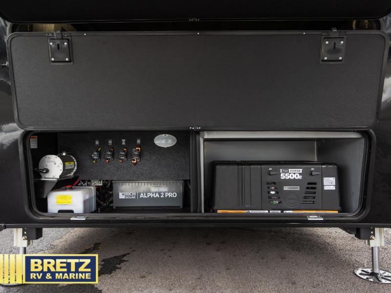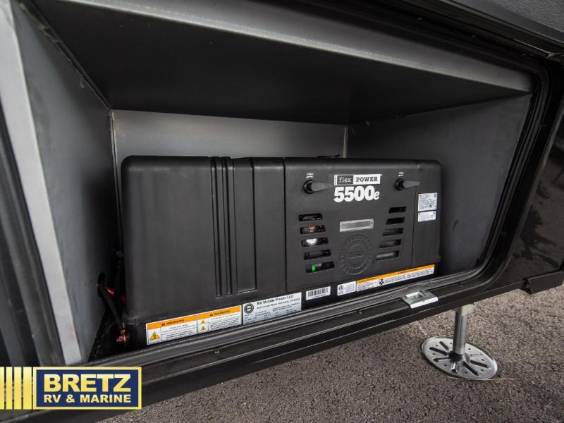 With any Model G toy hauler fifth wheel by Brinkley you will enjoy luxurious amenities, tons of storage space, and innovative features that have been developed and tested in the real world. Durable construction includes an industry leading PDI process, an industry best insulation package, and reinforced and walkable slide roofs. Some of the exterior features you'll find are a 3-way pass-through with a multi-functional flip-up bulkhead wall, under I-beam storage, a MAX-Vision reverse lighting system, and a low-maintenance roof to name a few. A Rockford Fosgate audio system comes standard, along with a OneControl app system that lets you control your fifth wheel's functions right from your mobile device. You will find the solar system with a designated storage area to be ultra convenient, plus there is a FlexPower 5500 with a dual fuel inverter generator for all your power needs. Head inside to find a residential interior with Brinkley's CraftSense wood trim construction, floating entrance steps, integrated window screens and insulated blackout blinds, and residential solid surface countertops plus backsplash. You will also enjoy the neon shower lighting and recessed medicine cabinets in the bath, plus motion activated LED bed lights and dual bedside outlets in the bedroom. Choose a Model G toy hauler fifth wheel to experience all the luxury it has to offer!