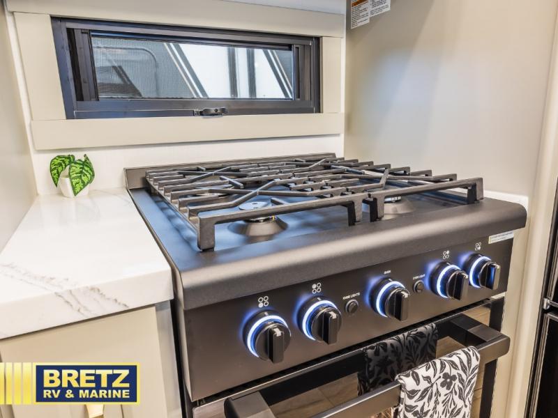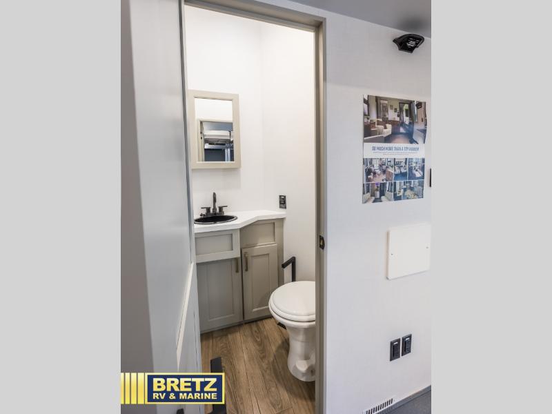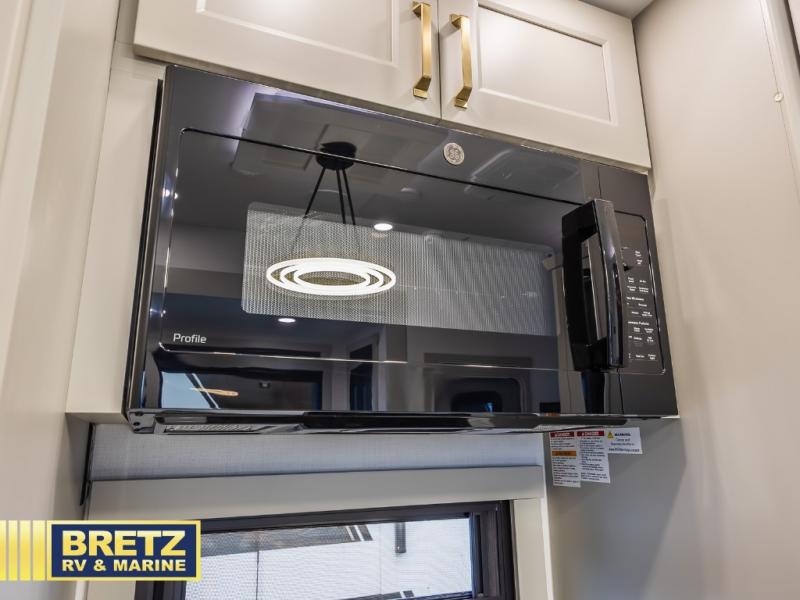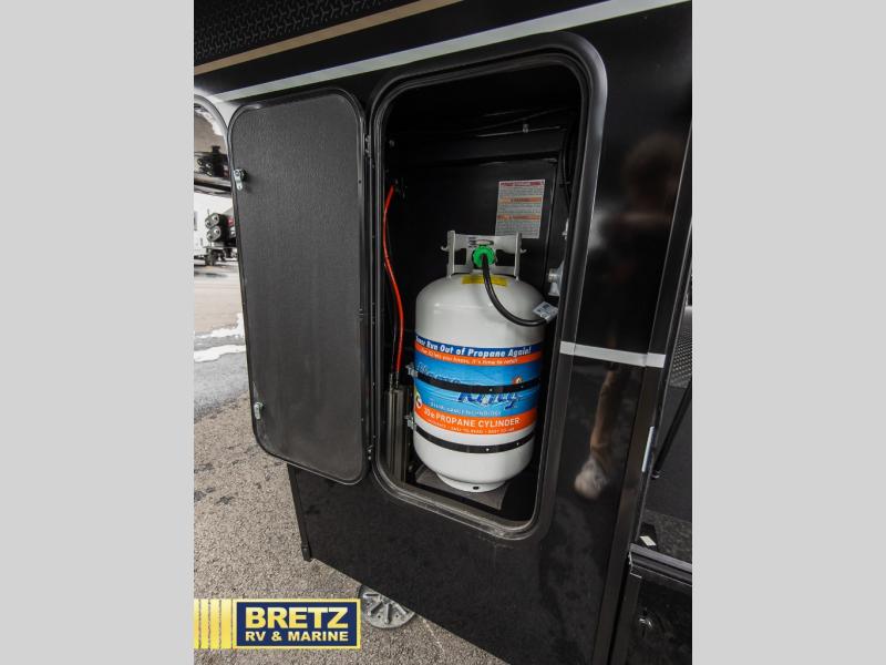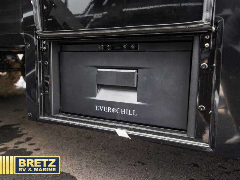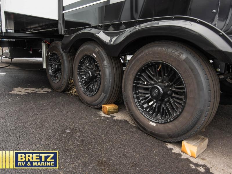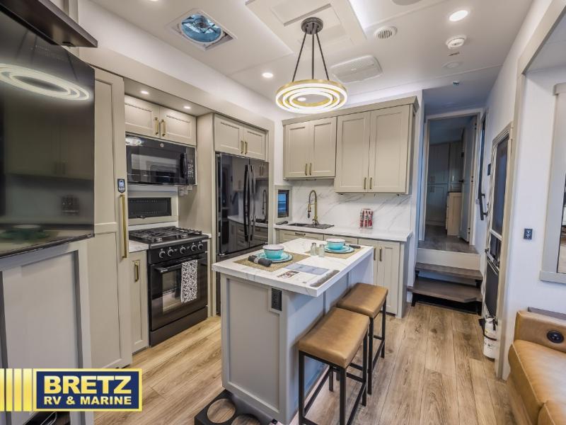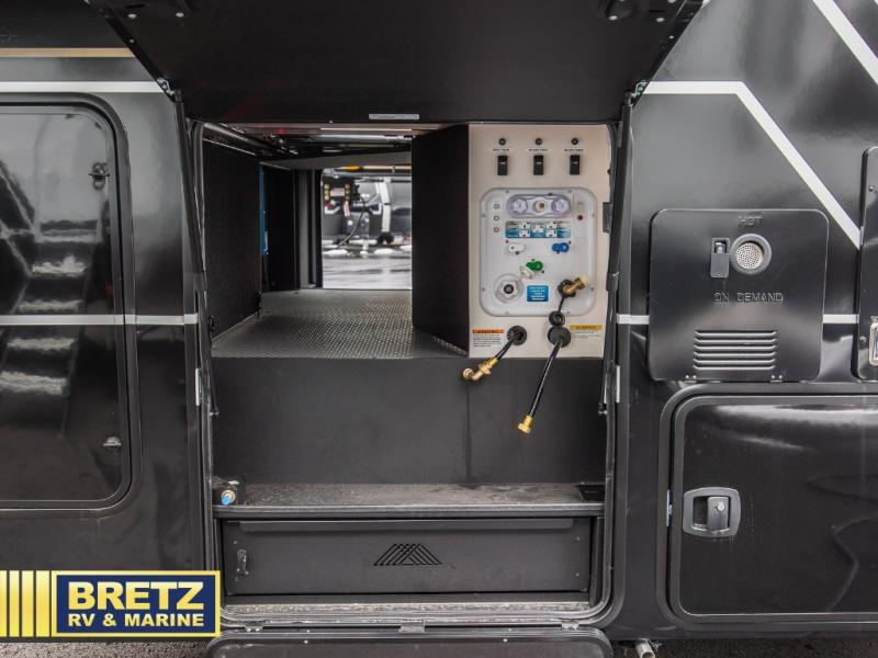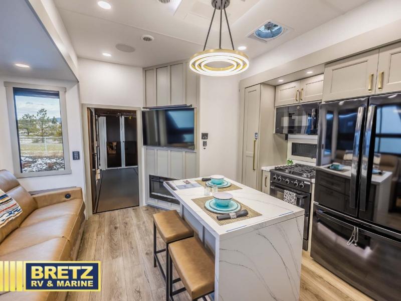 Prepare to be amazed by all the features packed into this toy hauler! There are triple slides that will provide your crew with more space, a 16' separate garage flex area that can sleep five with the loft included, plus a bath and a half for added convenience. The chef in your group will love the middle kitchen with a waterfall island that converts to a counter peninsula, a pull-out pantry, a GE Energy Star 19 cu. ft. refrigerator with ice and filtered water, and much more. In the combined kitchen and living area you'll find a spacious sofa with heat and massage, a fireplace, a TV, plus convenient dog bowls and shoe storage. After your toys are unloaded from the garage, you can relax on the independent dual couches with a Fold-N-Stow table in between. You will find the front private bedroom with a king bed slide out will provide a great night's rest, and you'll also find a walk-in closet, under-bed storage, and a sliding dresser top with hidden storage for special belongings.