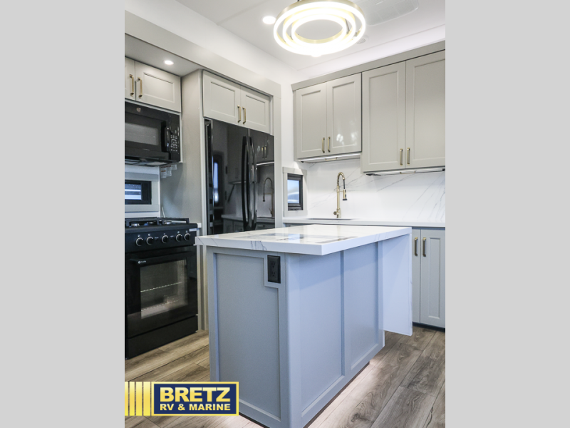 Prepare to be amazed by all the features packed into this toy hauler! There are triple slides that will provide your crew with more space, a 16' separate garage flex area that can sleep five with the loft included, plus a bath and a half for added convenience. The chef in your group will love the middle kitchen with a waterfall island that converts to a counter peninsula, a pull-out pantry, a GE Energy Star 19 cu. ft. refrigerator with ice and filtered water, and much more. In the combined kitchen and living area you'll find a spacious sofa with heat and massage, a fireplace, a TV, plus convenient dog bowls and shoe storage. After your toys are unloaded from the garage, you can relax on the independent dual couches with a Fold-N-Stow table in between. You will find the front private bedroom with a king bed slide out will provide a great night's rest, and you'll also find a walk-in closet, under-bed storage, and a sliding dresser top with hidden storage for special belongings.