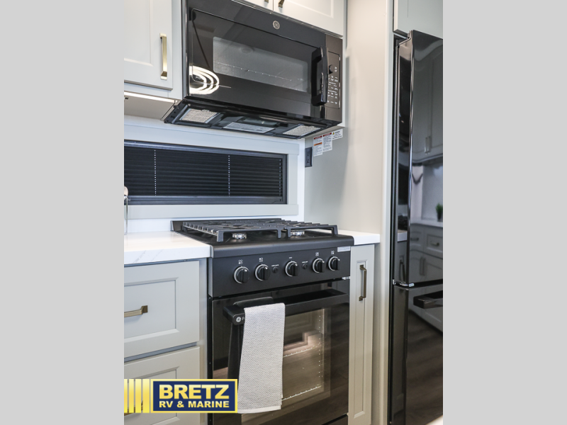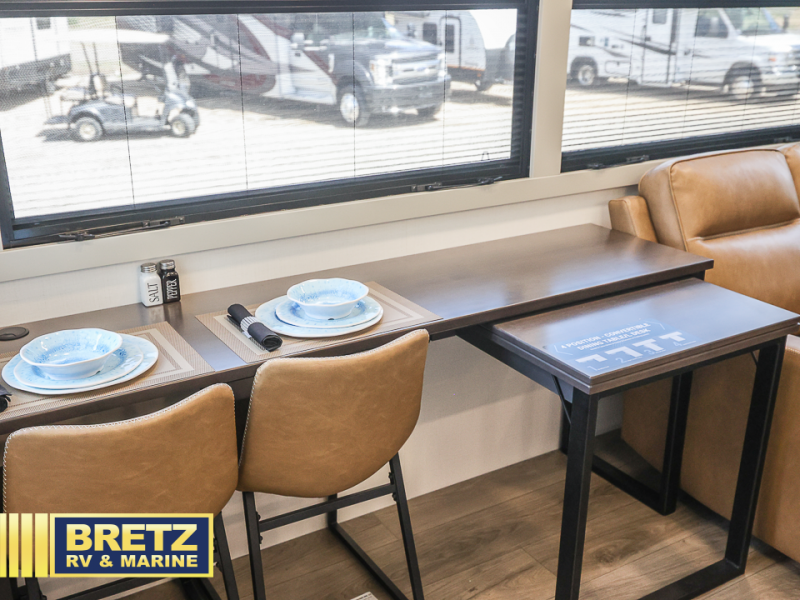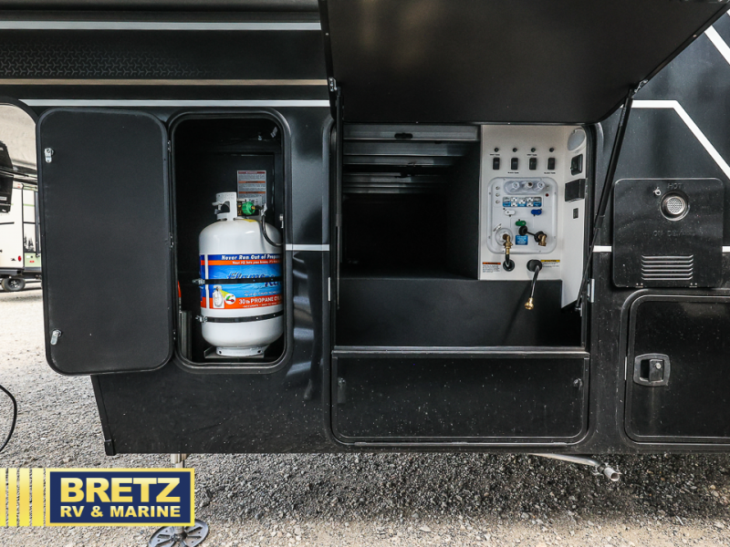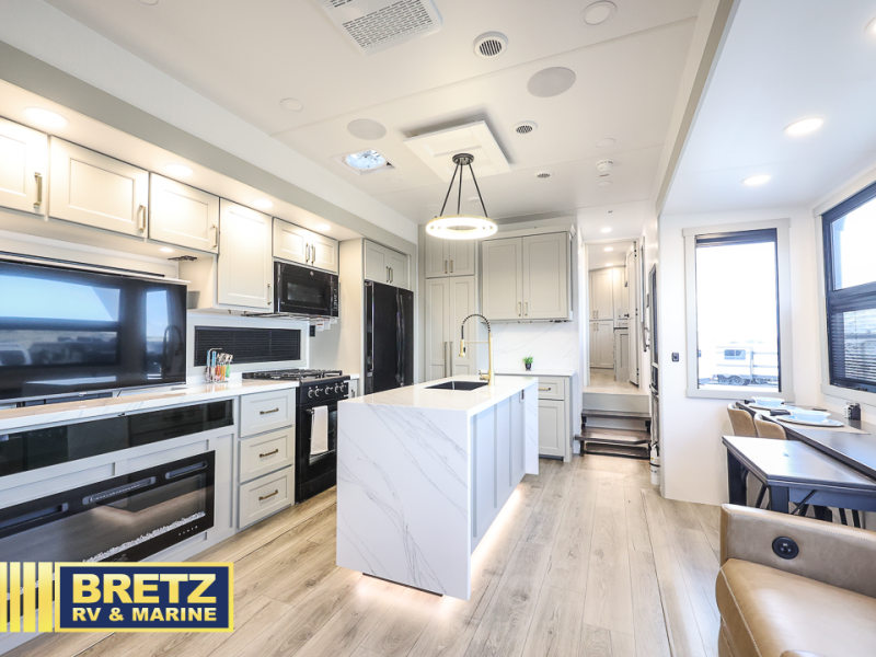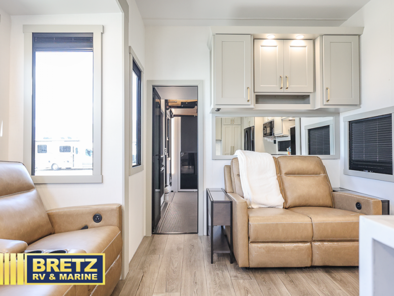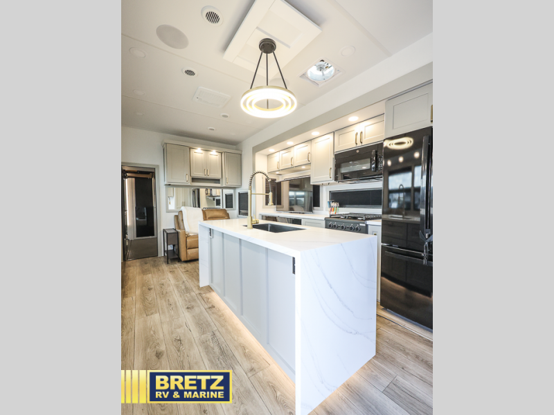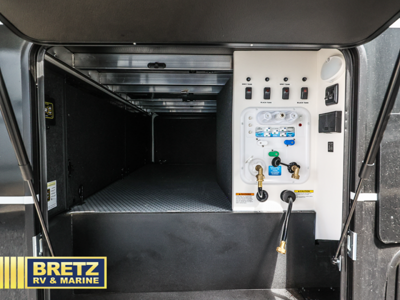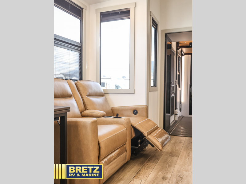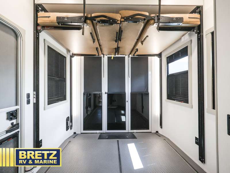 The front bedroom is a serene retreat, featuring a plush king bed, spacious walk-in closet, 32” smart TV, sliding dresser top, and hidden storage for better organization.The bathroom is a haven of convenience, boasting a full bathroom with pull-out linen and trash bin, and a spacious 30 x 42 shower. Perfect for freshening up after a long day of adventure! The kitchen has a pantry featuring adjustable shelving, a hutch, 19 cu. refrigerator, microwave, four-burner cooktop, kitchen island, and convertible dining table/L-desk. Plus, pet bowls for your furry friends! Gather with family and friends in the living room, which features a dual sofa with two recliners, each with heat and massage functions, a televator, and a cozy fireplace. It's the perfect spot to relax and unwind! The garage has a half bathroom, two sofas, and a 43” smart TV, ideal for game days, movie nights, or just relaxing with friends. Outside, enjoy the convenience of a fuel station, three-way pass-thru storage, and LP quick connect. Whether you're an adventure-seeker, or just love to travel in style, this toy hauler has everything you need and more!