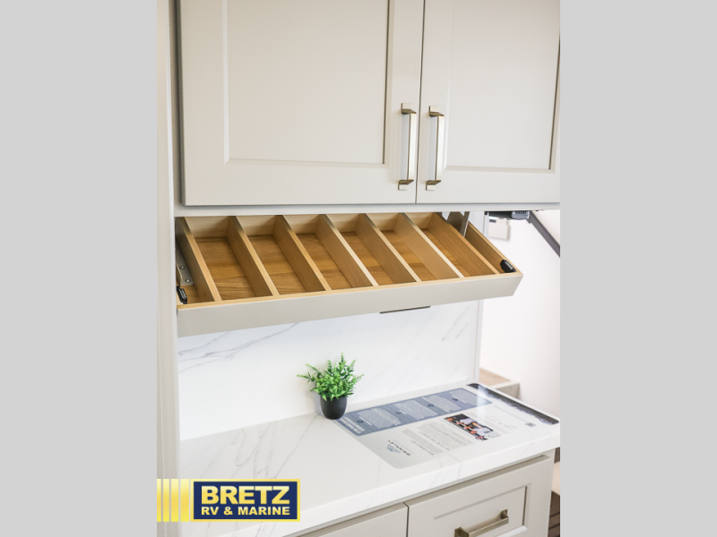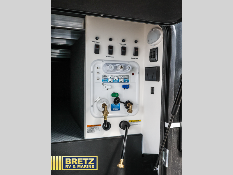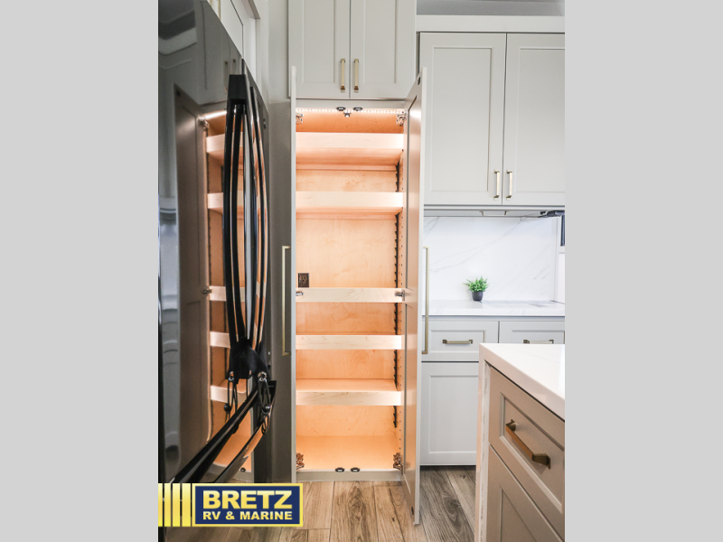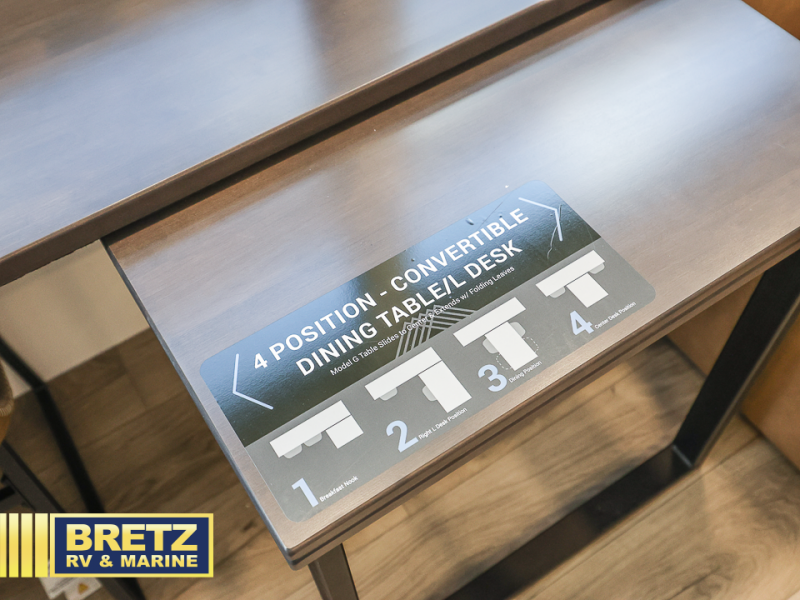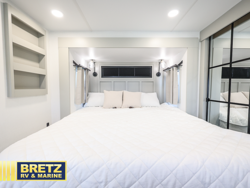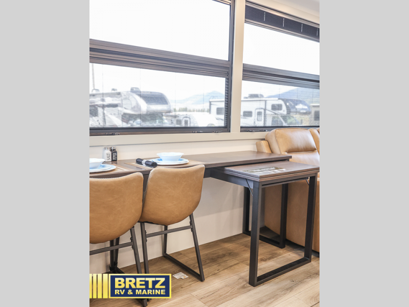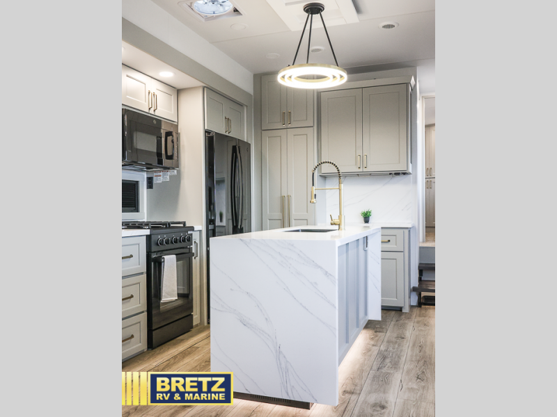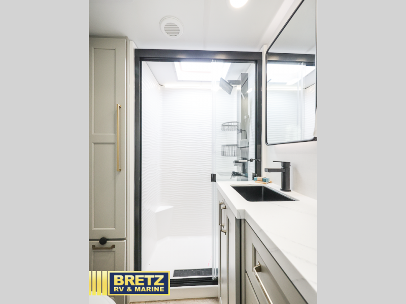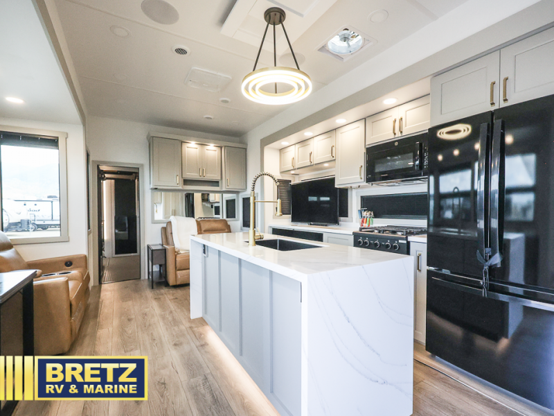 The front bedroom is a serene retreat, featuring a plush king bed, spacious walk-in closet, 32” smart TV, sliding dresser top, and hidden storage for better organization.The bathroom is a haven of convenience, boasting a full bathroom with pull-out linen and trash bin, and a spacious 30 x 42 shower. Perfect for freshening up after a long day of adventure! The kitchen has a pantry featuring adjustable shelving, a hutch, 19 cu. refrigerator, microwave, four-burner cooktop, kitchen island, and convertible dining table/L-desk. Plus, pet bowls for your furry friends! Gather with family and friends in the living room, which features a dual sofa with two recliners, each with heat and massage functions, a televator, and a cozy fireplace. It's the perfect spot to relax and unwind! The garage has a half bathroom, two sofas, and a 43” smart TV, ideal for game days, movie nights, or just relaxing with friends. Outside, enjoy the convenience of a fuel station, three-way pass-thru storage, and LP quick connect. Whether you're an adventure-seeker, or just love to travel in style, this toy hauler has everything you need and more!