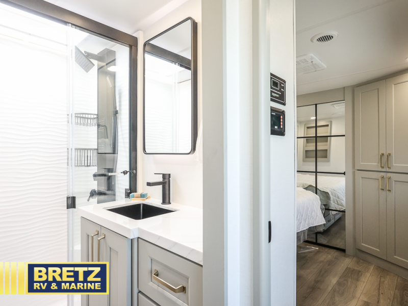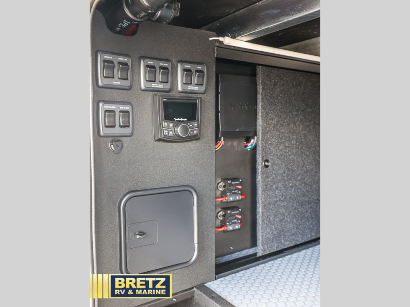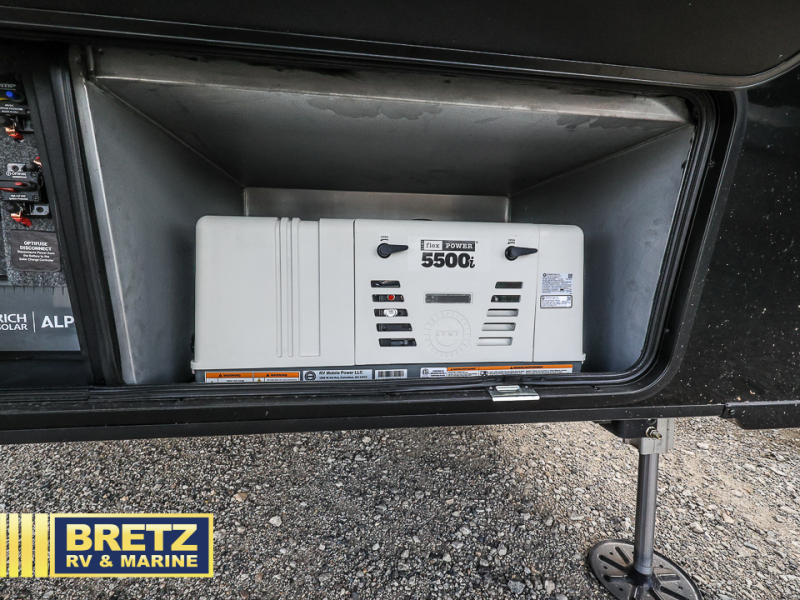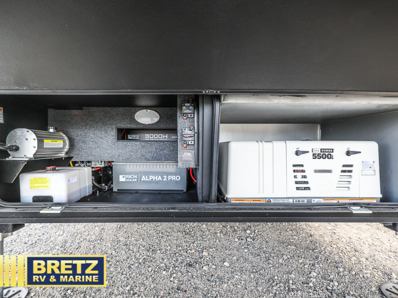 With any Model G toy hauler fifth wheel by Brinkley you will enjoy luxurious amenities, tons of storage space, and innovative features that have been developed and tested in the real world. Durable construction includes an industry leading PDI process, an industry best insulation package, and reinforced and walkable slide roofs. Some of the exterior features you'll find are a 3-way pass-through with a multi-functional flip-up bulkhead wall, under I-beam storage, a MAX-Vision reverse lighting system, and a low-maintenance roof to name a few. A Rockford Fosgate audio system comes standard, along with a OneControl app system that lets you control your fifth wheel's functions right from your mobile device. You will find the solar system with a designated storage area to be ultra convenient, plus there is a FlexPower 5500 with a dual fuel inverter generator for all your power needs. Head inside to find a residential interior with Brinkley's CraftSense wood trim construction, floating entrance steps, integrated window screens and insulated blackout blinds, and residential solid surface countertops plus backsplash. You will also enjoy the neon shower lighting and recessed medicine cabinets in the bath, plus motion activated LED bed lights and dual bedside outlets in the bedroom. Choose a Model G toy hauler fifth wheel to experience all the luxury it has to offer!