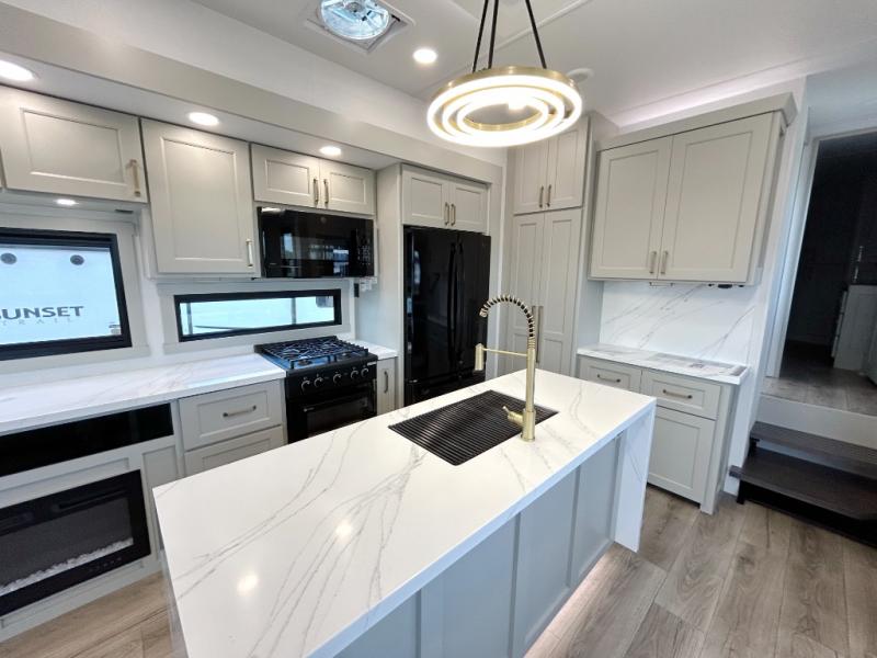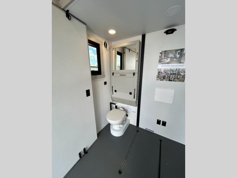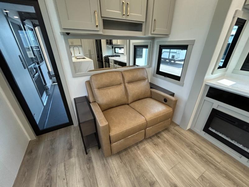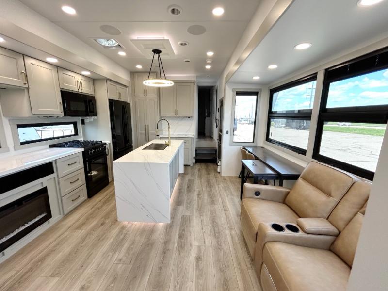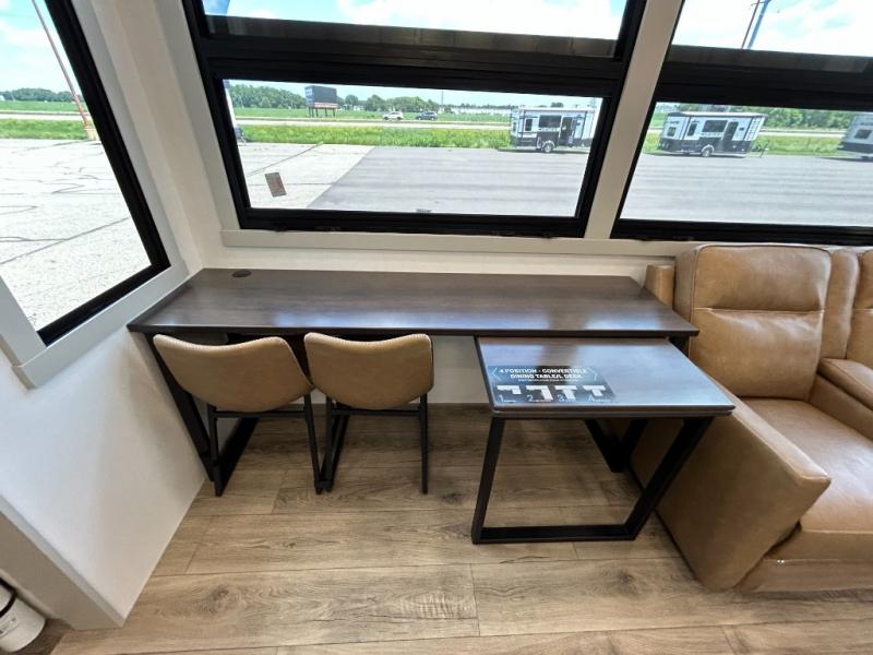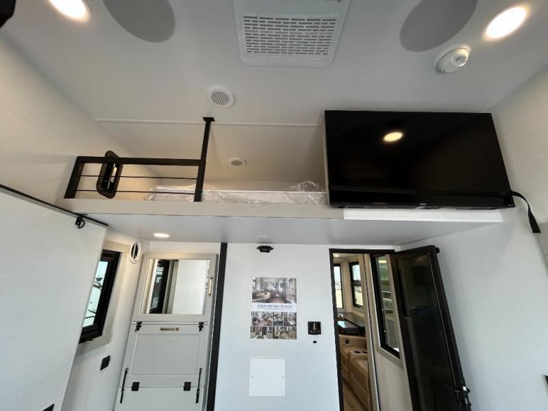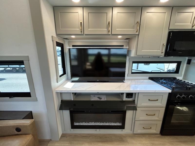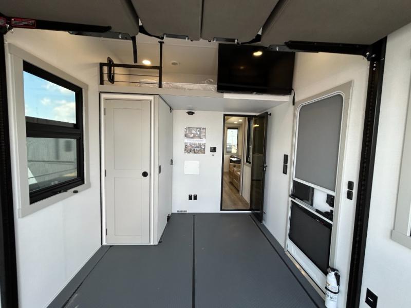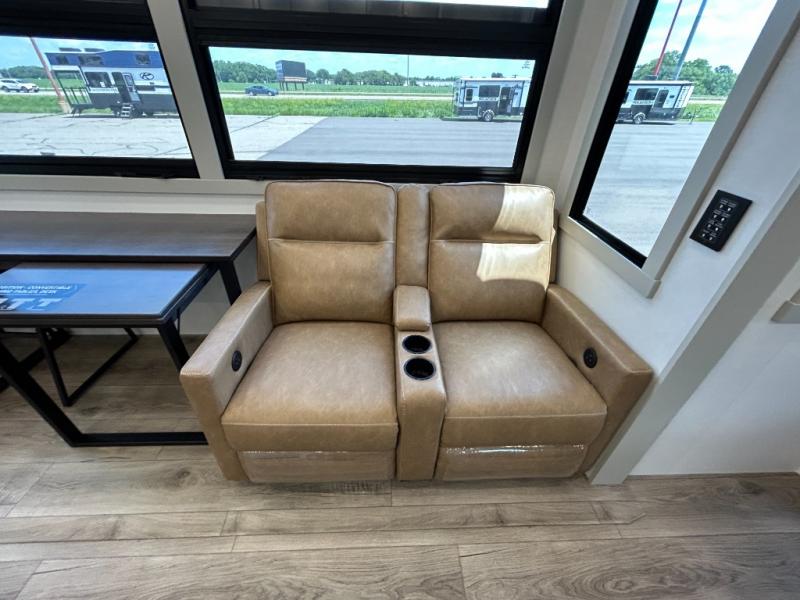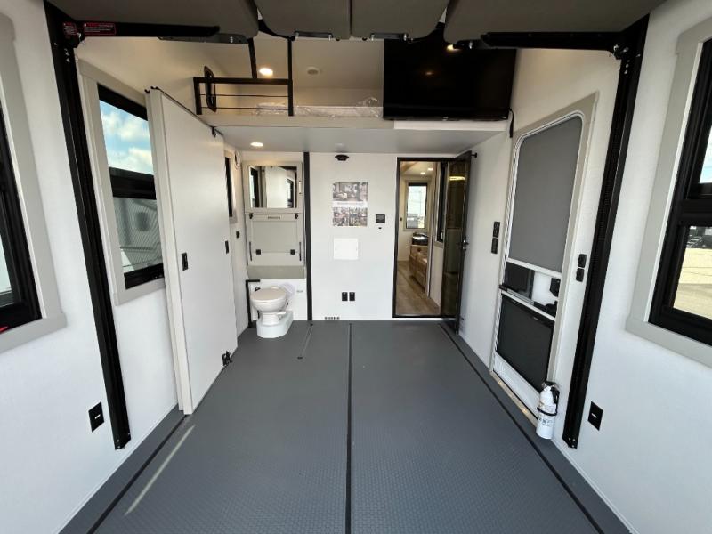 The front bedroom is a serene retreat, featuring a plush king bed, spacious walk-in closet, 32” smart TV, sliding dresser top, and hidden storage for better organization.The bathroom is a haven of convenience, boasting a full bathroom with pull-out linen and trash bin, and a spacious 30 x 42 shower. Perfect for freshening up after a long day of adventure! The kitchen has a pantry featuring adjustable shelving, a hutch, 19 cu. refrigerator, microwave, four-burner cooktop, kitchen island, and convertible dining table/L-desk. Plus, pet bowls for your furry friends! Gather with family and friends in the living room, which features a dual sofa with two recliners, each with heat and massage functions, a televator, and a cozy fireplace. It's the perfect spot to relax and unwind! The garage has a half bathroom, two sofas, and a 43” smart TV, ideal for game days, movie nights, or just relaxing with friends. Outside, enjoy the convenience of a fuel station, three-way pass-thru storage, and LP quick connect. Whether you're an adventure-seeker, or just love to travel in style, this toy hauler has everything you need and more!