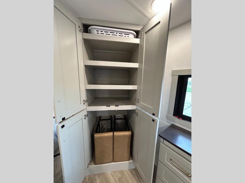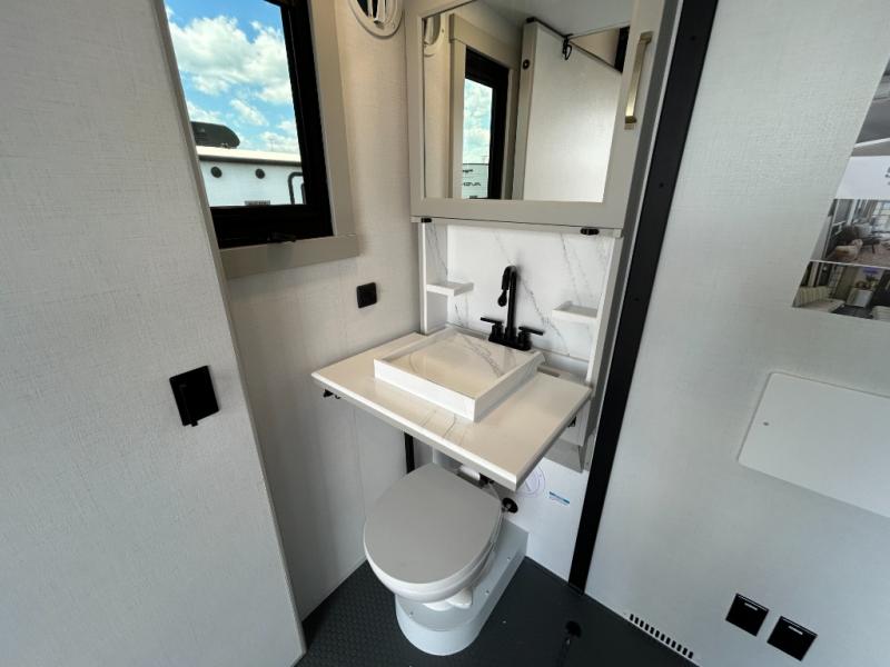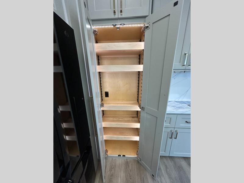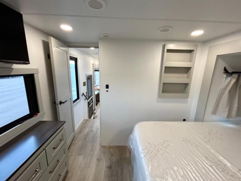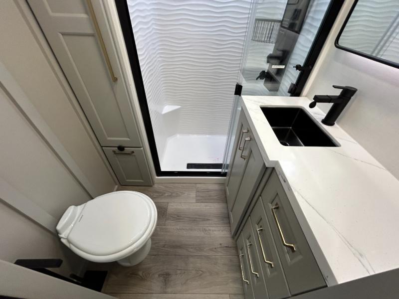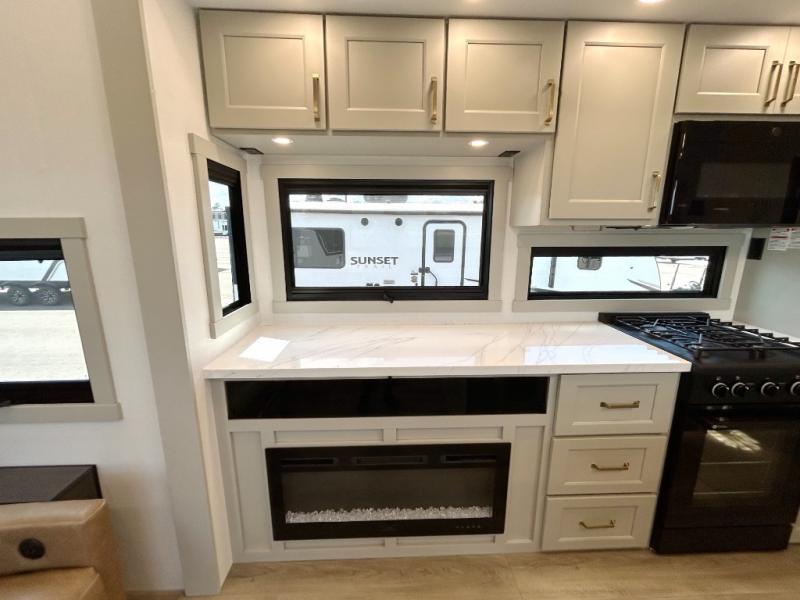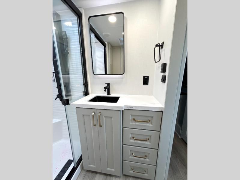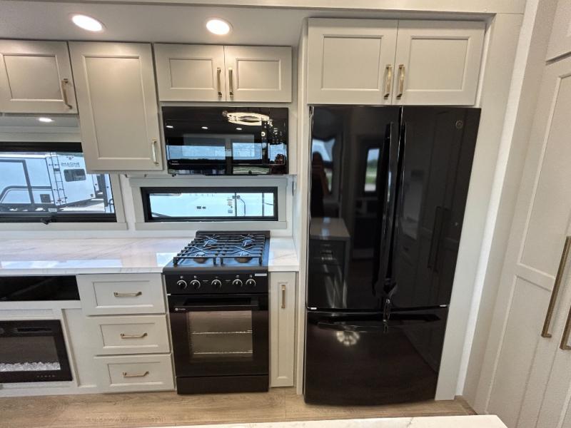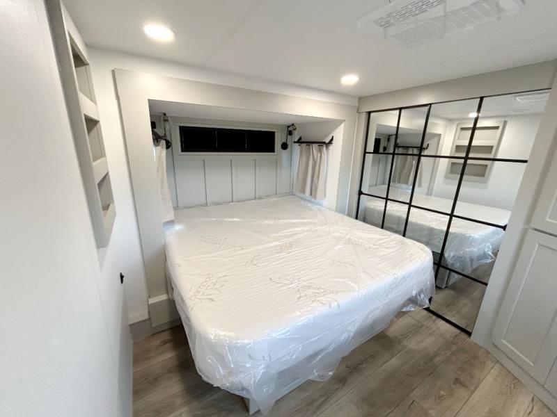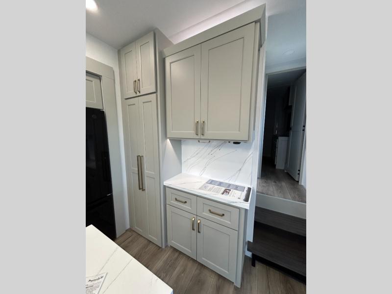 The front bedroom is a serene retreat, featuring a plush king bed, spacious walk-in closet, 32” smart TV, sliding dresser top, and hidden storage for better organization.The bathroom is a haven of convenience, boasting a full bathroom with pull-out linen and trash bin, and a spacious 30 x 42 shower. Perfect for freshening up after a long day of adventure! The kitchen has a pantry featuring adjustable shelving, a hutch, 19 cu. refrigerator, microwave, four-burner cooktop, kitchen island, and convertible dining table/L-desk. Plus, pet bowls for your furry friends! Gather with family and friends in the living room, which features a dual sofa with two recliners, each with heat and massage functions, a televator, and a cozy fireplace. It's the perfect spot to relax and unwind! The garage has a half bathroom, two sofas, and a 43” smart TV, ideal for game days, movie nights, or just relaxing with friends. Outside, enjoy the convenience of a fuel station, three-way pass-thru storage, and LP quick connect. Whether you're an adventure-seeker, or just love to travel in style, this toy hauler has everything you need and more!
