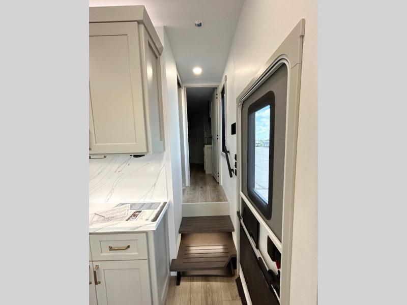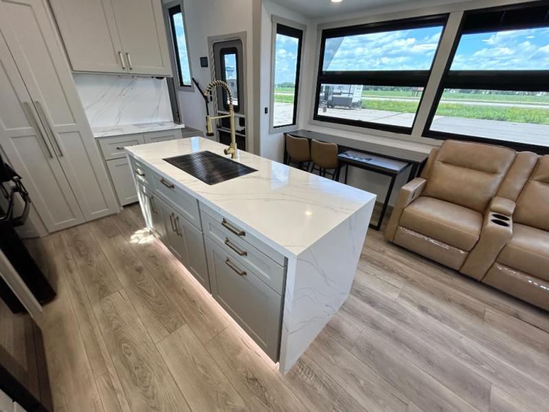 With any Model G toy hauler fifth wheel by Brinkley you will enjoy luxurious amenities, tons of storage space, and innovative features that have been developed and tested in the real world. Durable construction includes an industry leading PDI process, an industry best insulation package, and reinforced and walkable slide roofs. Some of the exterior features you'll find are a 3-way pass-through with a multi-functional flip-up bulkhead wall, under I-beam storage, a MAX-Vision reverse lighting system, and a low-maintenance roof to name a few. A Rockford Fosgate audio system comes standard, along with a OneControl app system that lets you control your fifth wheel's functions right from your mobile device. You will find the solar system with a designated storage area to be ultra convenient, plus there is a FlexPower 5500 with a dual fuel inverter generator for all your power needs. Head inside to find a residential interior with Brinkley's CraftSense wood trim construction, floating entrance steps, integrated window screens and insulated blackout blinds, and residential solid surface countertops plus backsplash. You will also enjoy the neon shower lighting and recessed medicine cabinets in the bath, plus motion activated LED bed lights and dual bedside outlets in the bedroom. Choose a Model G toy hauler fifth wheel to experience all the luxury it has to offer!