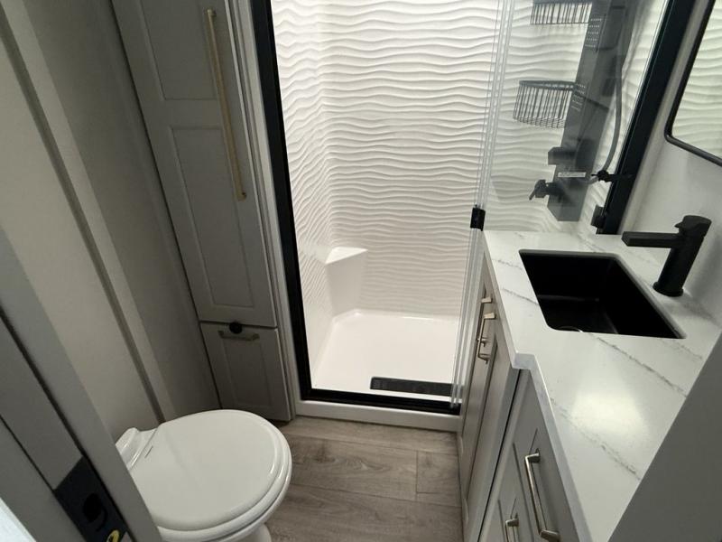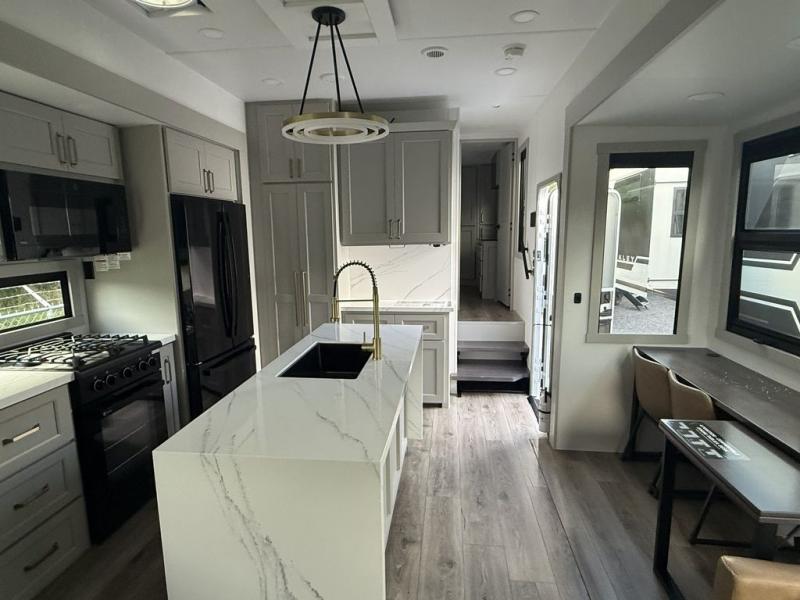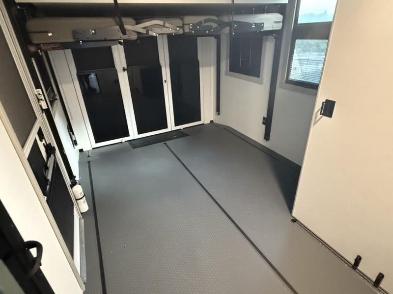 The front bedroom is a serene retreat, featuring a plush king bed, spacious walk-in closet, 32” smart TV, sliding dresser top, and hidden storage for better organization. The bathroom is a haven of convenience, boasting a full bathroom with pull-out linen and trash bin, and a spacious 30" x 42" shower. The kitchen has a pantry featuring adjustable shelving, a hutch, 19 cu. refrigerator, microwave, four-burner cooktop, kitchen island, and convertible dining table/L-desk. Gather with family and friends in the living room, which features a dual sofa with two recliners, each with heat and massage functions, a televator, and a cozy fireplace. The garage has a half bathroom, two sofas, and a 43” smart TV, ideal for game days, movie nights, or just relaxing with friends. Outside, enjoy the convenience of a fuel station, three-way pass-thru storage, and LP quick connect. Whether you're an adventure-seeker, or just love to travel in style, this toy hauler has everything you need and more!