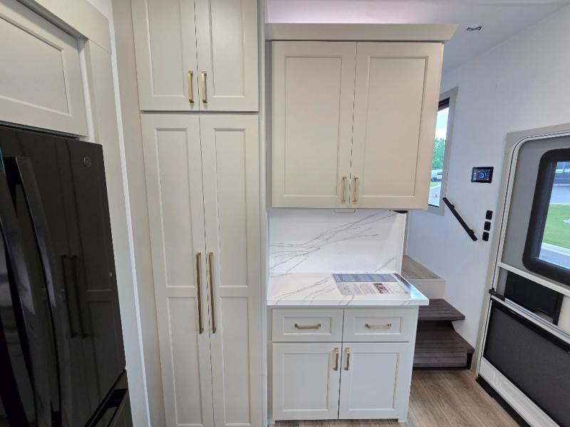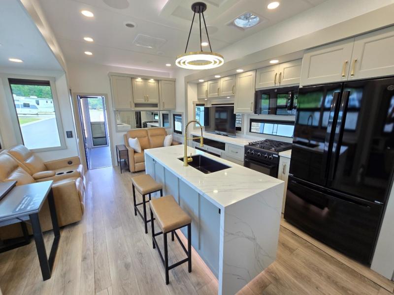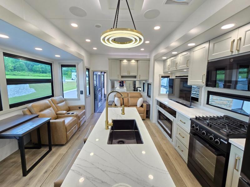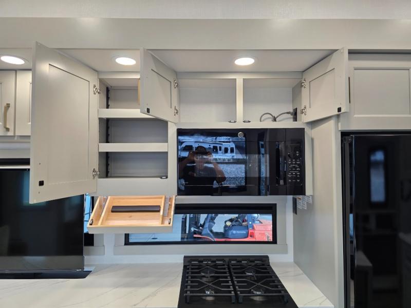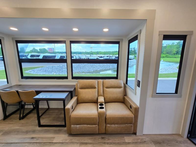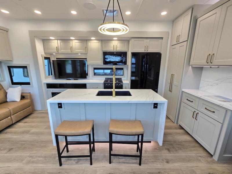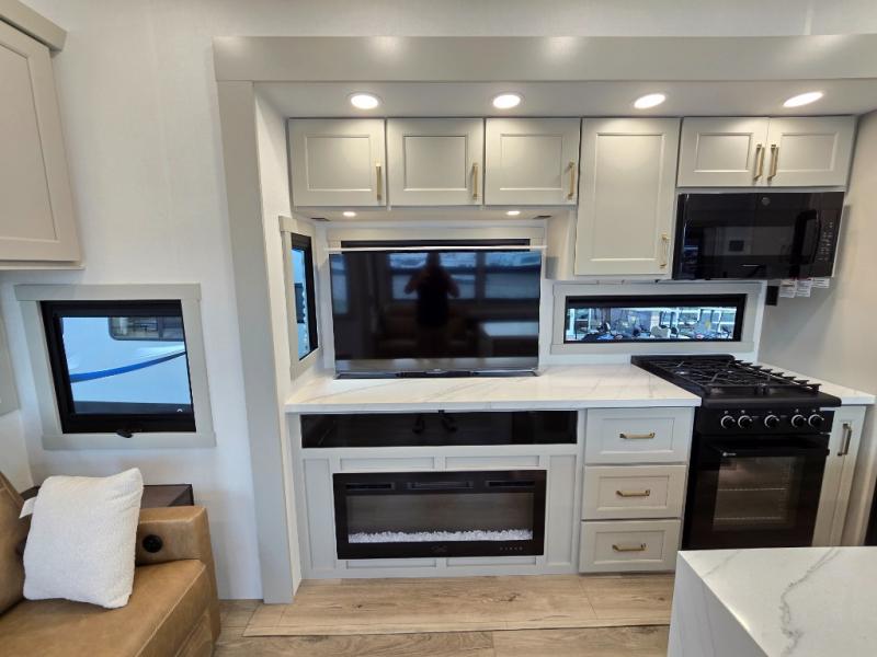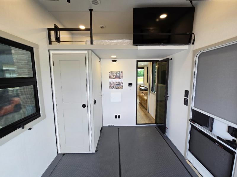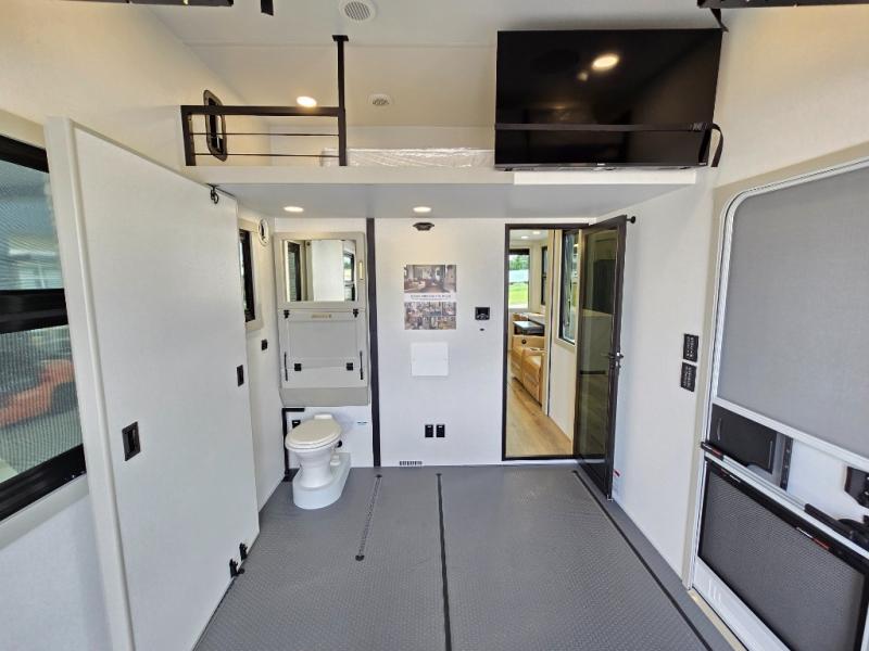 The front bedroom is a serene retreat, featuring a plush king bed, spacious walk-in closet, 32” smart TV, sliding dresser top, and hidden storage for better organization.The bathroom is a haven of convenience, boasting a full bathroom with pull-out linen and trash bin, and a spacious 30 x 42 shower. Perfect for freshening up after a long day of adventure! The kitchen has a pantry featuring adjustable shelving, a hutch, 19 cu. refrigerator, microwave, four-burner cooktop, kitchen island, and convertible dining table/L-desk. Plus, pet bowls for your furry friends! Gather with family and friends in the living room, which features a dual sofa with two recliners, each with heat and massage functions, a televator, and a cozy fireplace. It's the perfect spot to relax and unwind! The garage has a half bathroom, two sofas, and a 43” smart TV, ideal for game days, movie nights, or just relaxing with friends. Outside, enjoy the convenience of a fuel station, three-way pass-thru storage, and LP quick connect. Whether you're an adventure-seeker, or just love to travel in style, this toy hauler has everything you need and more!