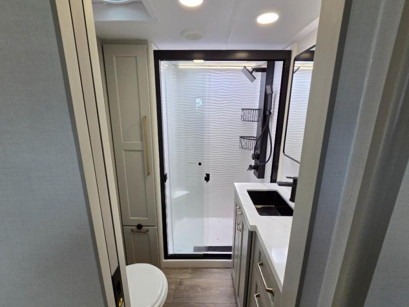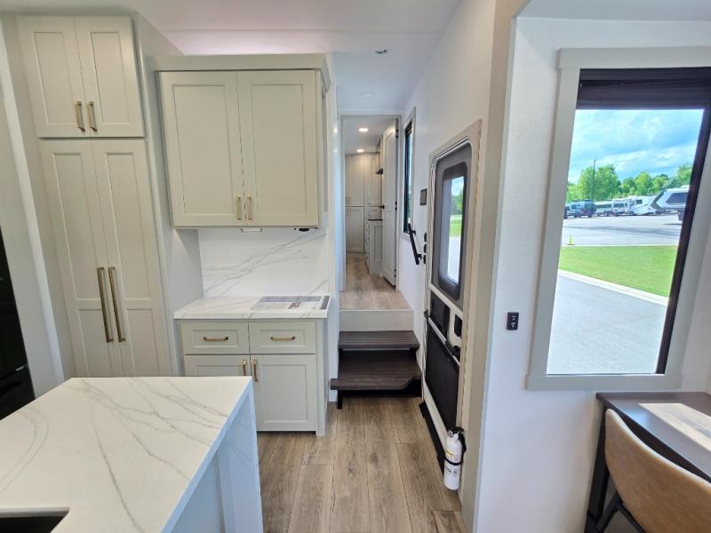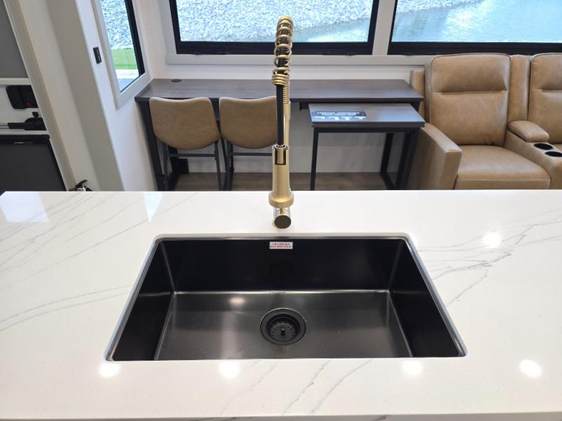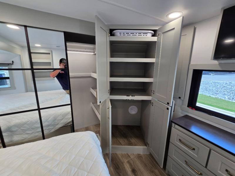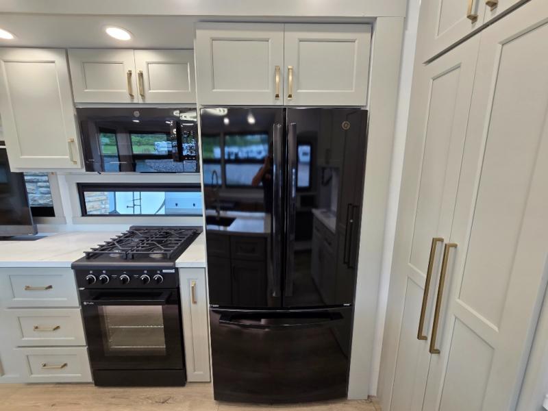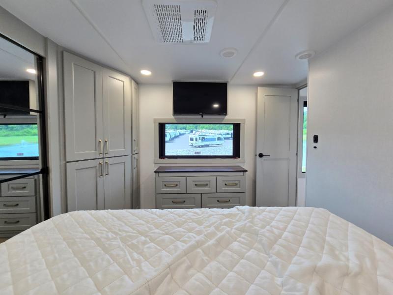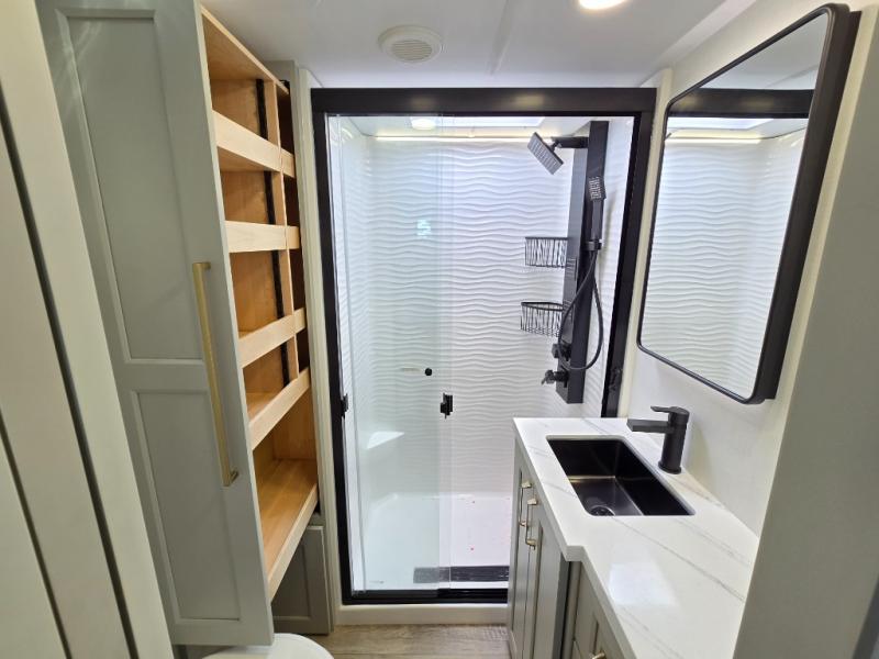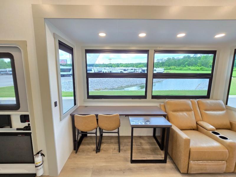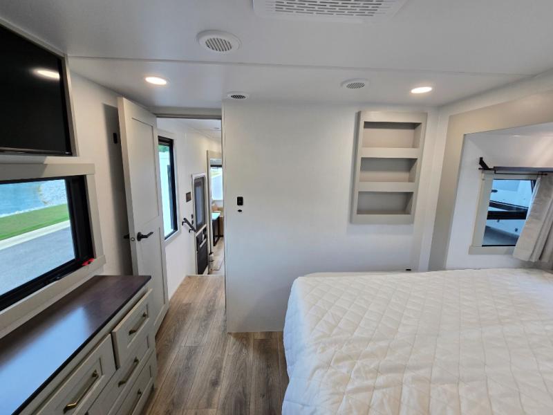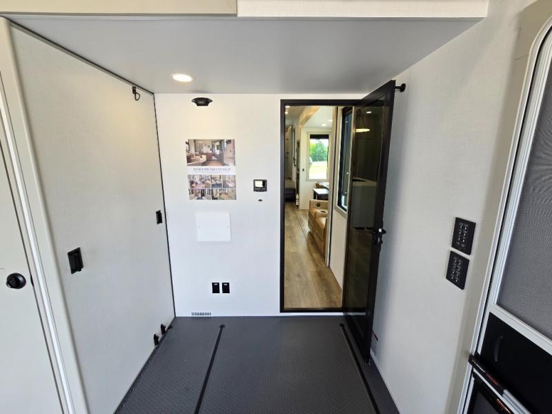 The front bedroom is a serene retreat, featuring a plush king bed, spacious walk-in closet, 32” smart TV, sliding dresser top, and hidden storage for better organization.The bathroom is a haven of convenience, boasting a full bathroom with pull-out linen and trash bin, and a spacious 30 x 42 shower. Perfect for freshening up after a long day of adventure! The kitchen has a pantry featuring adjustable shelving, a hutch, 19 cu. refrigerator, microwave, four-burner cooktop, kitchen island, and convertible dining table/L-desk. Plus, pet bowls for your furry friends! Gather with family and friends in the living room, which features a dual sofa with two recliners, each with heat and massage functions, a televator, and a cozy fireplace. It's the perfect spot to relax and unwind! The garage has a half bathroom, two sofas, and a 43” smart TV, ideal for game days, movie nights, or just relaxing with friends. Outside, enjoy the convenience of a fuel station, three-way pass-thru storage, and LP quick connect. Whether you're an adventure-seeker, or just love to travel in style, this toy hauler has everything you need and more!