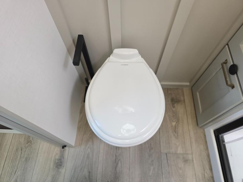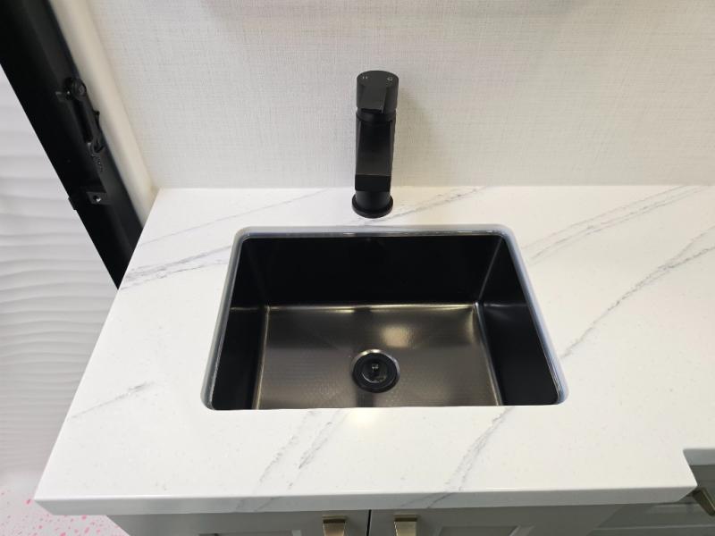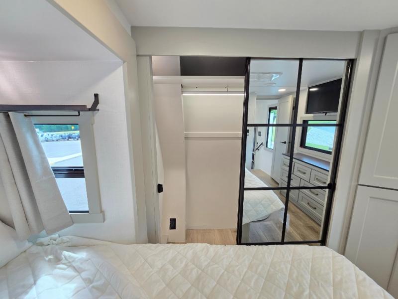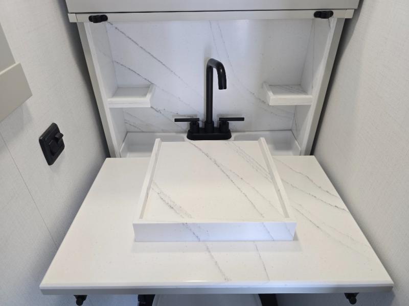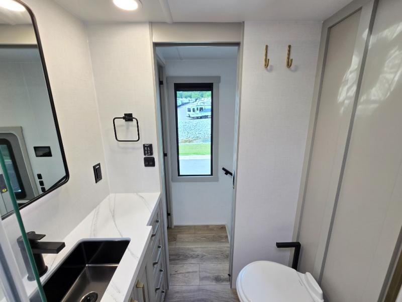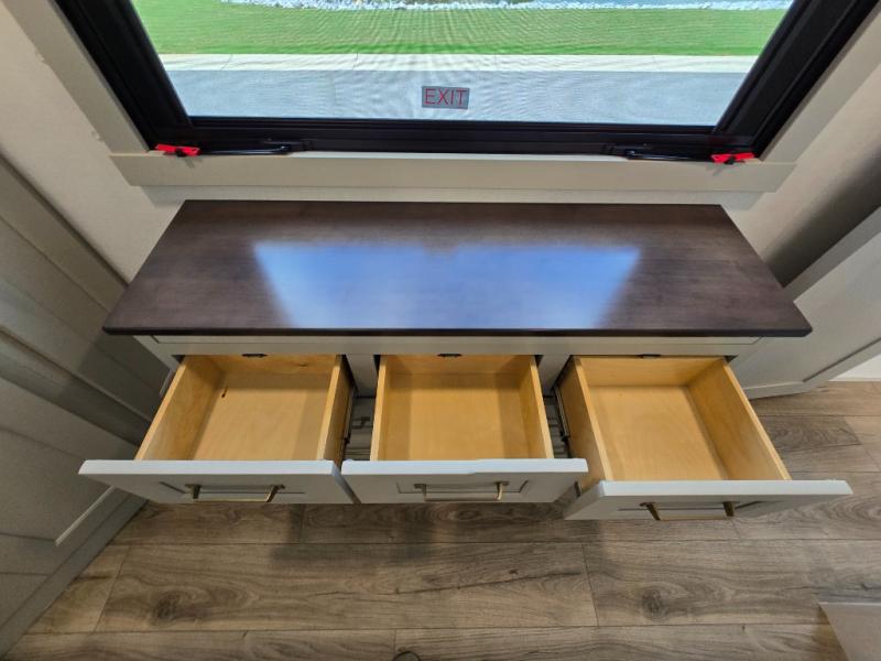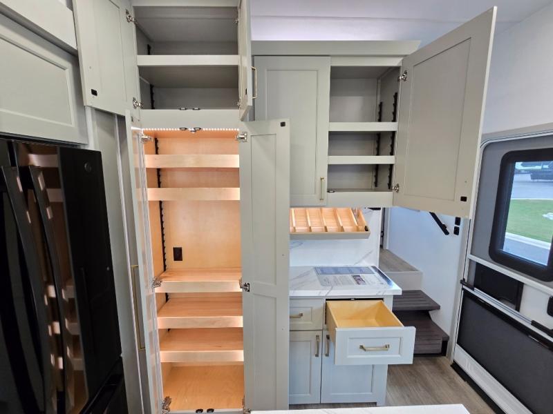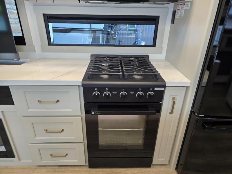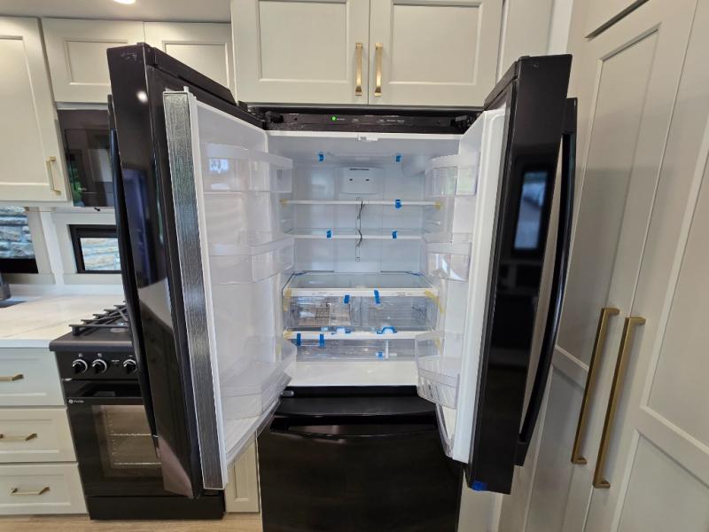 The front bedroom is a serene retreat, featuring a plush king bed, spacious walk-in closet, 32” smart TV, sliding dresser top, and hidden storage for better organization.The bathroom is a haven of convenience, boasting a full bathroom with pull-out linen and trash bin, and a spacious 30 x 42 shower. Perfect for freshening up after a long day of adventure! The kitchen has a pantry featuring adjustable shelving, a hutch, 19 cu. refrigerator, microwave, four-burner cooktop, kitchen island, and convertible dining table/L-desk. Plus, pet bowls for your furry friends! Gather with family and friends in the living room, which features a dual sofa with two recliners, each with heat and massage functions, a televator, and a cozy fireplace. It's the perfect spot to relax and unwind! The garage has a half bathroom, two sofas, and a 43” smart TV, ideal for game days, movie nights, or just relaxing with friends. Outside, enjoy the convenience of a fuel station, three-way pass-thru storage, and LP quick connect. Whether you're an adventure-seeker, or just love to travel in style, this toy hauler has everything you need and more!