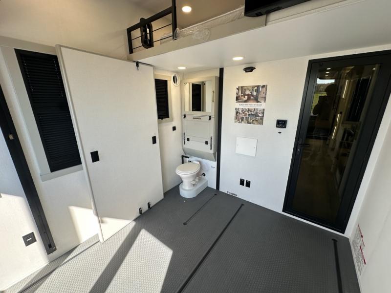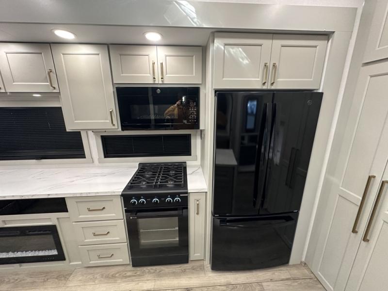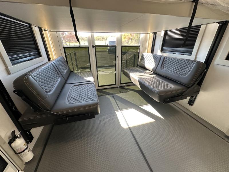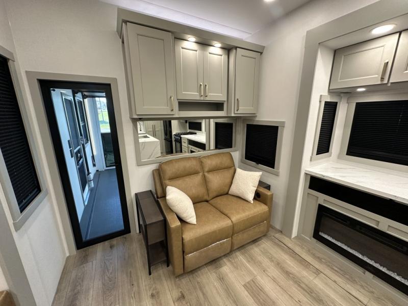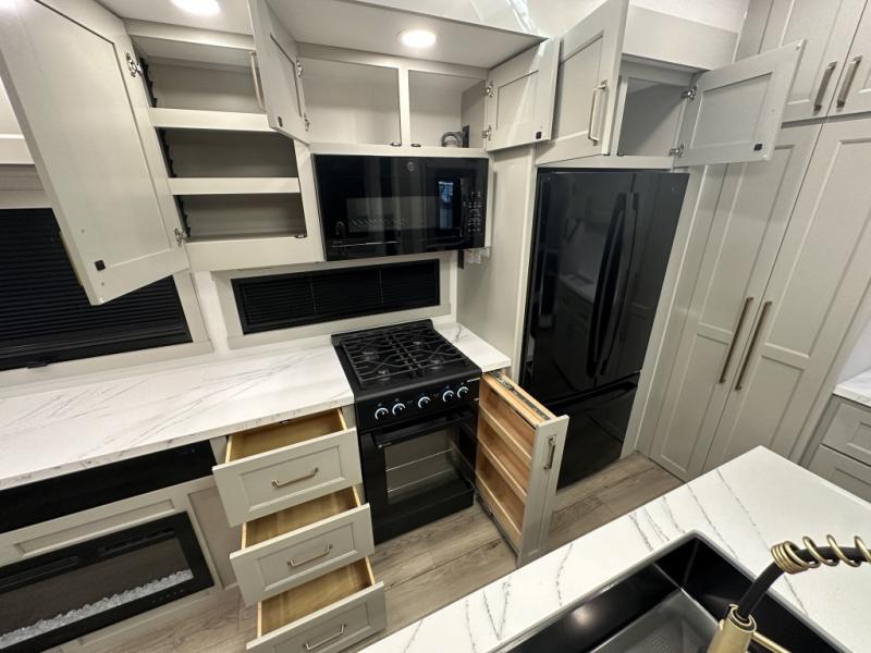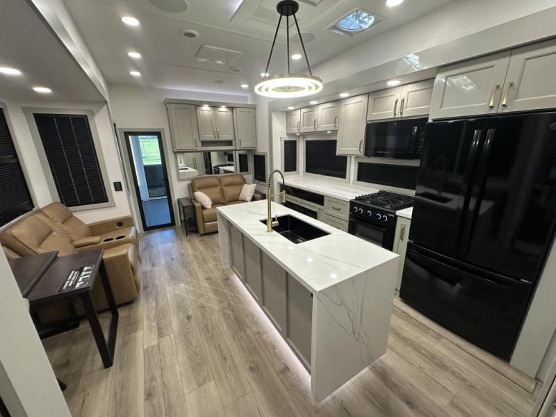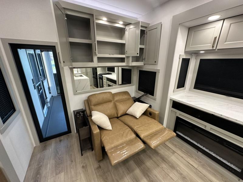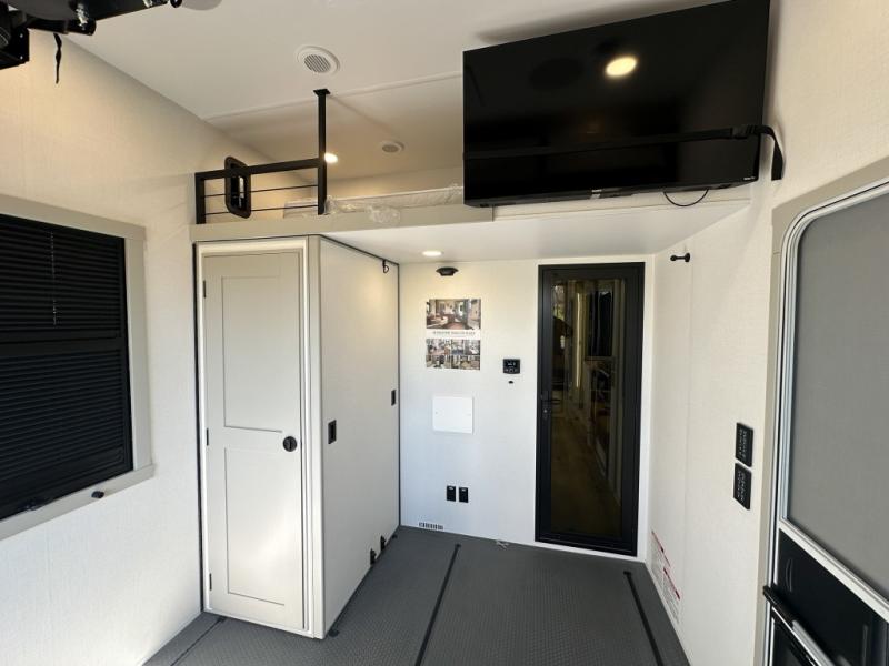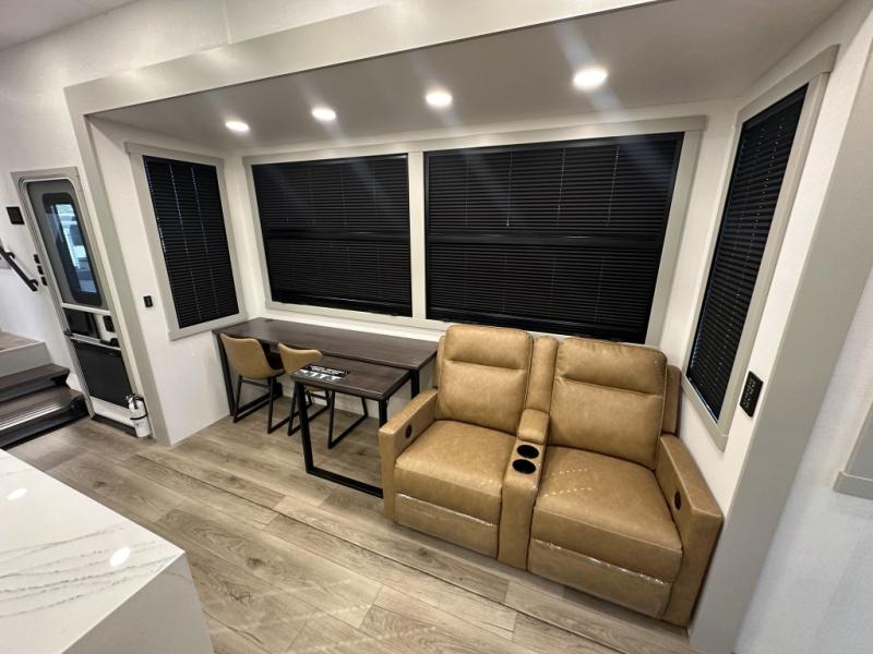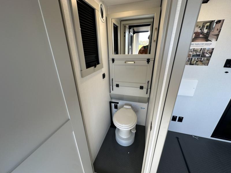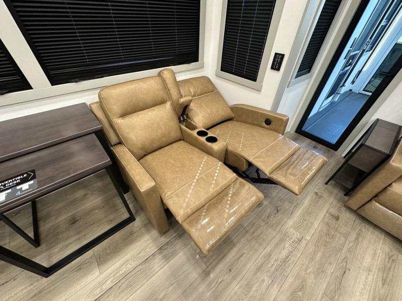 The front bedroom is a serene retreat, featuring a plush king bed, spacious walk-in closet, 32” smart TV, sliding dresser top, and hidden storage for better organization.The bathroom is a haven of convenience, boasting a full bathroom with pull-out linen and trash bin, and a spacious 30 x 42 shower. Perfect for freshening up after a long day of adventure! The kitchen has a pantry featuring adjustable shelving, a hutch, 19 cu. refrigerator, microwave, four-burner cooktop, kitchen island, and convertible dining table/L-desk. Plus, pet bowls for your furry friends! Gather with family and friends in the living room, which features a dual sofa with two recliners, each with heat and massage functions, a televator, and a cozy fireplace. It's the perfect spot to relax and unwind! The garage has a half bathroom, two sofas, and a 43” smart TV, ideal for game days, movie nights, or just relaxing with friends. Outside, enjoy the convenience of a fuel station, three-way pass-thru storage, and LP quick connect. Whether you're an adventure-seeker, or just love to travel in style, this toy hauler has everything you need and more!