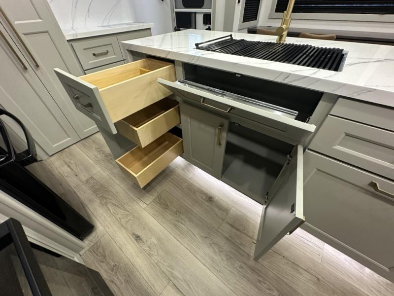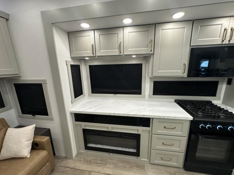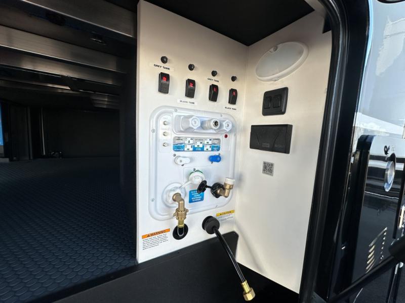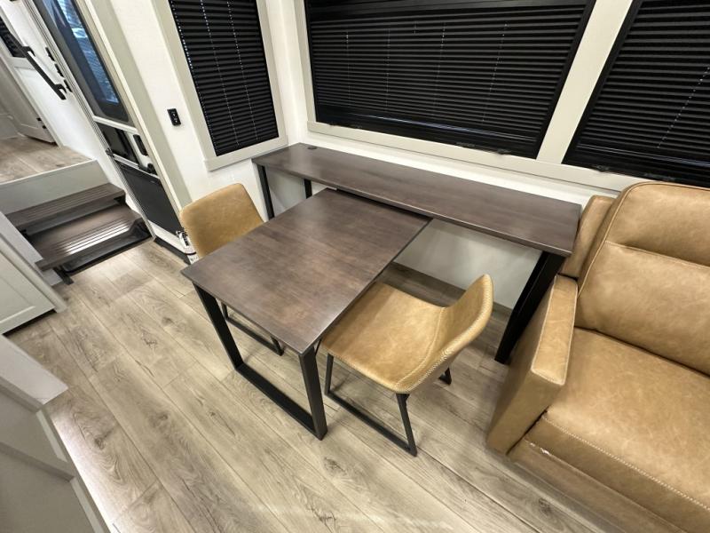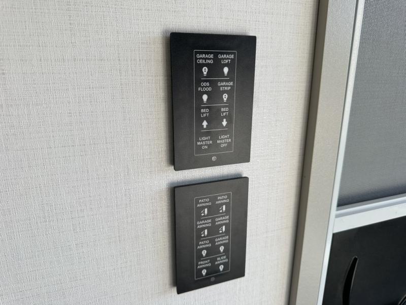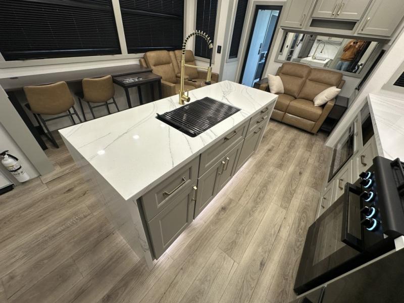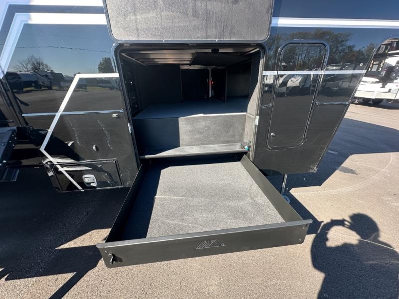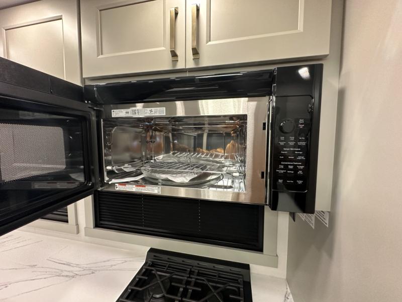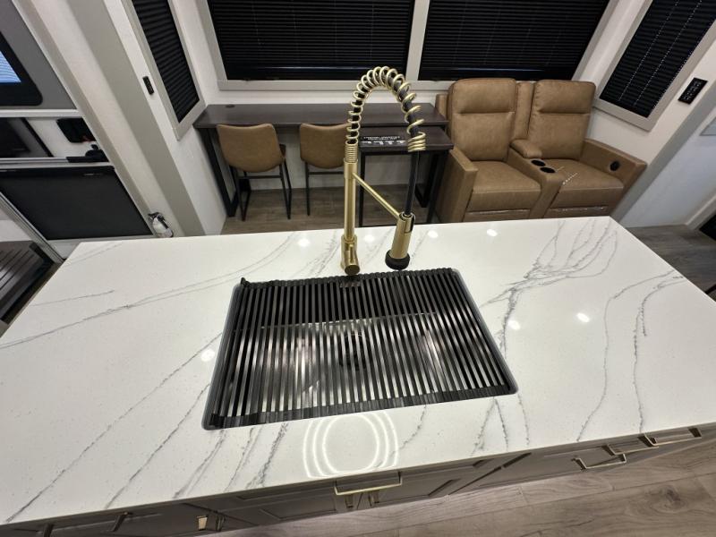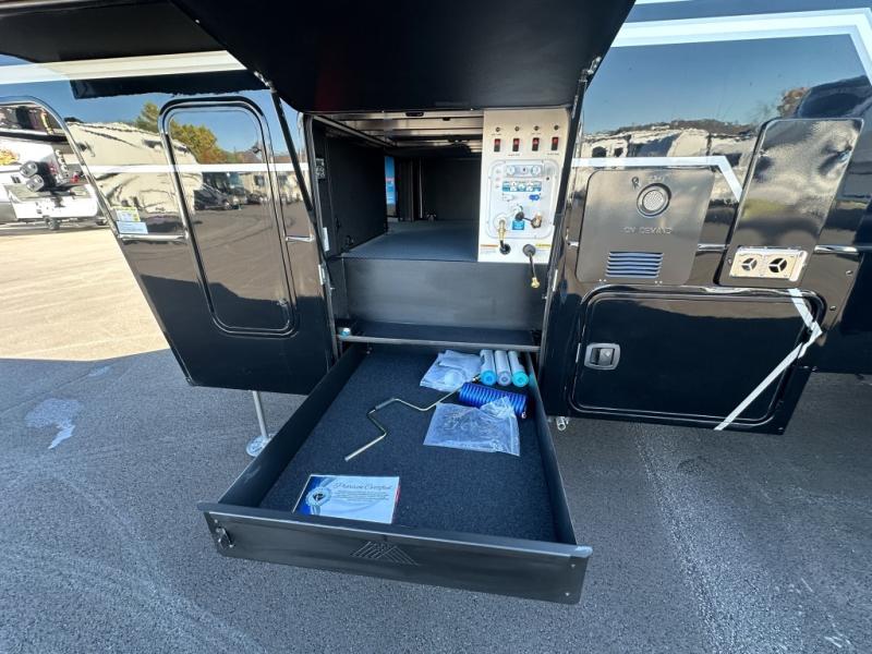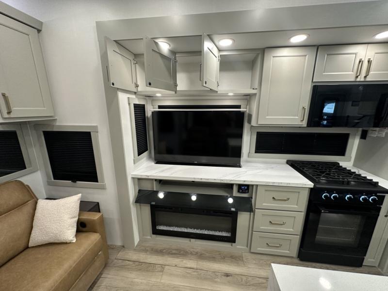 The front bedroom is a serene retreat, featuring a plush king bed, spacious walk-in closet, 32” smart TV, sliding dresser top, and hidden storage for better organization.The bathroom is a haven of convenience, boasting a full bathroom with pull-out linen and trash bin, and a spacious 30 x 42 shower. Perfect for freshening up after a long day of adventure! The kitchen has a pantry featuring adjustable shelving, a hutch, 19 cu. refrigerator, microwave, four-burner cooktop, kitchen island, and convertible dining table/L-desk. Plus, pet bowls for your furry friends! Gather with family and friends in the living room, which features a dual sofa with two recliners, each with heat and massage functions, a televator, and a cozy fireplace. It's the perfect spot to relax and unwind! The garage has a half bathroom, two sofas, and a 43” smart TV, ideal for game days, movie nights, or just relaxing with friends. Outside, enjoy the convenience of a fuel station, three-way pass-thru storage, and LP quick connect. Whether you're an adventure-seeker, or just love to travel in style, this toy hauler has everything you need and more!