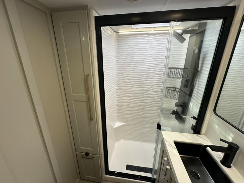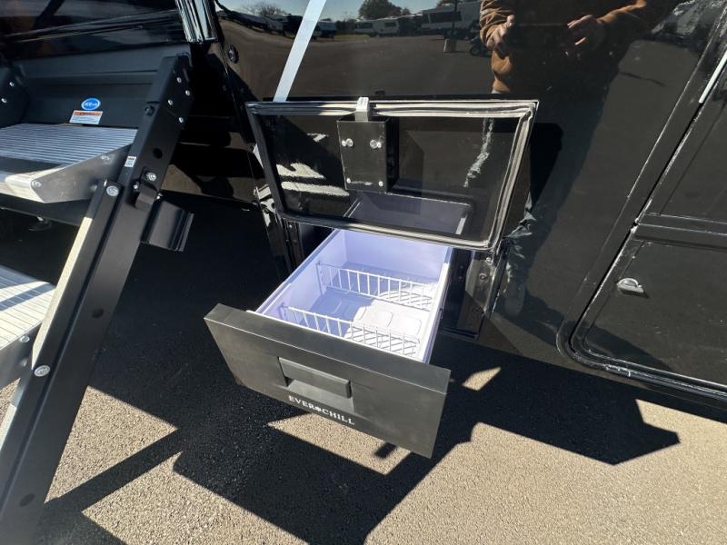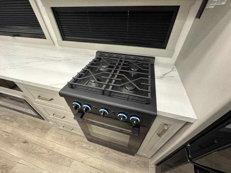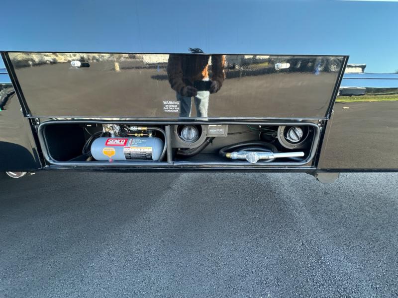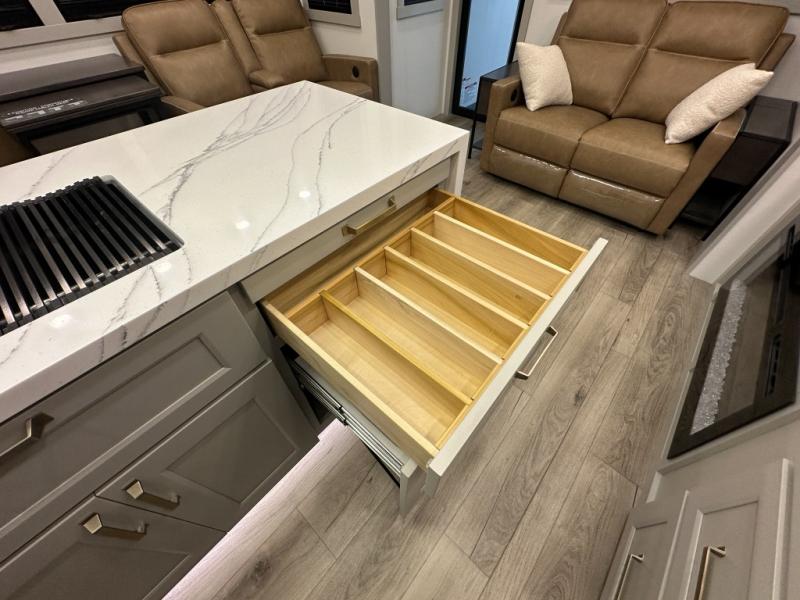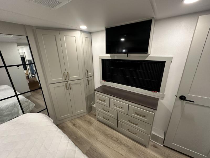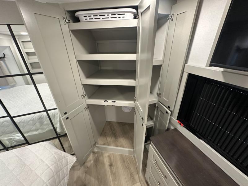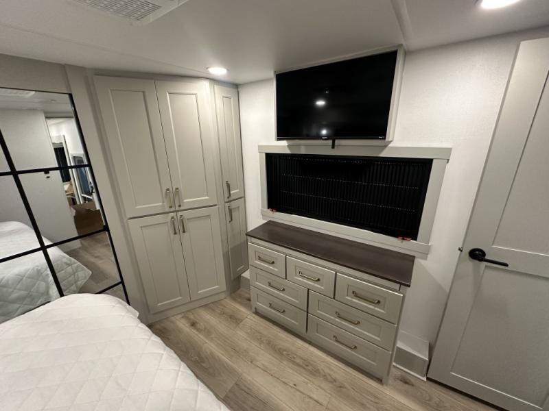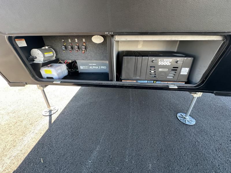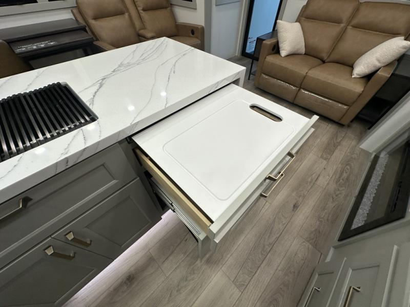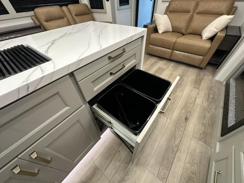 The front bedroom is a serene retreat, featuring a plush king bed, spacious walk-in closet, 32” smart TV, sliding dresser top, and hidden storage for better organization.The bathroom is a haven of convenience, boasting a full bathroom with pull-out linen and trash bin, and a spacious 30 x 42 shower. Perfect for freshening up after a long day of adventure! The kitchen has a pantry featuring adjustable shelving, a hutch, 19 cu. refrigerator, microwave, four-burner cooktop, kitchen island, and convertible dining table/L-desk. Plus, pet bowls for your furry friends! Gather with family and friends in the living room, which features a dual sofa with two recliners, each with heat and massage functions, a televator, and a cozy fireplace. It's the perfect spot to relax and unwind! The garage has a half bathroom, two sofas, and a 43” smart TV, ideal for game days, movie nights, or just relaxing with friends. Outside, enjoy the convenience of a fuel station, three-way pass-thru storage, and LP quick connect. Whether you're an adventure-seeker, or just love to travel in style, this toy hauler has everything you need and more!