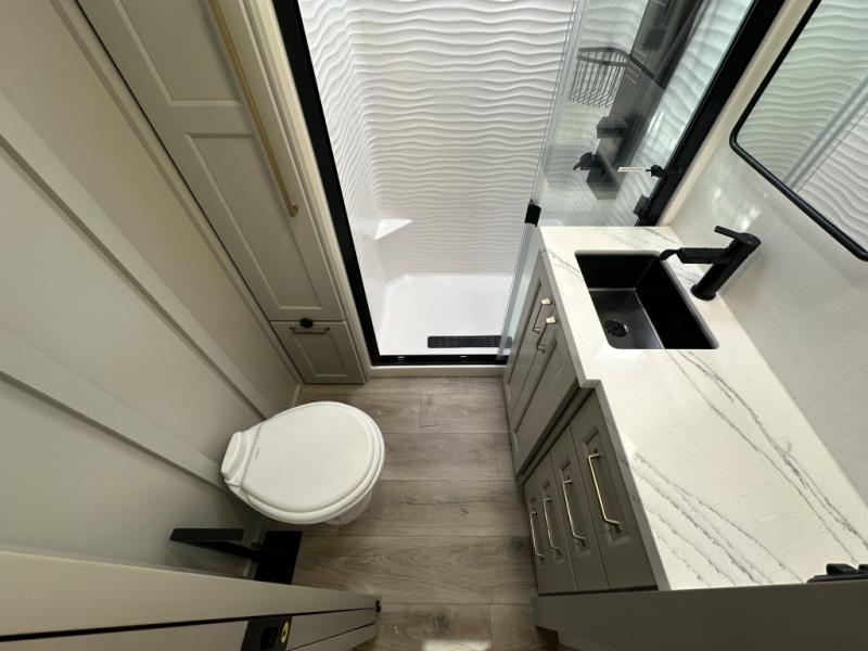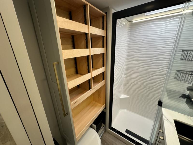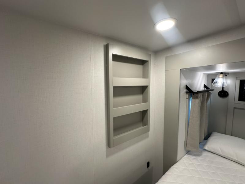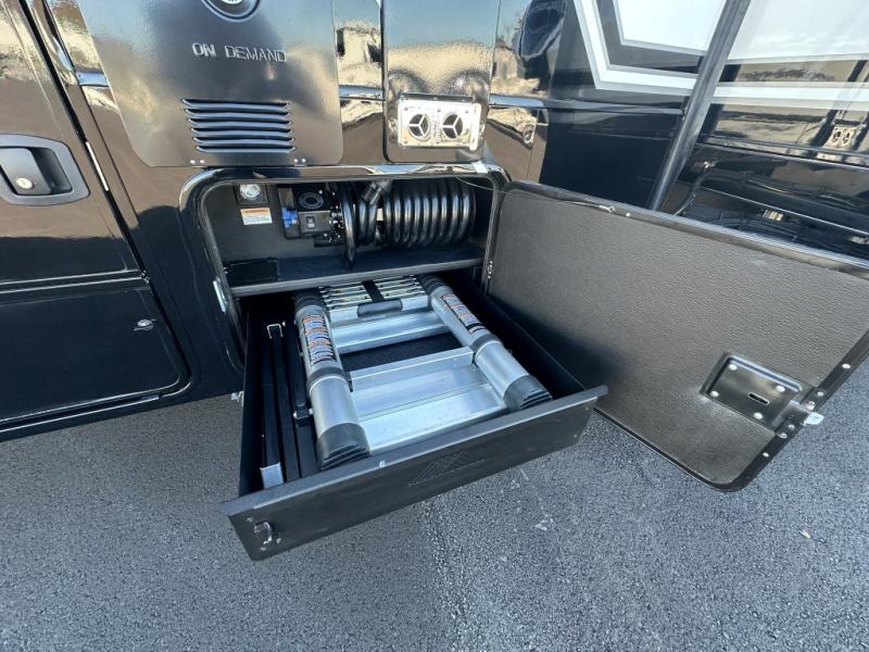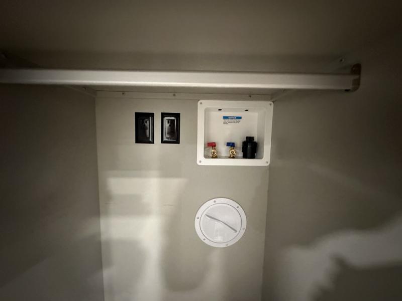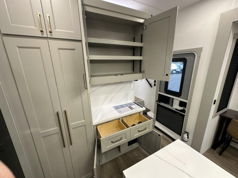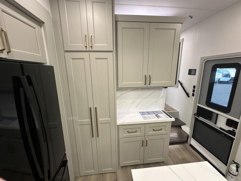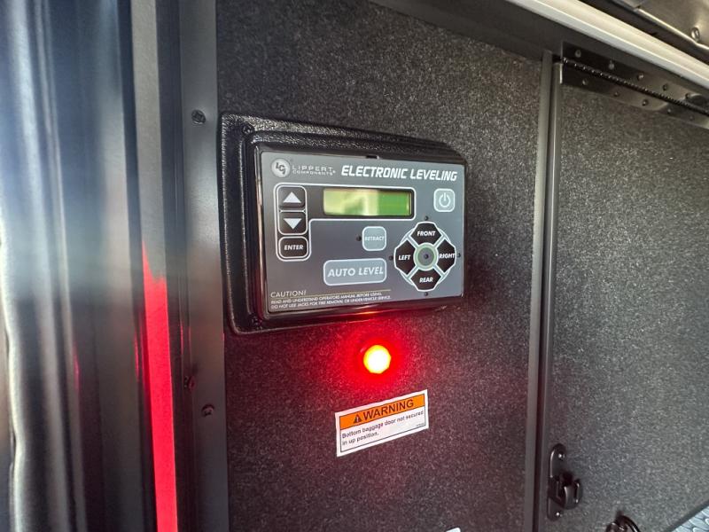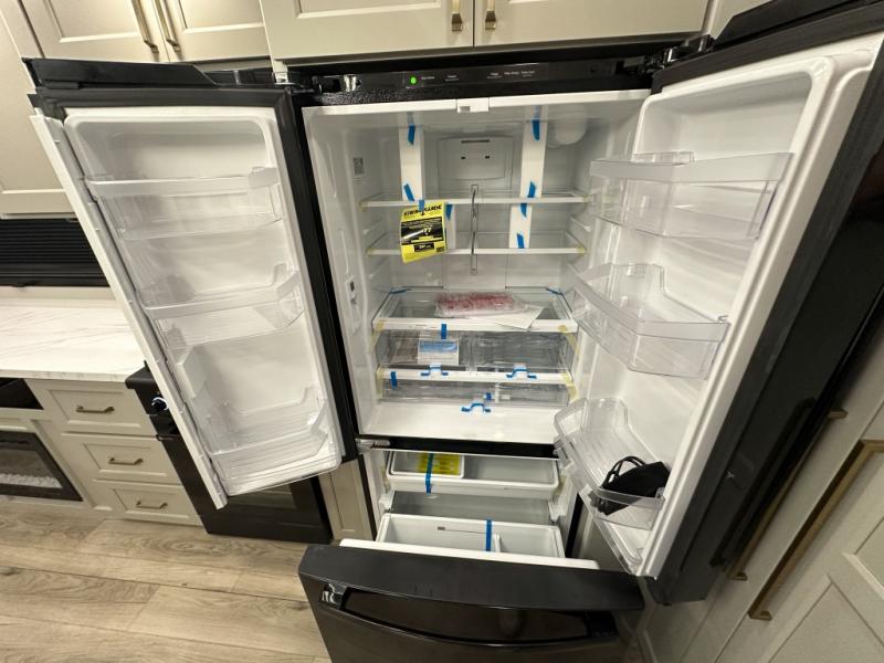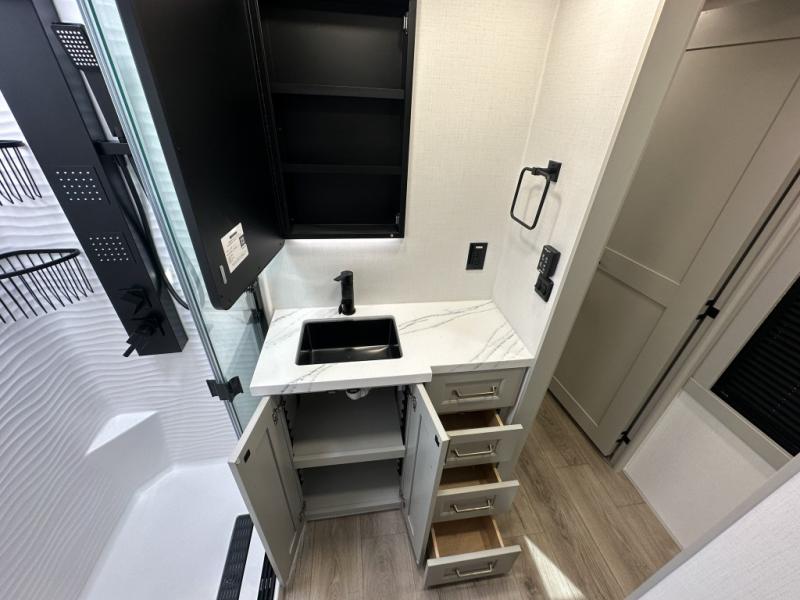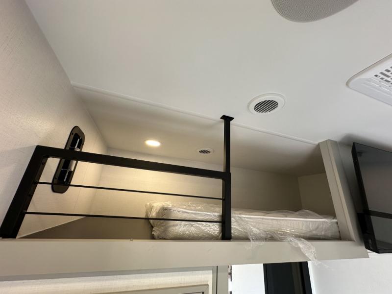 The front bedroom is a serene retreat, featuring a plush king bed, spacious walk-in closet, 32” smart TV, sliding dresser top, and hidden storage for better organization.The bathroom is a haven of convenience, boasting a full bathroom with pull-out linen and trash bin, and a spacious 30 x 42 shower. Perfect for freshening up after a long day of adventure! The kitchen has a pantry featuring adjustable shelving, a hutch, 19 cu. refrigerator, microwave, four-burner cooktop, kitchen island, and convertible dining table/L-desk. Plus, pet bowls for your furry friends! Gather with family and friends in the living room, which features a dual sofa with two recliners, each with heat and massage functions, a televator, and a cozy fireplace. It's the perfect spot to relax and unwind! The garage has a half bathroom, two sofas, and a 43” smart TV, ideal for game days, movie nights, or just relaxing with friends. Outside, enjoy the convenience of a fuel station, three-way pass-thru storage, and LP quick connect. Whether you're an adventure-seeker, or just love to travel in style, this toy hauler has everything you need and more!