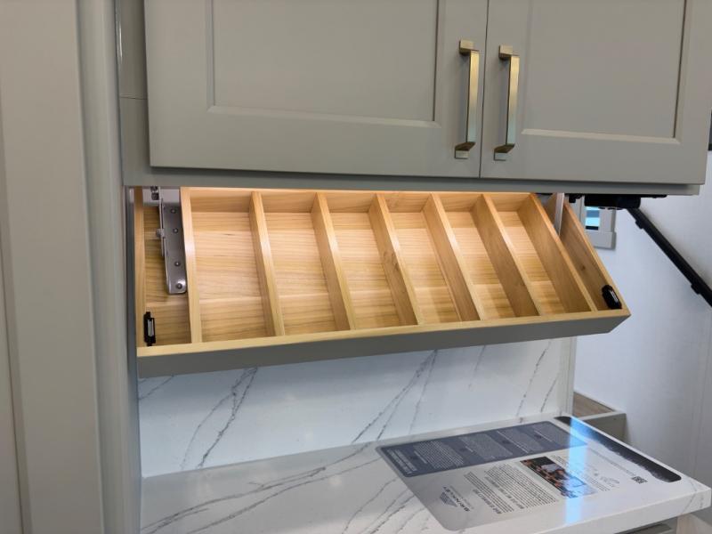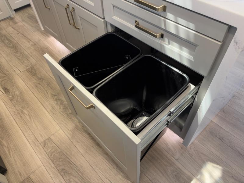 - Full bath with 30” x 42” shower, pull-out linen, and trash bin