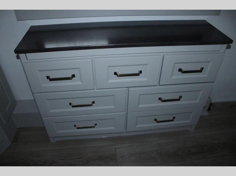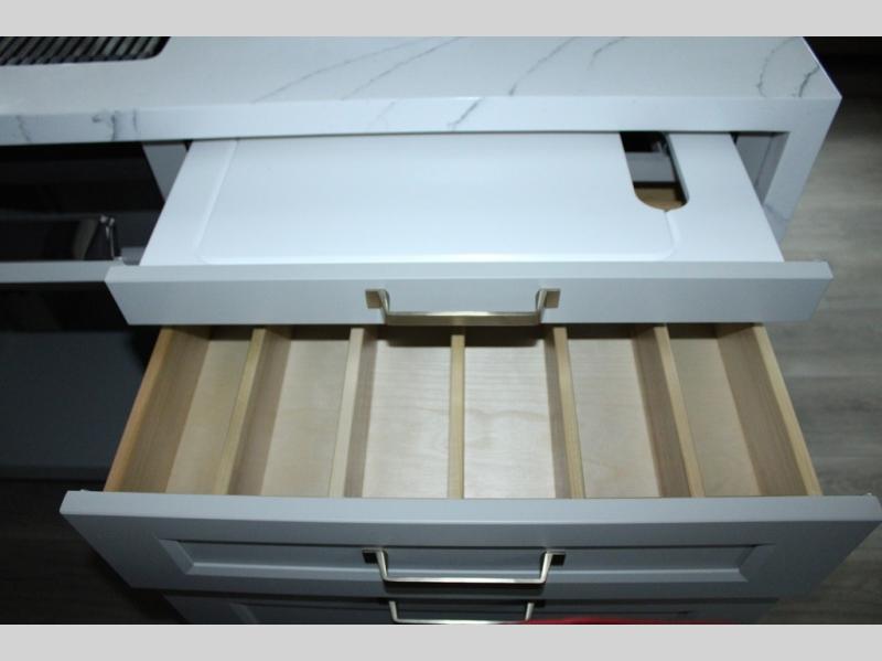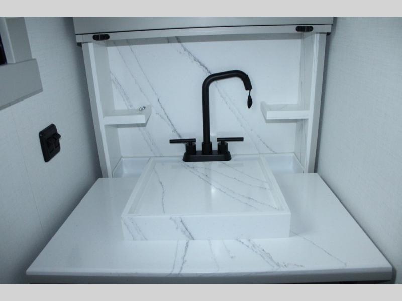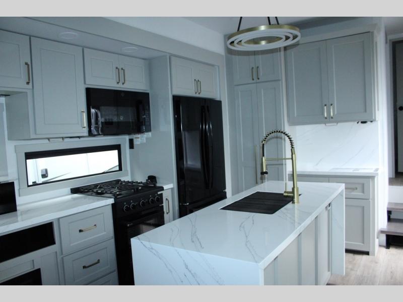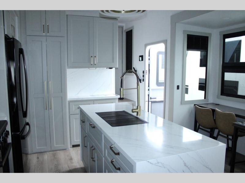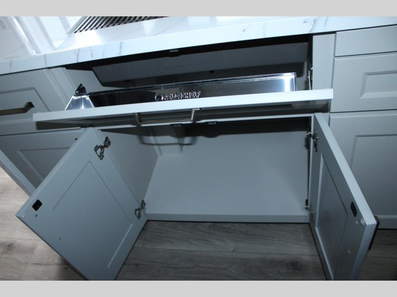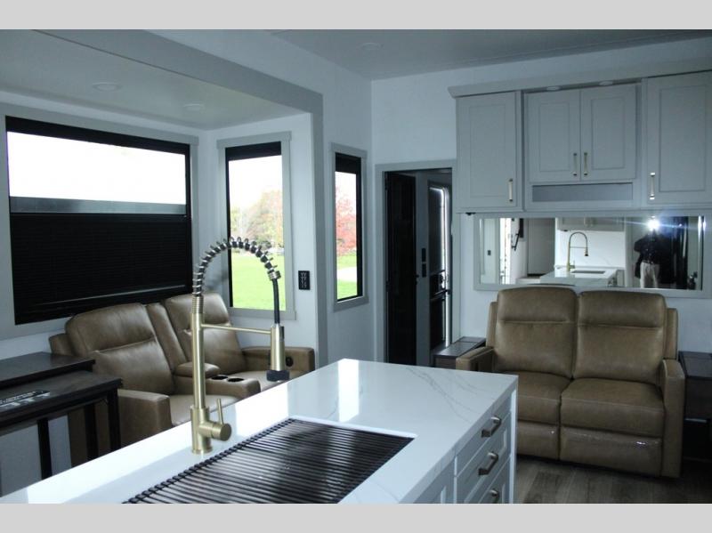 With any Model G toy hauler fifth wheel by Brinkley you will enjoy luxurious amenities, tons of storage space, and innovative features that have been developed and tested in the real world. Durable construction includes an industry leading PDI process, an industry best insulation package, and reinforced and walkable slide roofs. Some of the exterior features you'll find are a 3-way pass-through with a multi-functional flip-up bulkhead wall, under I-beam storage, a MAX-Vision reverse lighting system, and a low-maintenance roof to name a few. A Rockford Fosgate audio system comes standard, along with a OneControl app system that lets you control your fifth wheel's functions right from your mobile device. You will find the solar system with a designated storage area to be ultra convenient, plus there is a FlexPower 5500 with a dual fuel inverter generator for all your power needs. Head inside to find a residential interior with Brinkley's CraftSense wood trim construction, floating entrance steps, integrated window screens and insulated blackout blinds, and residential solid surface countertops plus backsplash. You will also enjoy the neon shower lighting and recessed medicine cabinets in the bath, plus motion activated LED bed lights and dual bedside outlets in the bedroom. Choose a Model G toy hauler fifth wheel to experience all the luxury it has to offer!