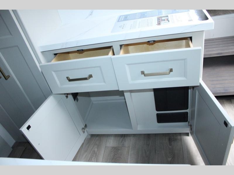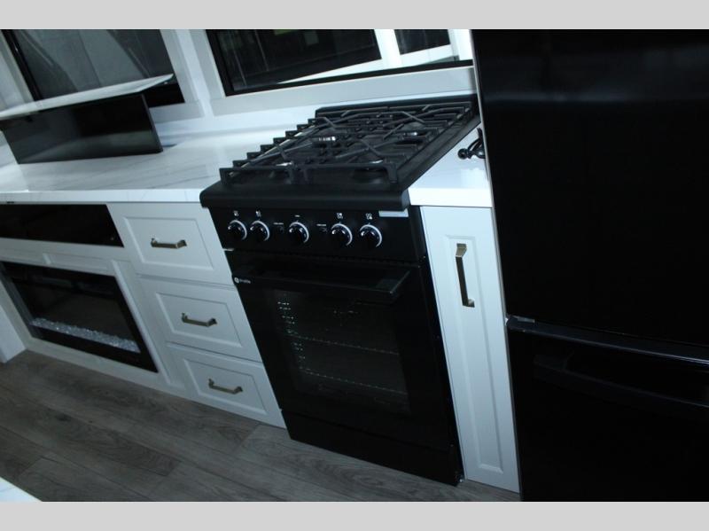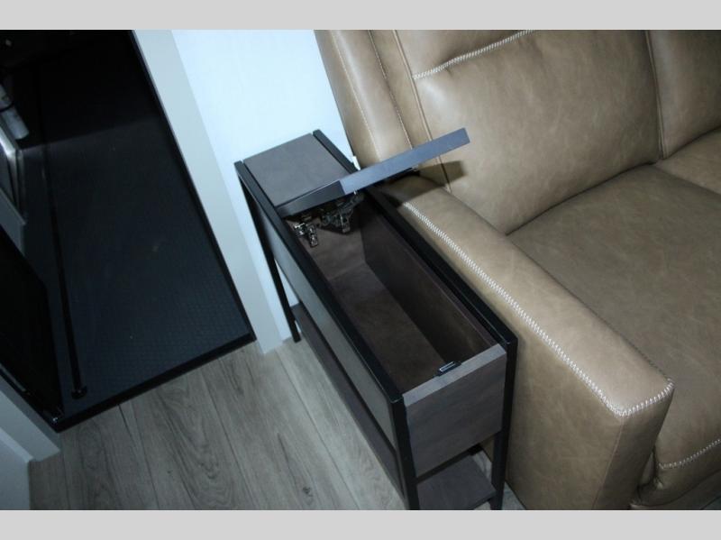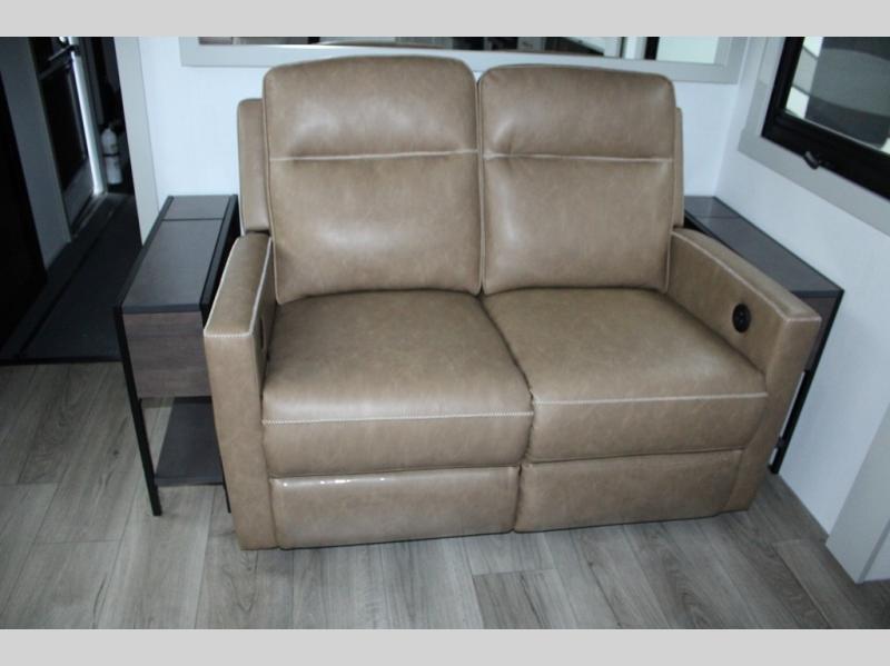 The front bedroom is a serene retreat, featuring a plush king bed, spacious walk-in closet, 32” smart TV, sliding dresser top, and hidden storage for better organization.The bathroom is a haven of convenience, boasting a full bathroom with pull-out linen and trash bin, and a spacious 30 x 42 shower. Perfect for freshening up after a long day of adventure! The kitchen has a pantry featuring adjustable shelving, a hutch, 19 cu. refrigerator, microwave, four-burner cooktop, kitchen island, and convertible dining table/L-desk. Plus, pet bowls for your furry friends! Gather with family and friends in the living room, which features a dual sofa with two recliners, each with heat and massage functions, a televator, and a cozy fireplace. It's the perfect spot to relax and unwind! The garage has a half bathroom, two sofas, and a 43” smart TV, ideal for game days, movie nights, or just relaxing with friends. Outside, enjoy the convenience of a fuel station, three-way pass-thru storage, and LP quick connect. Whether you're an adventure-seeker, or just love to travel in style, this toy hauler has everything you need and more!