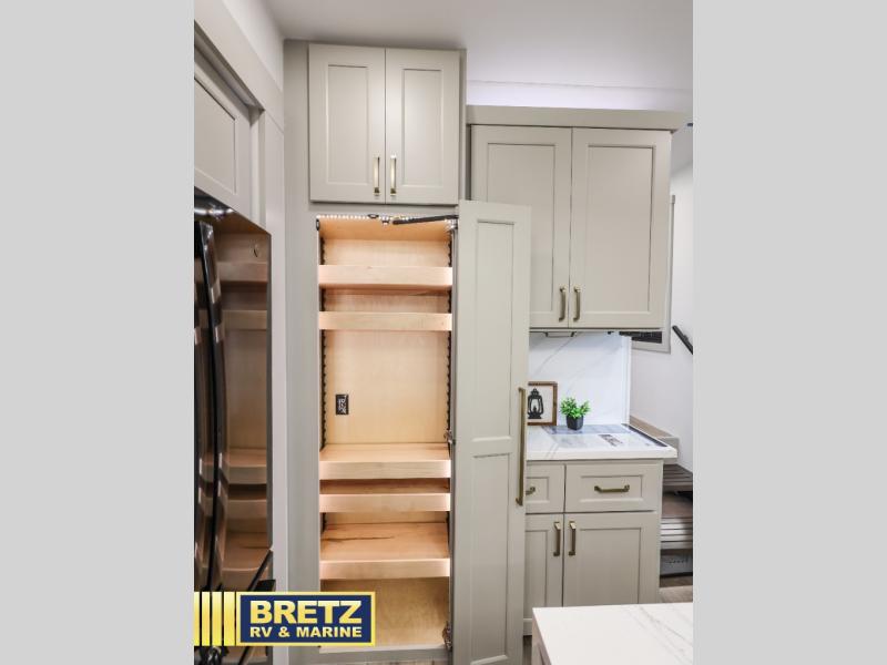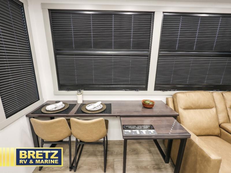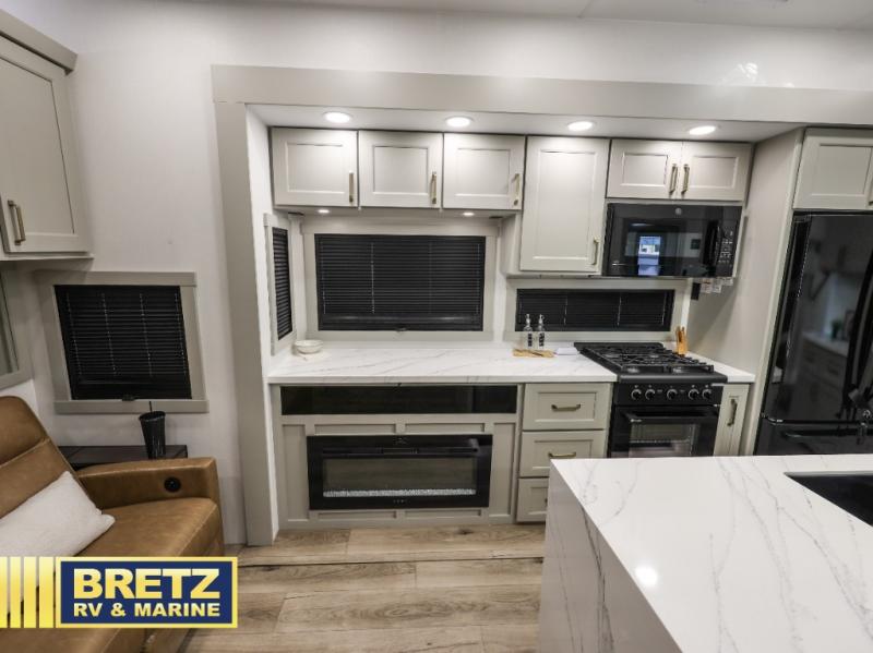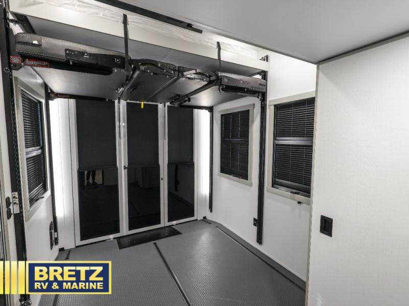 The front bedroom is a serene retreat, featuring a plush king bed, spacious walk-in closet, 32” smart TV, sliding dresser top, and hidden storage for better organization.The bathroom is a haven of convenience, boasting a full bathroom with pull-out linen and trash bin, and a spacious 30 x 42 shower. Perfect for freshening up after a long day of adventure! The kitchen has a pantry featuring adjustable shelving, a hutch, 19 cu. refrigerator, microwave, four-burner cooktop, kitchen island, and convertible dining table/L-desk. Plus, pet bowls for your furry friends! Gather with family and friends in the living room, which features a dual sofa with two recliners, each with heat and massage functions, a televator, and a cozy fireplace. It's the perfect spot to relax and unwind! The garage has a half bathroom, two sofas, and a 43” smart TV, ideal for game days, movie nights, or just relaxing with friends. Outside, enjoy the convenience of a fuel station, three-way pass-thru storage, and LP quick connect. Whether you're an adventure-seeker, or just love to travel in style, this toy hauler has everything you need and more!