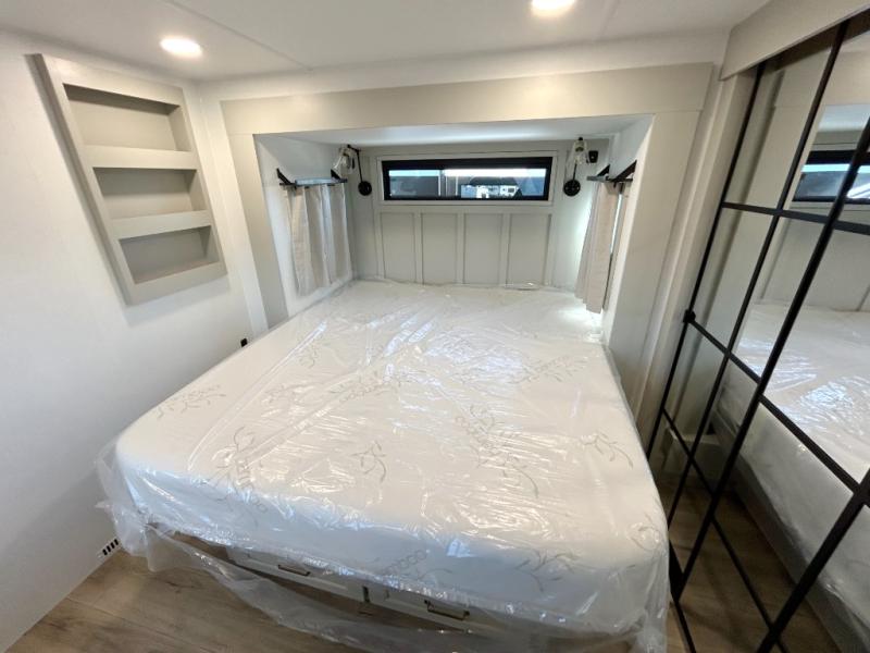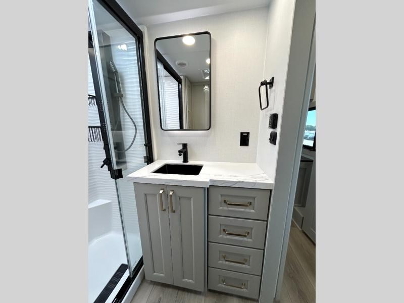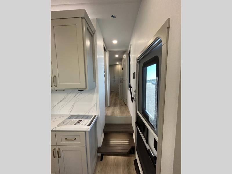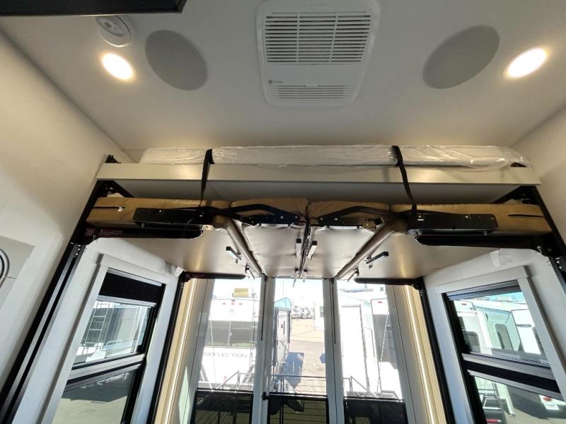 With any Model G toy hauler fifth wheel by Brinkley you will enjoy luxurious amenities, tons of storage space, and innovative features that have been developed and tested in the real world. Durable construction includes an industry leading PDI process, an industry best insulation package, and reinforced and walkable slide roofs. Some of the exterior features you'll find are a 3-way pass-through with a multi-functional flip-up bulkhead wall, under I-beam storage, a MAX-Vision reverse lighting system, and a low-maintenance roof to name a few. A Rockford Fosgate audio system comes standard, along with a OneControl app system that lets you control your fifth wheel's functions right from your mobile device. You will find the solar system with a designated storage area to be ultra convenient, plus there is a FlexPower 5500 with a dual fuel inverter generator for all your power needs. Head inside to find a residential interior with Brinkley's CraftSense wood trim construction, floating entrance steps, integrated window screens and insulated blackout blinds, and residential solid surface countertops plus backsplash. You will also enjoy the neon shower lighting and recessed medicine cabinets in the bath, plus motion activated LED bed lights and dual bedside outlets in the bedroom. Choose a Model G toy hauler fifth wheel to experience all the luxury it has to offer!