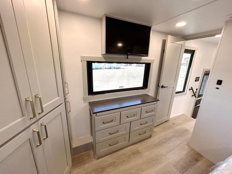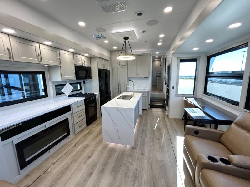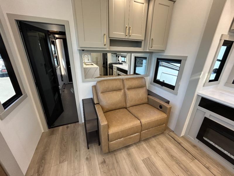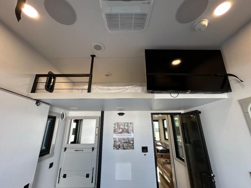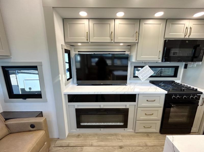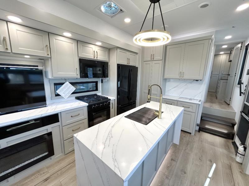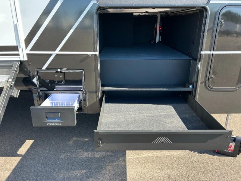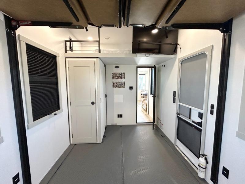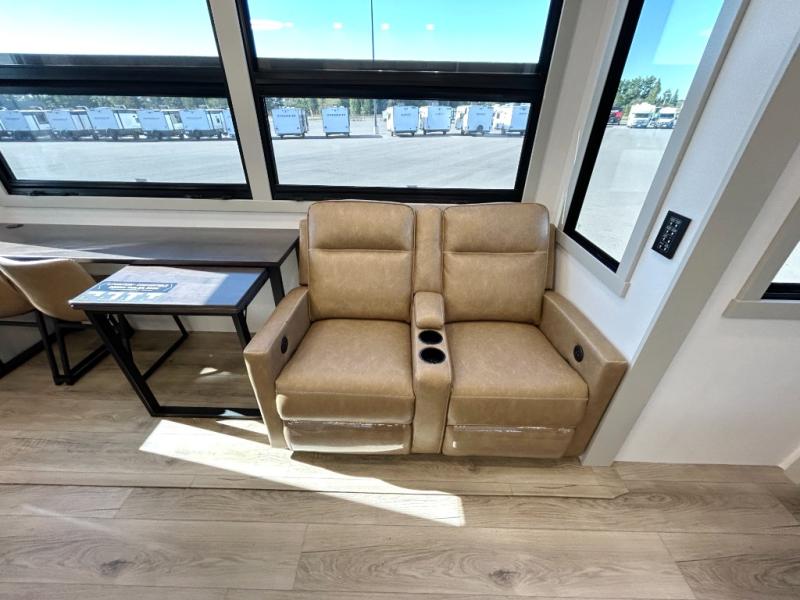 The front bedroom is a serene retreat, featuring a plush king bed, spacious walk-in closet, 32” smart TV, sliding dresser top, and hidden storage for better organization.The bathroom is a haven of convenience, boasting a full bathroom with pull-out linen and trash bin, and a spacious 30 x 42 shower. Perfect for freshening up after a long day of adventure! The kitchen has a pantry featuring adjustable shelving, a hutch, 19 cu. refrigerator, microwave, four-burner cooktop, kitchen island, and convertible dining table/L-desk. Plus, pet bowls for your furry friends! Gather with family and friends in the living room, which features a dual sofa with two recliners, each with heat and massage functions, a televator, and a cozy fireplace. It's the perfect spot to relax and unwind! The garage has a half bathroom, two sofas, and a 43” smart TV, ideal for game days, movie nights, or just relaxing with friends. Outside, enjoy the convenience of a fuel station, three-way pass-thru storage, and LP quick connect. Whether you're an adventure-seeker, or just love to travel in style, this toy hauler has everything you need and more!
